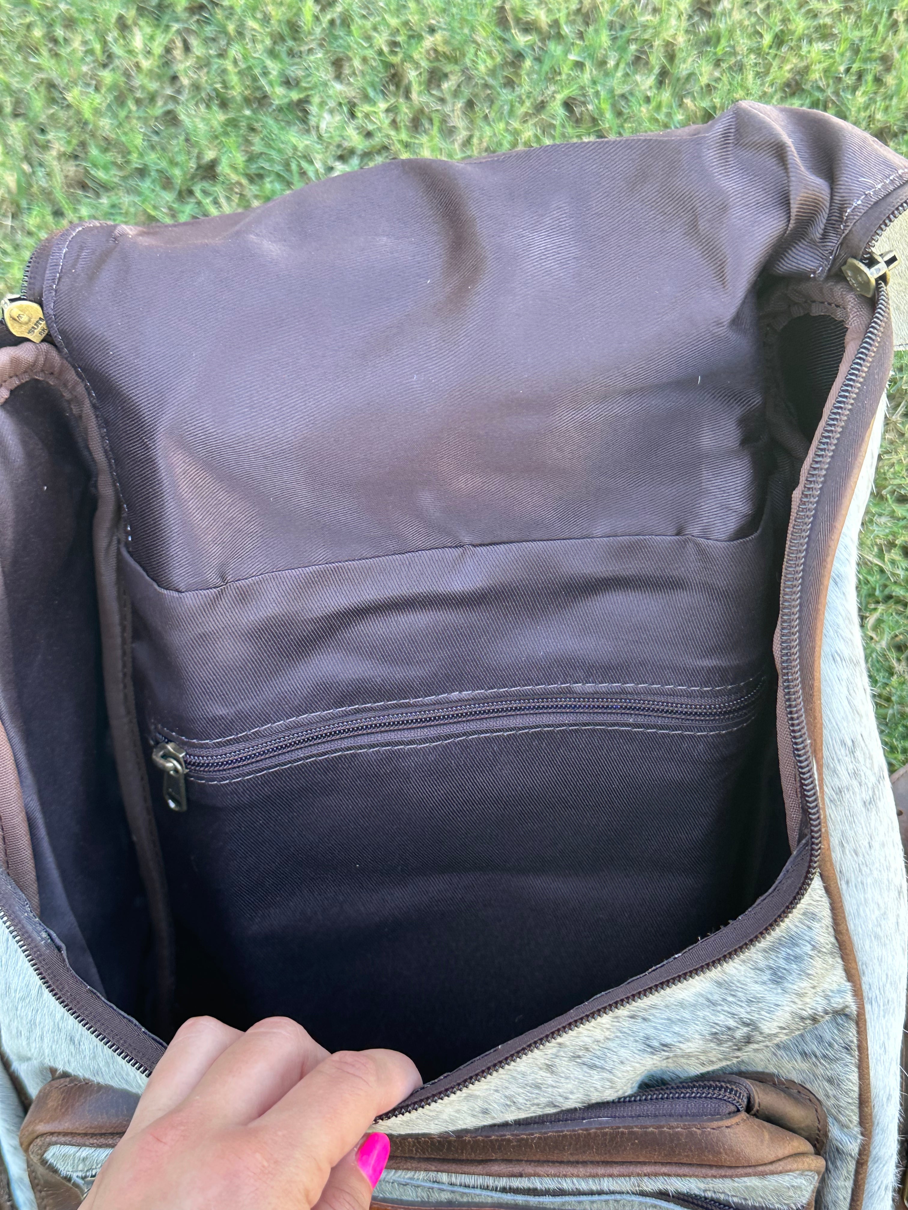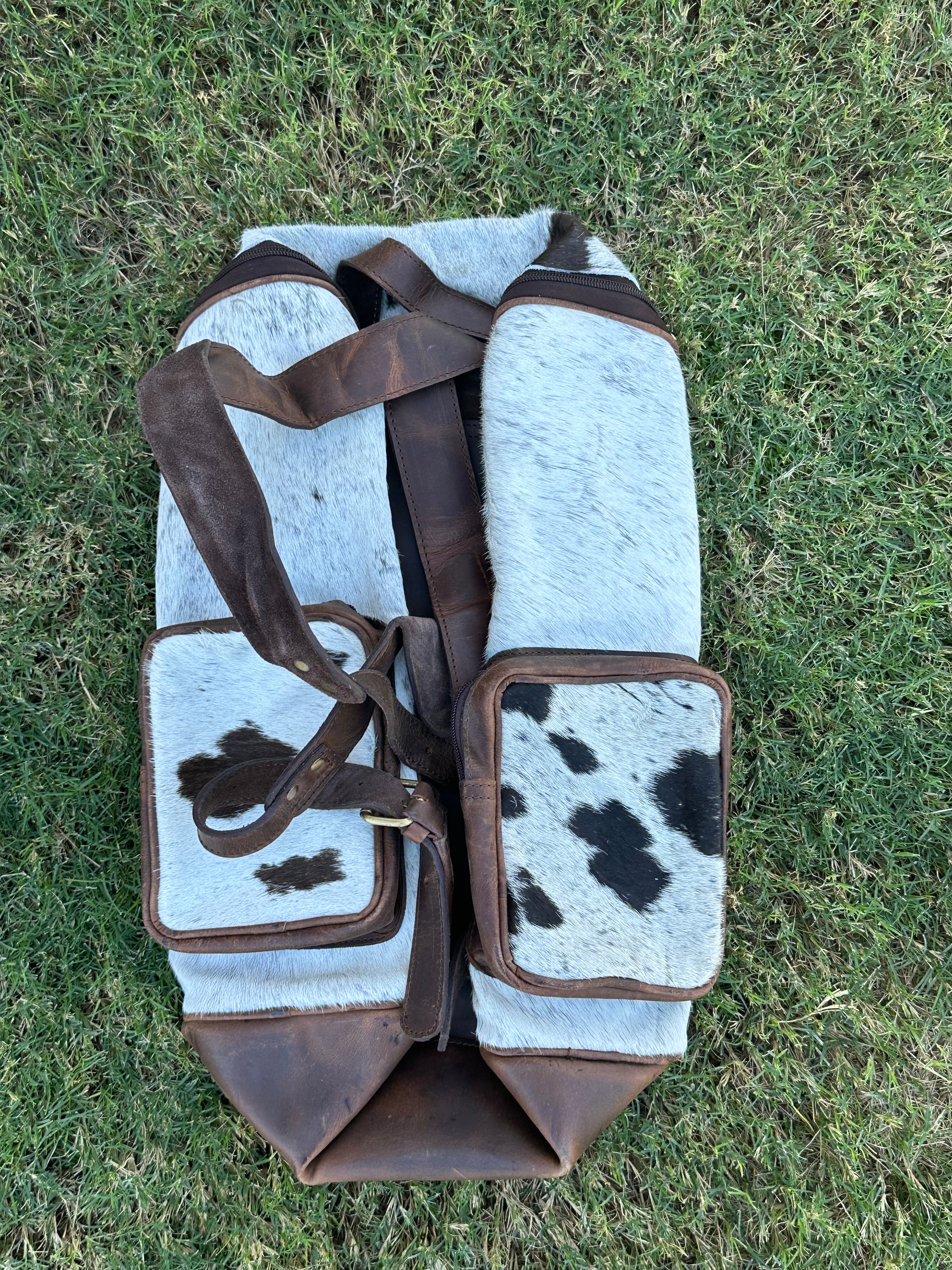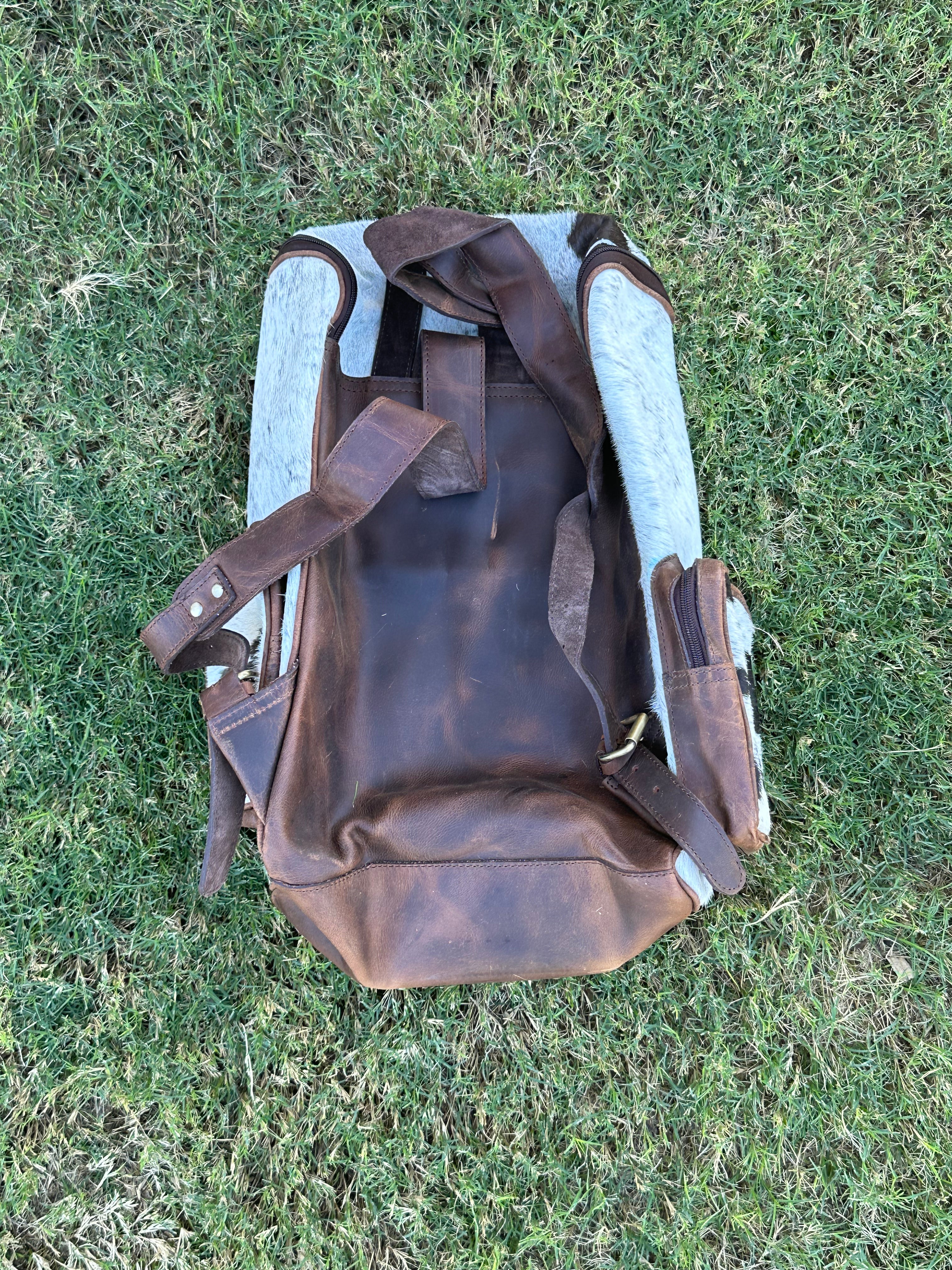 Genuine Leather Cowhide Back Pack/ Diaper Bag. It measures 14 3/4 inches wide and 18 inches in depth. Strap measures 27 inches long while the handles measure 21 1/2 inches long. Many pockets