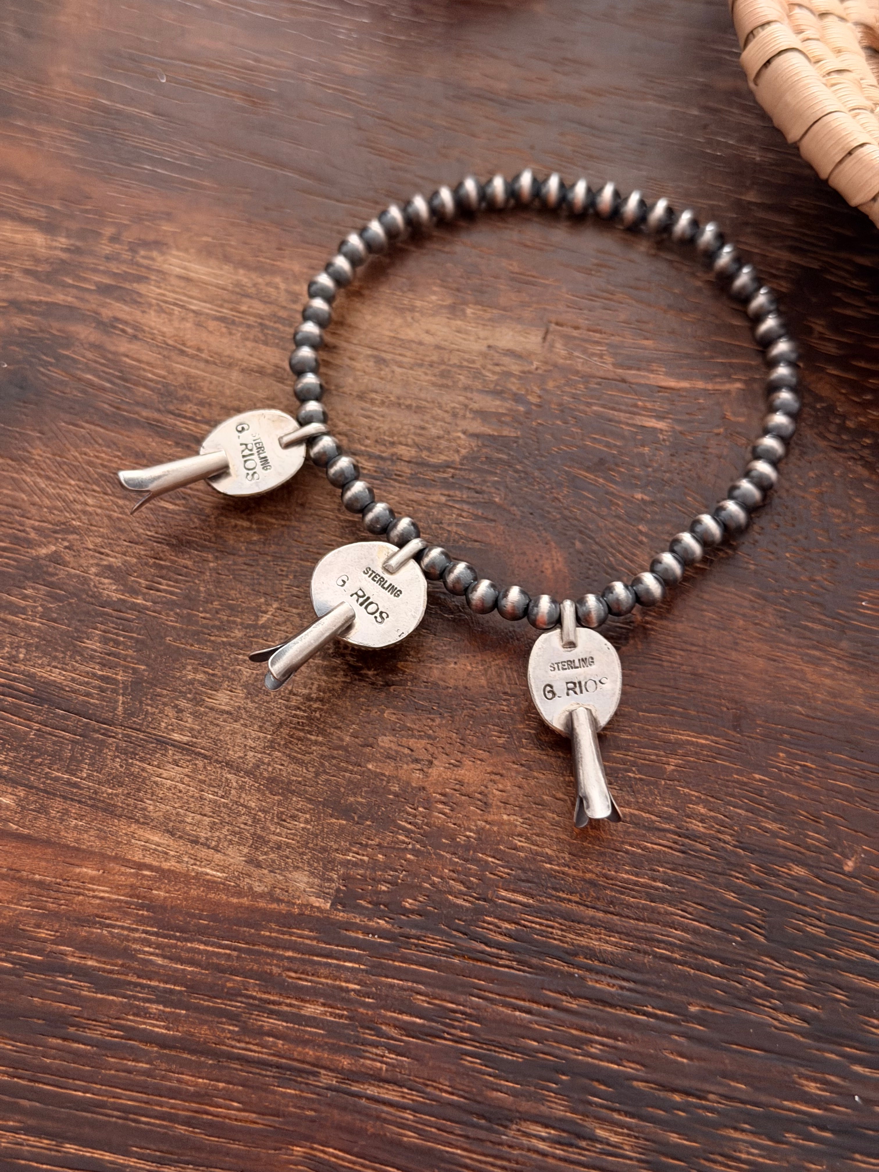 George Rios Multi Stone & Sterling Silver Hand Strung Pearl Beaded Stretch Bracelet. It measures 6 1/2 inches long.