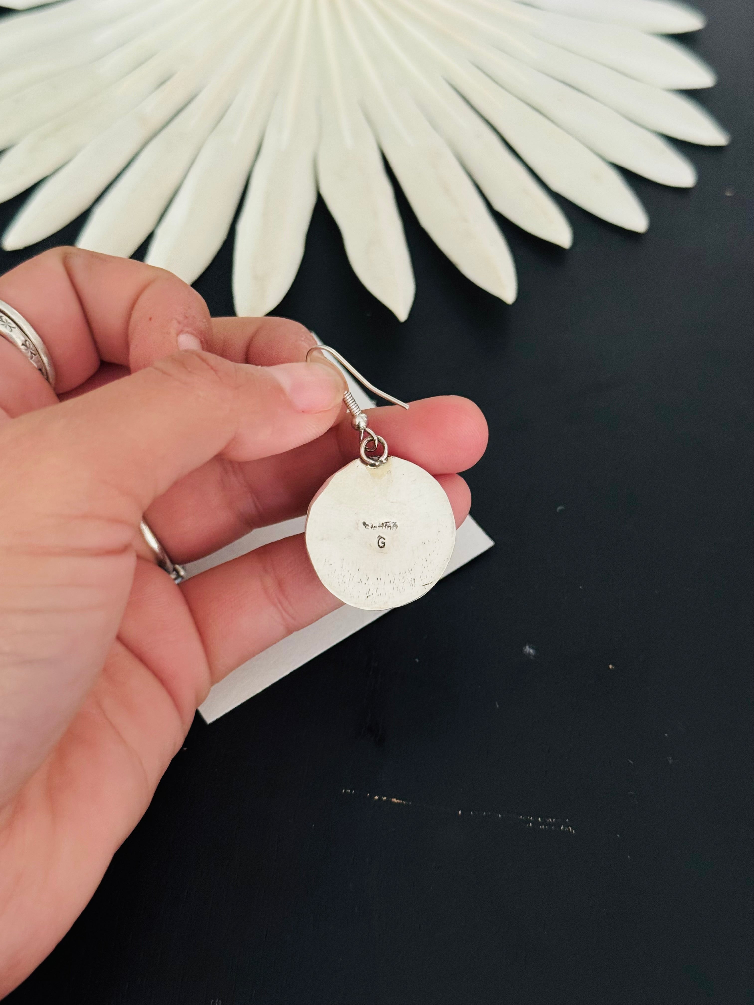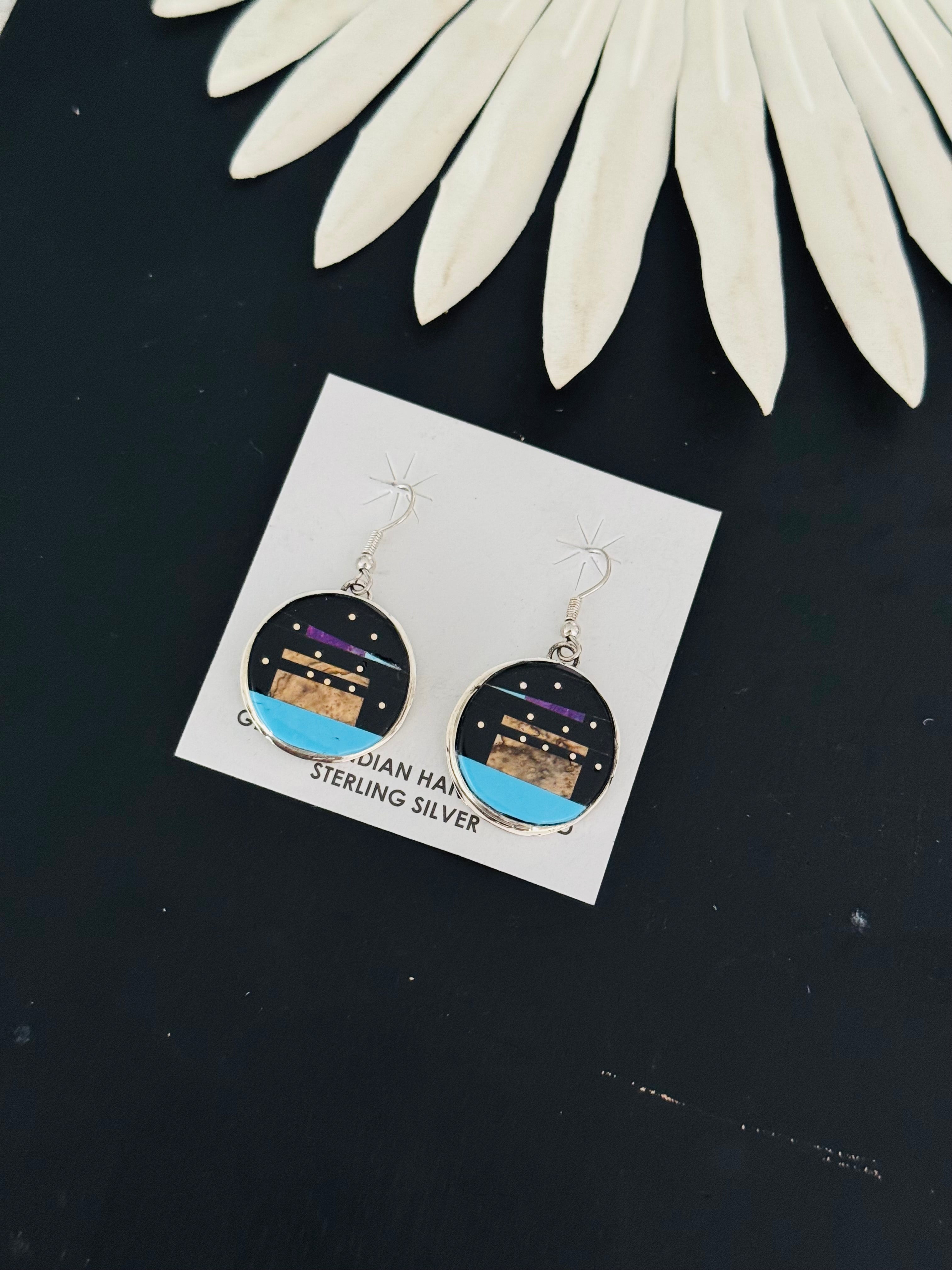 Gilbert Smith Multi Stone & Sterling Silver Inlay Dangle Earrings. They measure 1 3/4 inches long and 1 inch wide. Signed by the artist and stamped sterling silver.