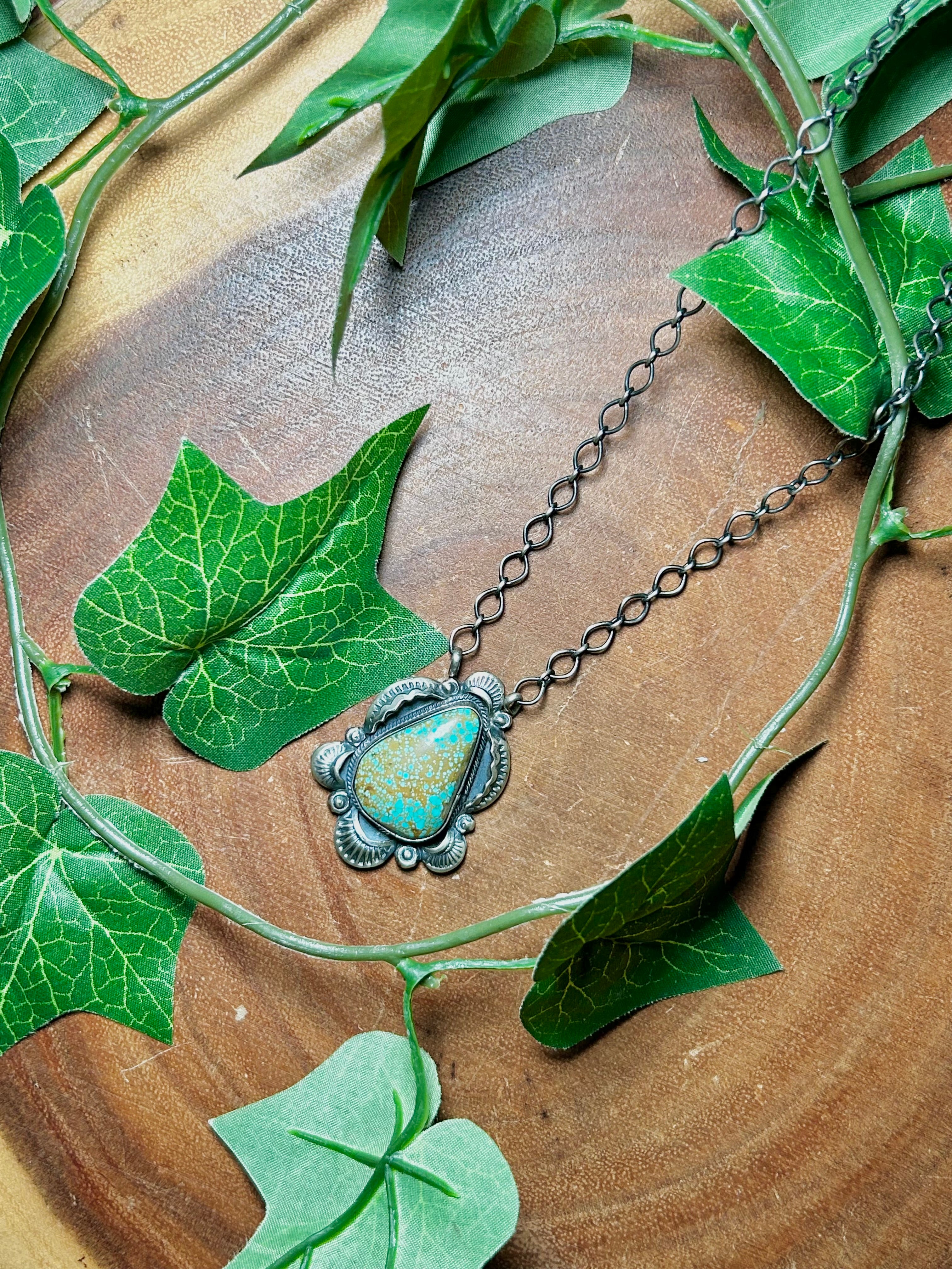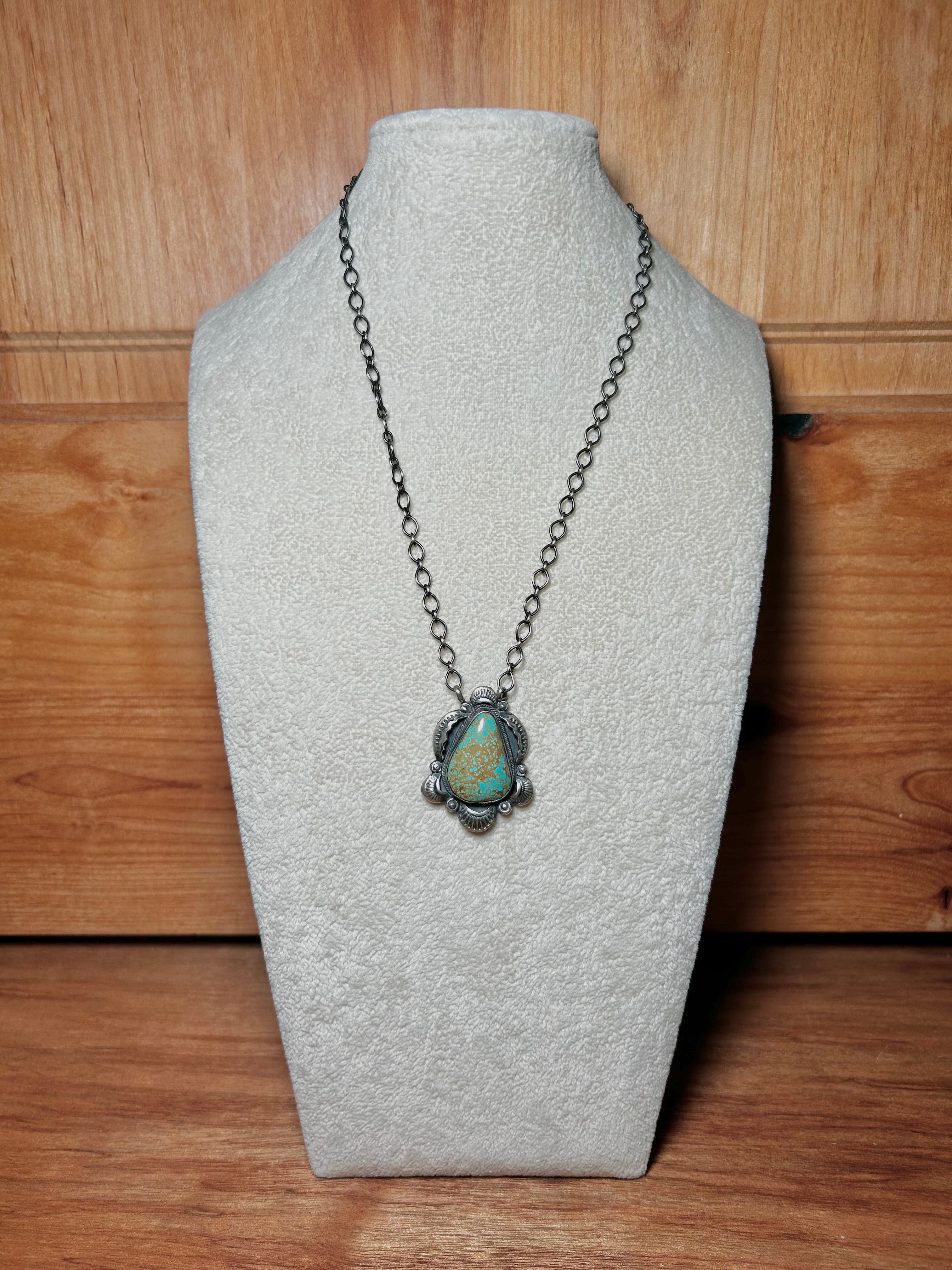 Gilbert Tom #8 Turquoise & Sterling Silver Necklace. It measures 21 3/4 inches long with hang while the chain by itself measures 18 1/2 inches long. Signed by the artist and stamped sterling silver.