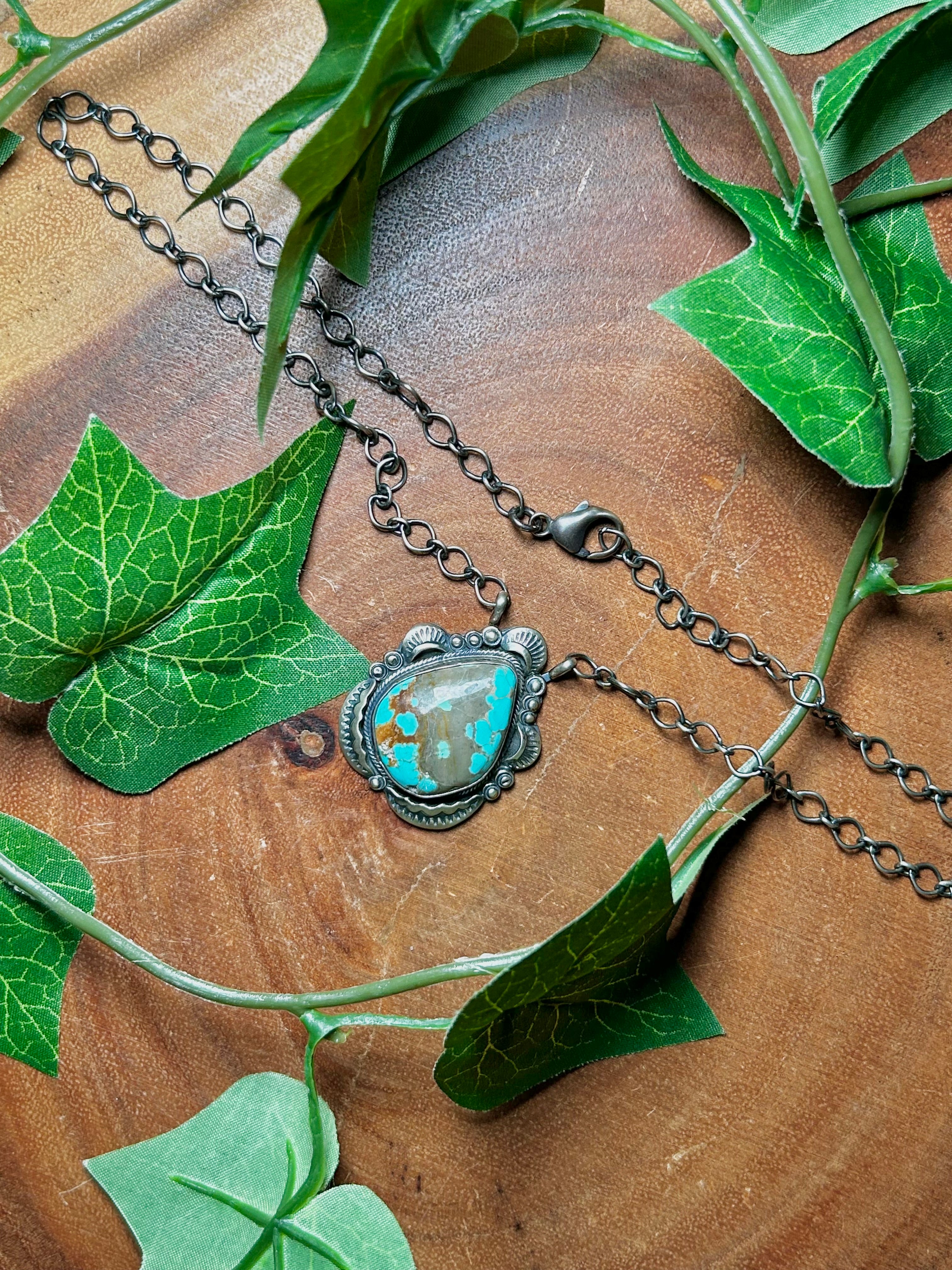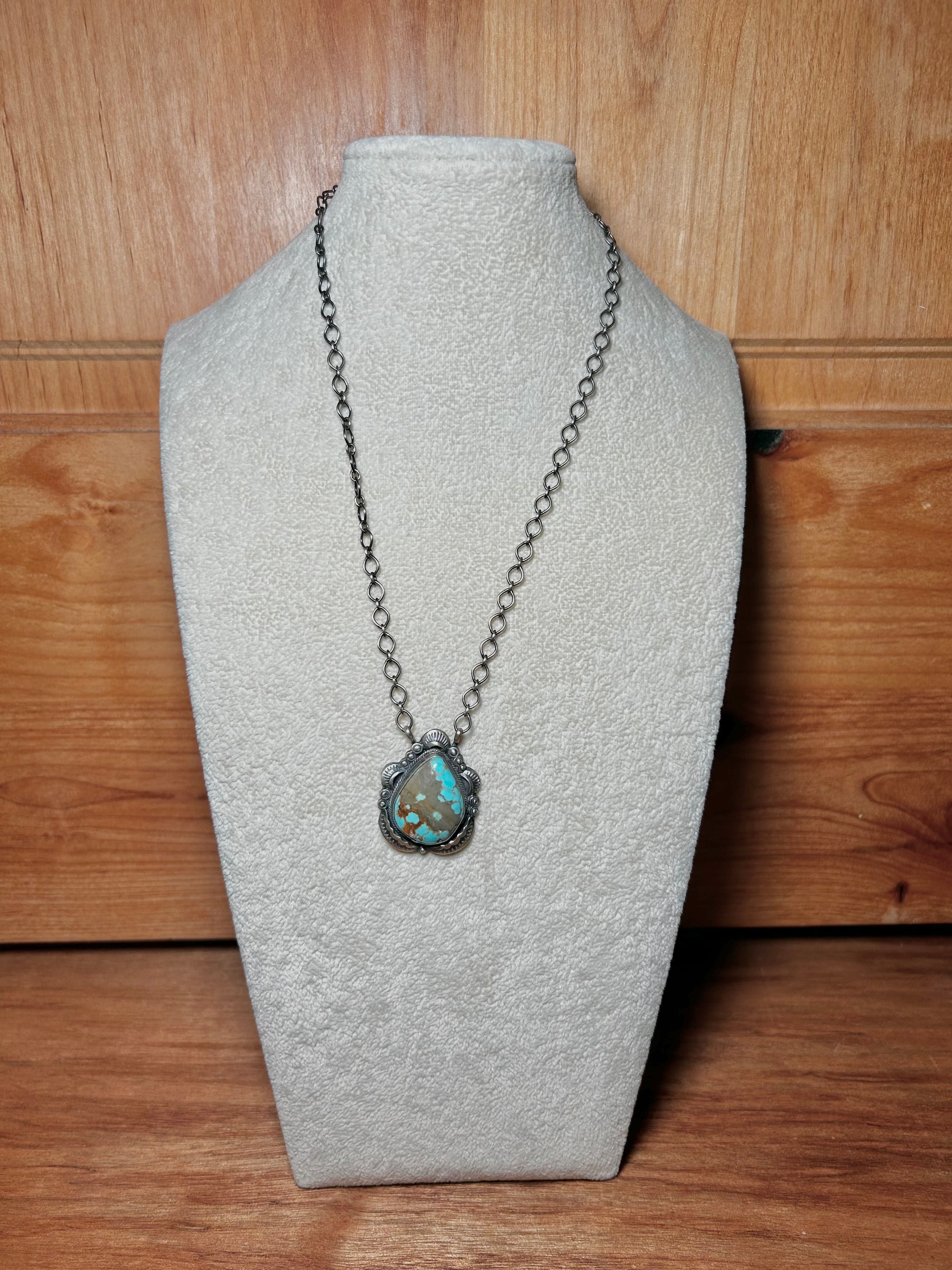 Gilbert Tom #8 Turquoise & Sterling Silver Necklace. It measures 21 1/4 inches long with hang while the chain by itself measures 18 1/2 inches long. Signed by the artist and stamped sterling silver.