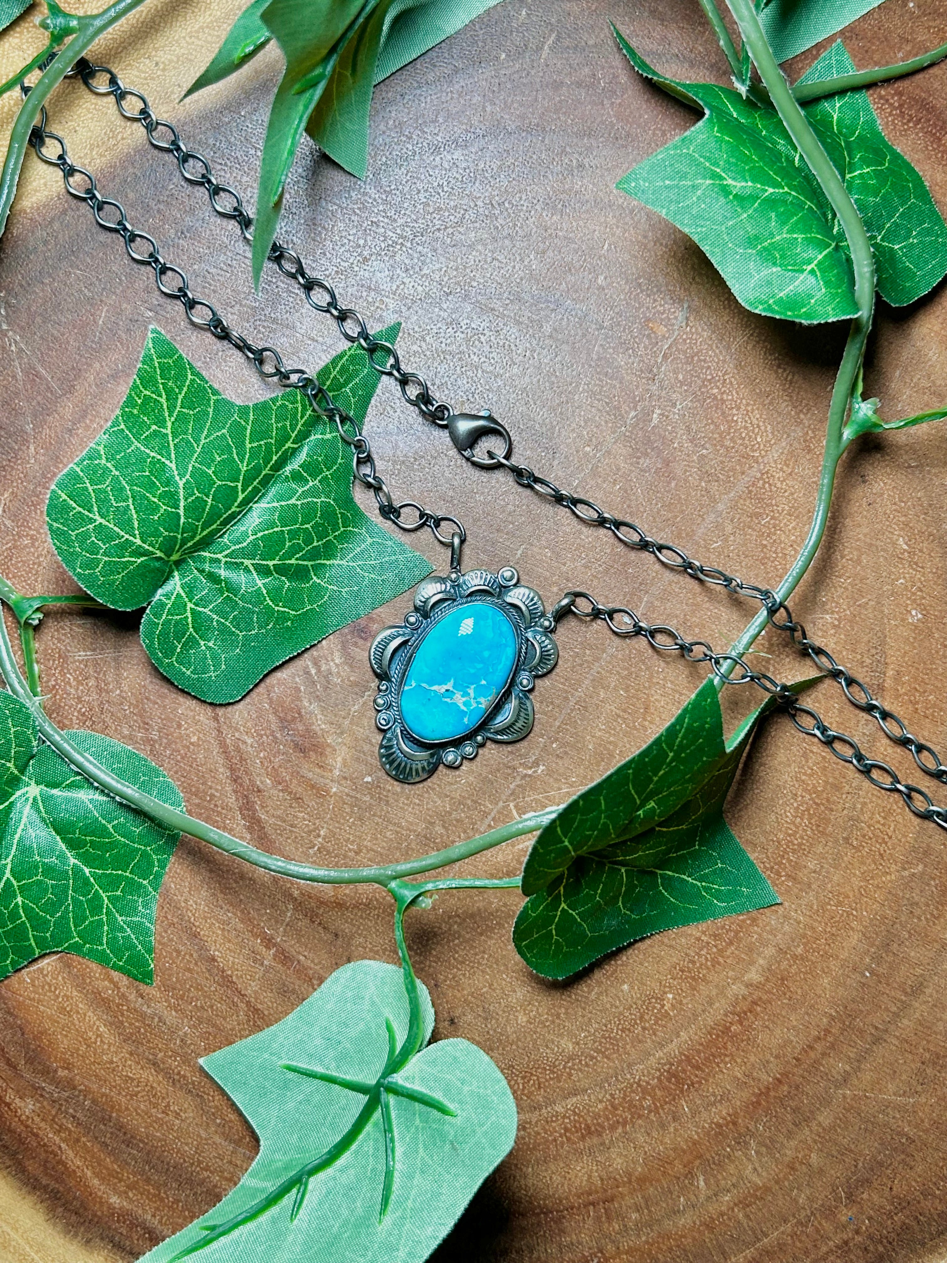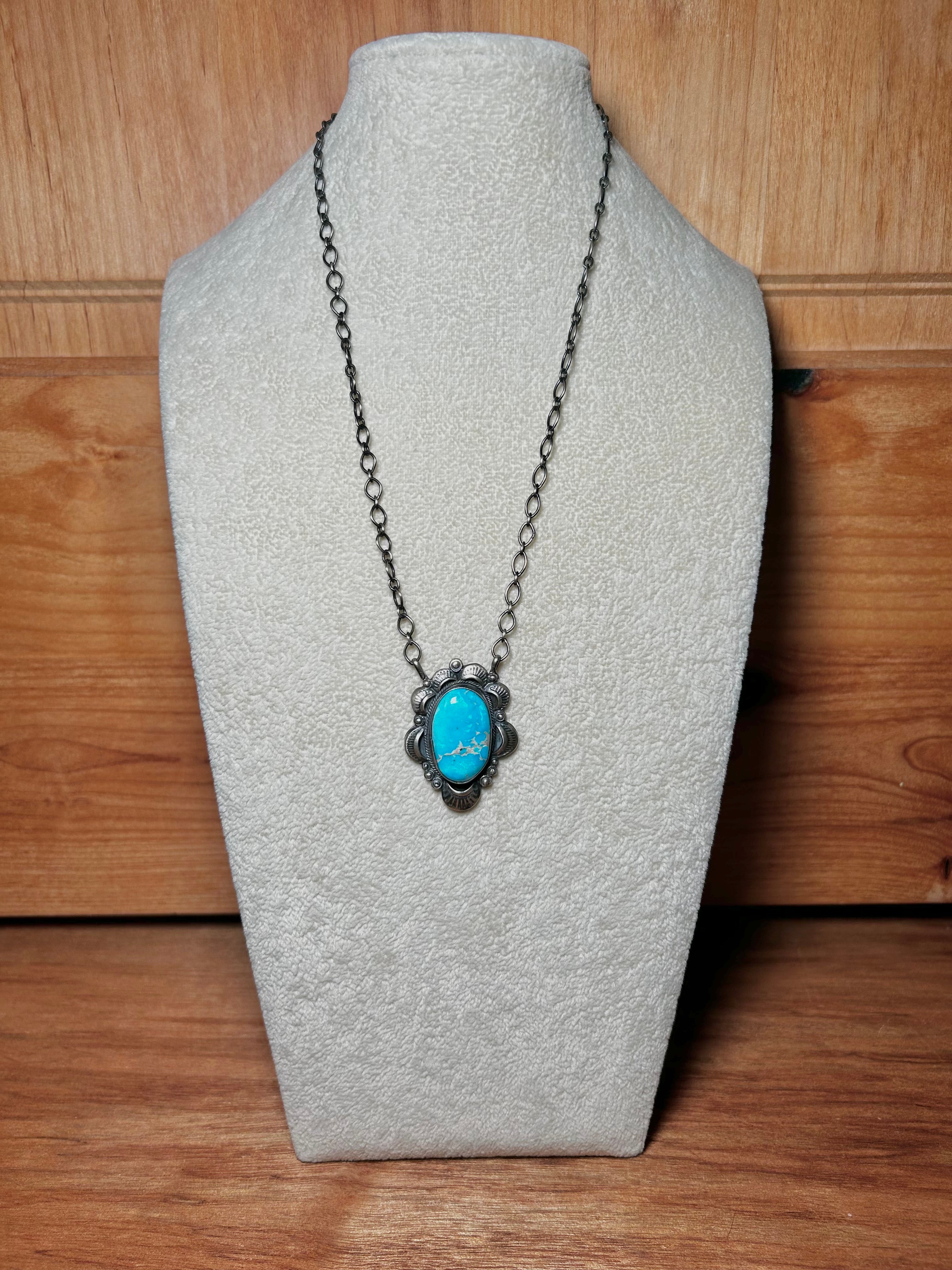 Gilbert Tom Blue Ridge & Sterling Silver Necklace. It measures 22 inches long with hang while the chain by itself measures 19 inches long. Signed by the artist and stamped sterling silver.