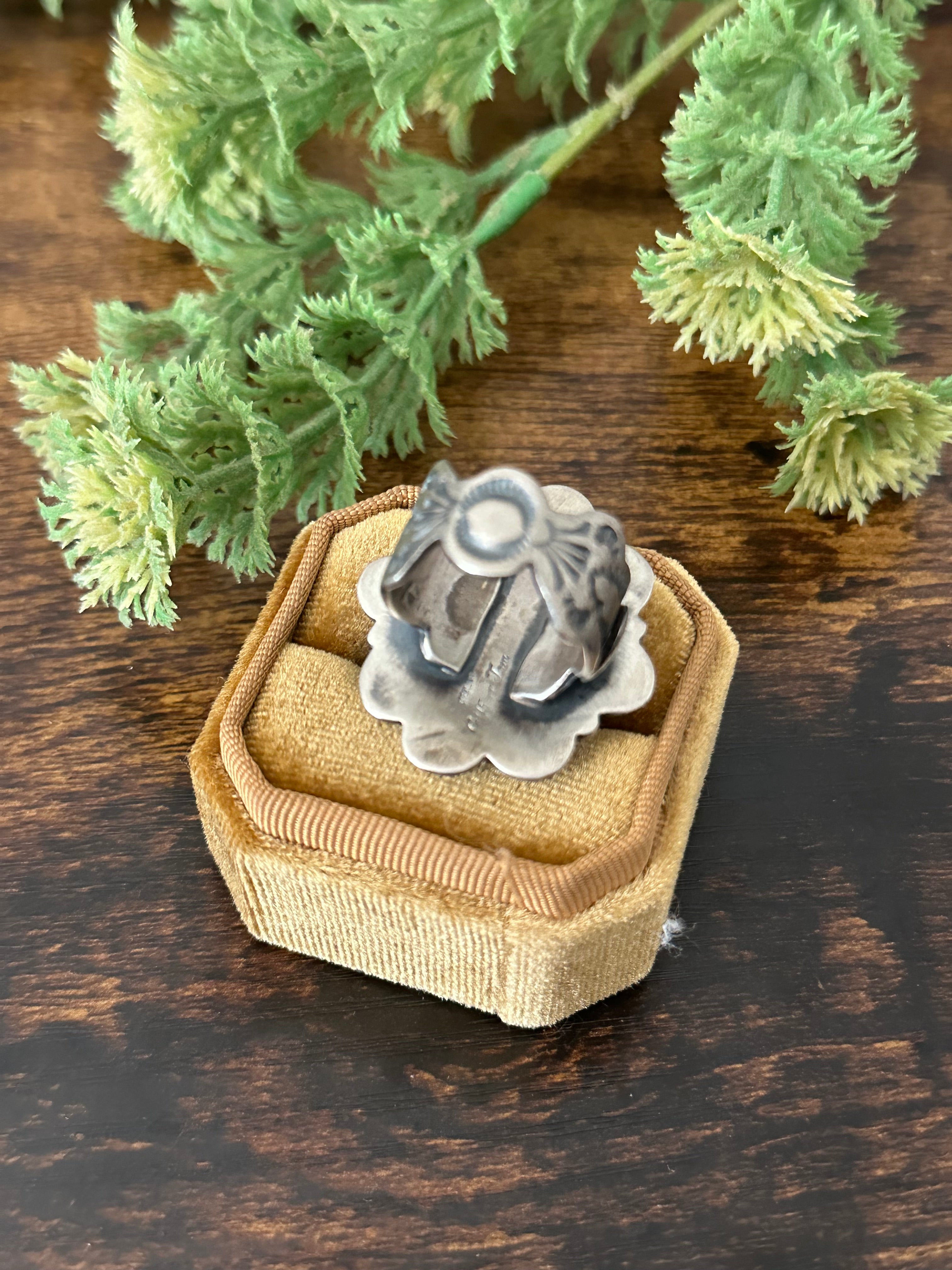 Beautiful ring. Gilbert Tom Sonoran Gold Turquoise & Sterling Silver Ring Size 8.5. It measures 1 3/8 inches long and 1 1/4 inches wide. Stamped sterling silver and signed by artist.