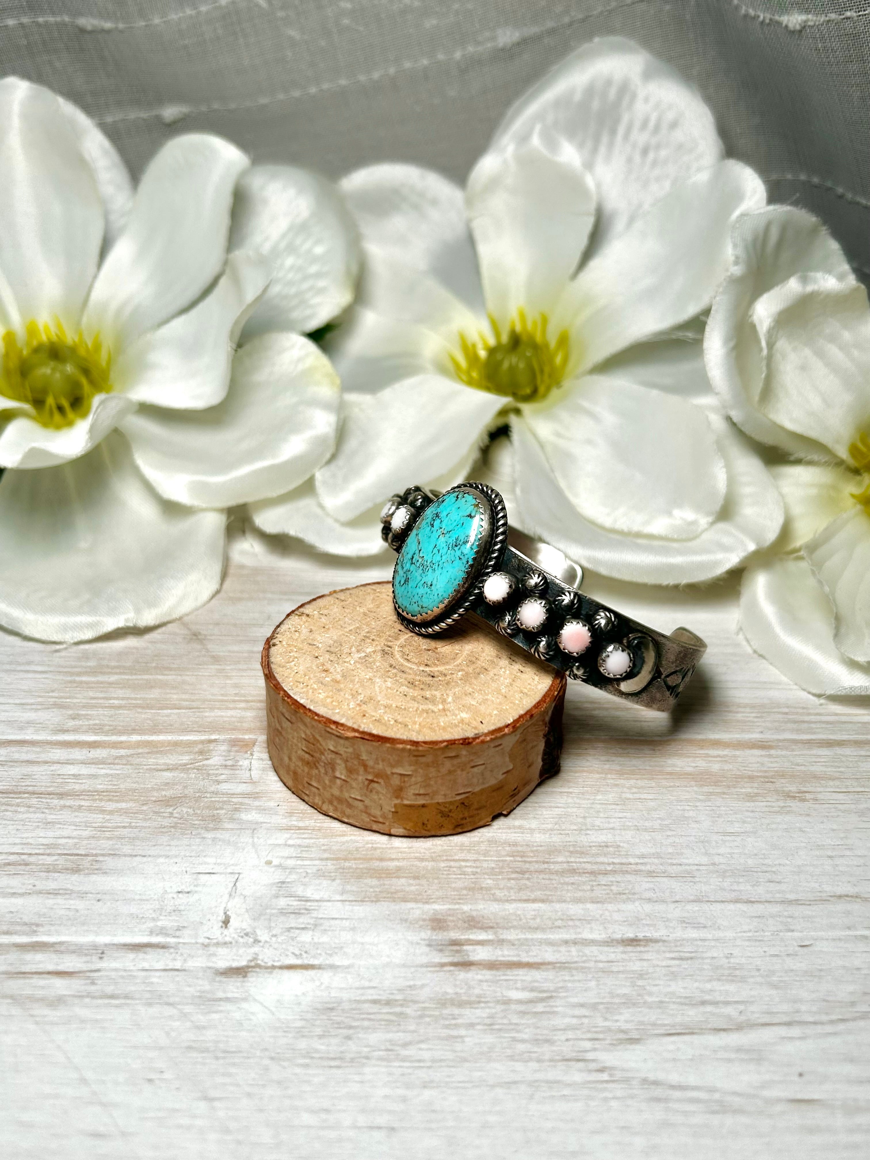Richard Yazza Multi Stone & Sterling Silver Cuff Bracelet. It measures 1 1/8 inches wide with an inside circumference of 5 5/8 inches and a gap of 1 inch. Signed by the artist and stamped sterling silver.