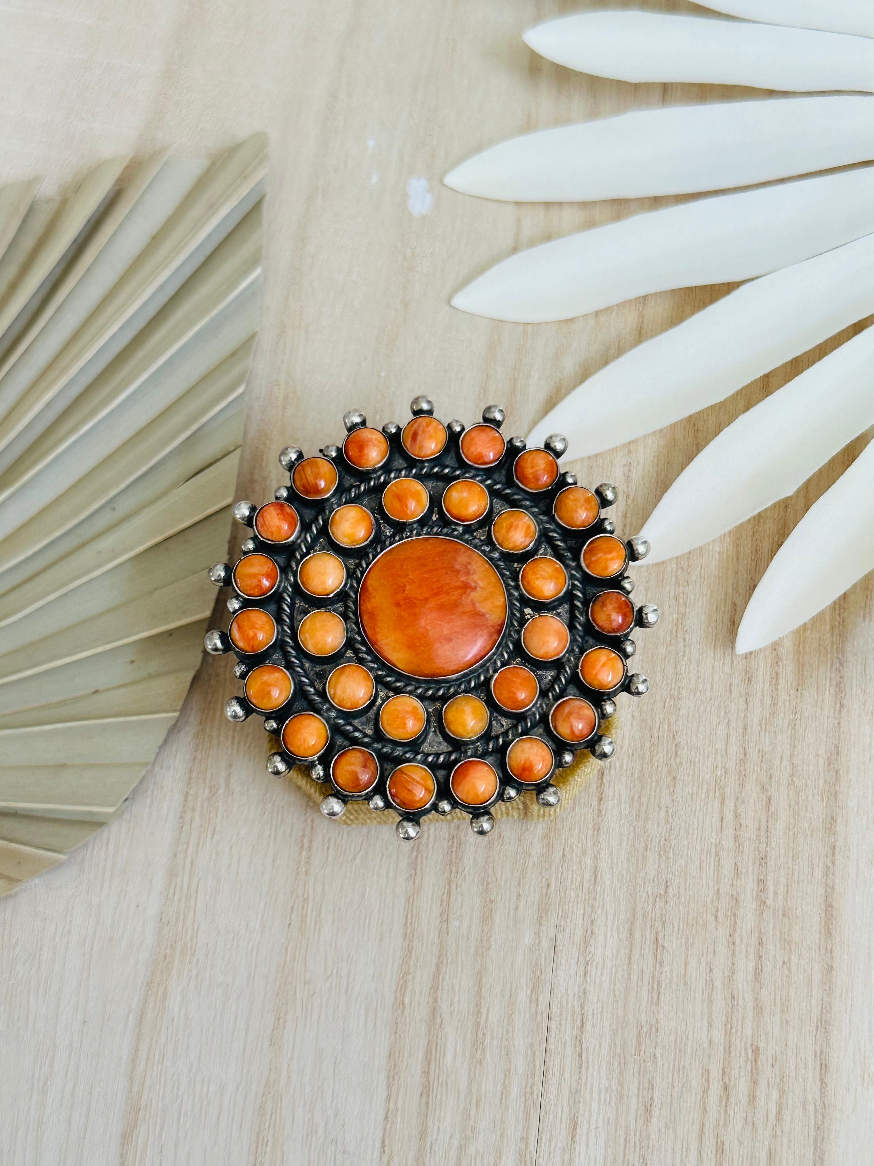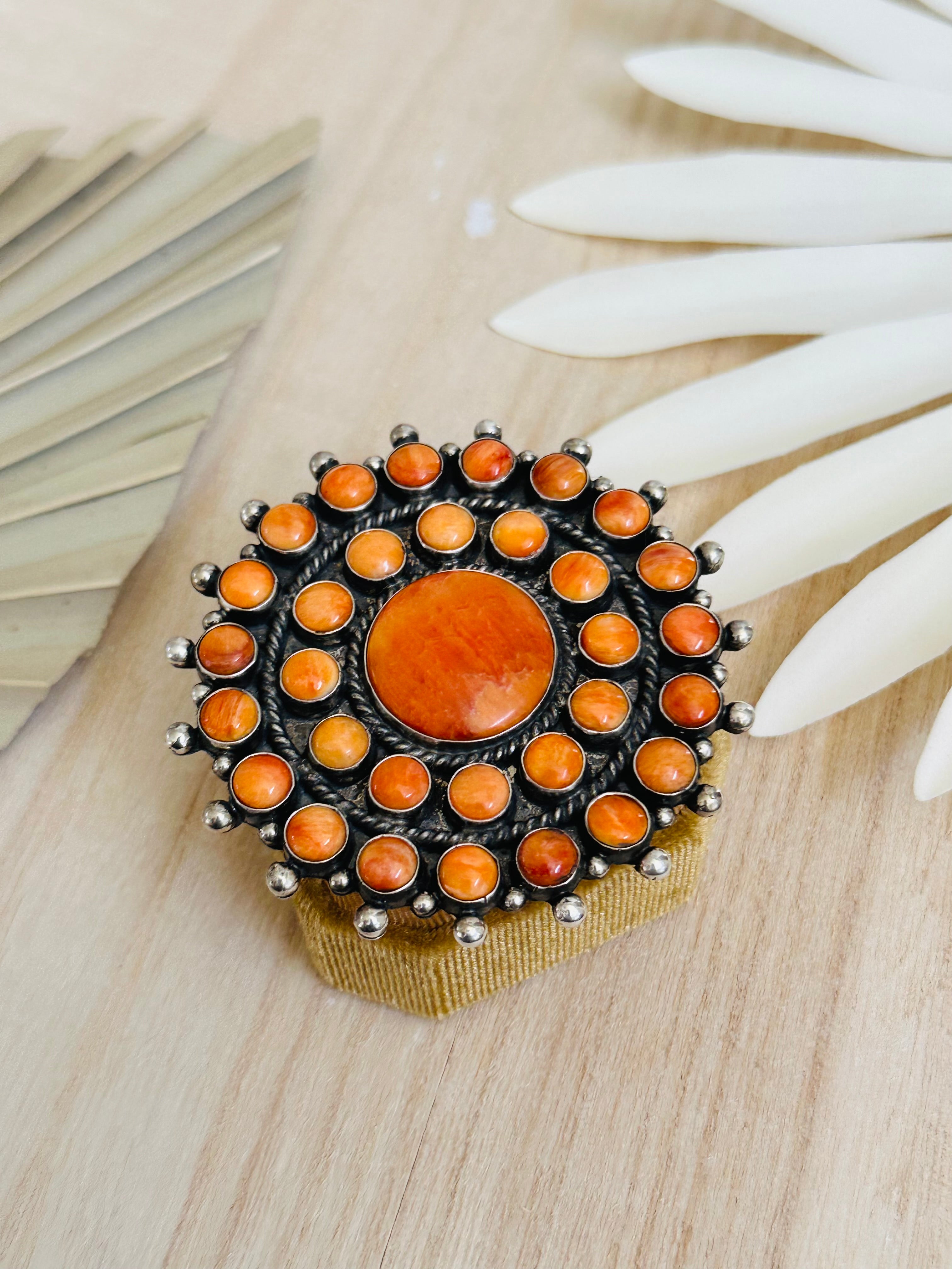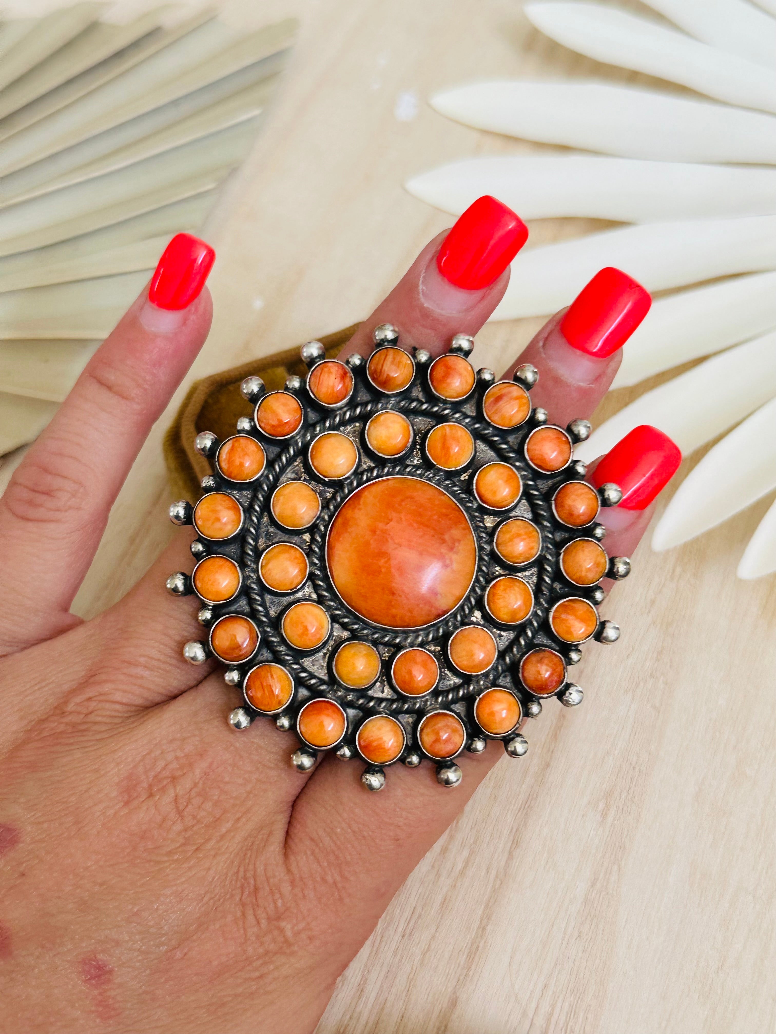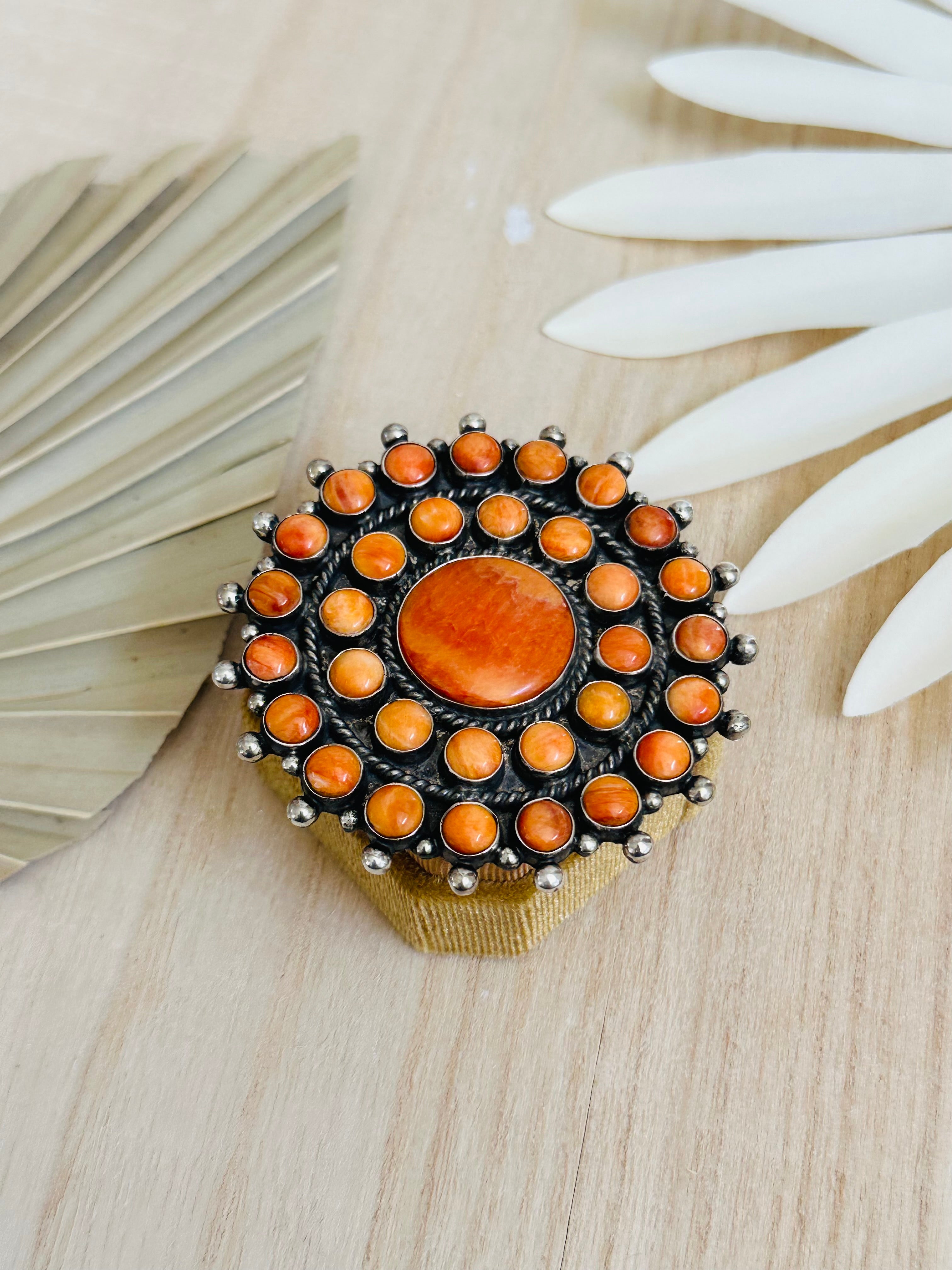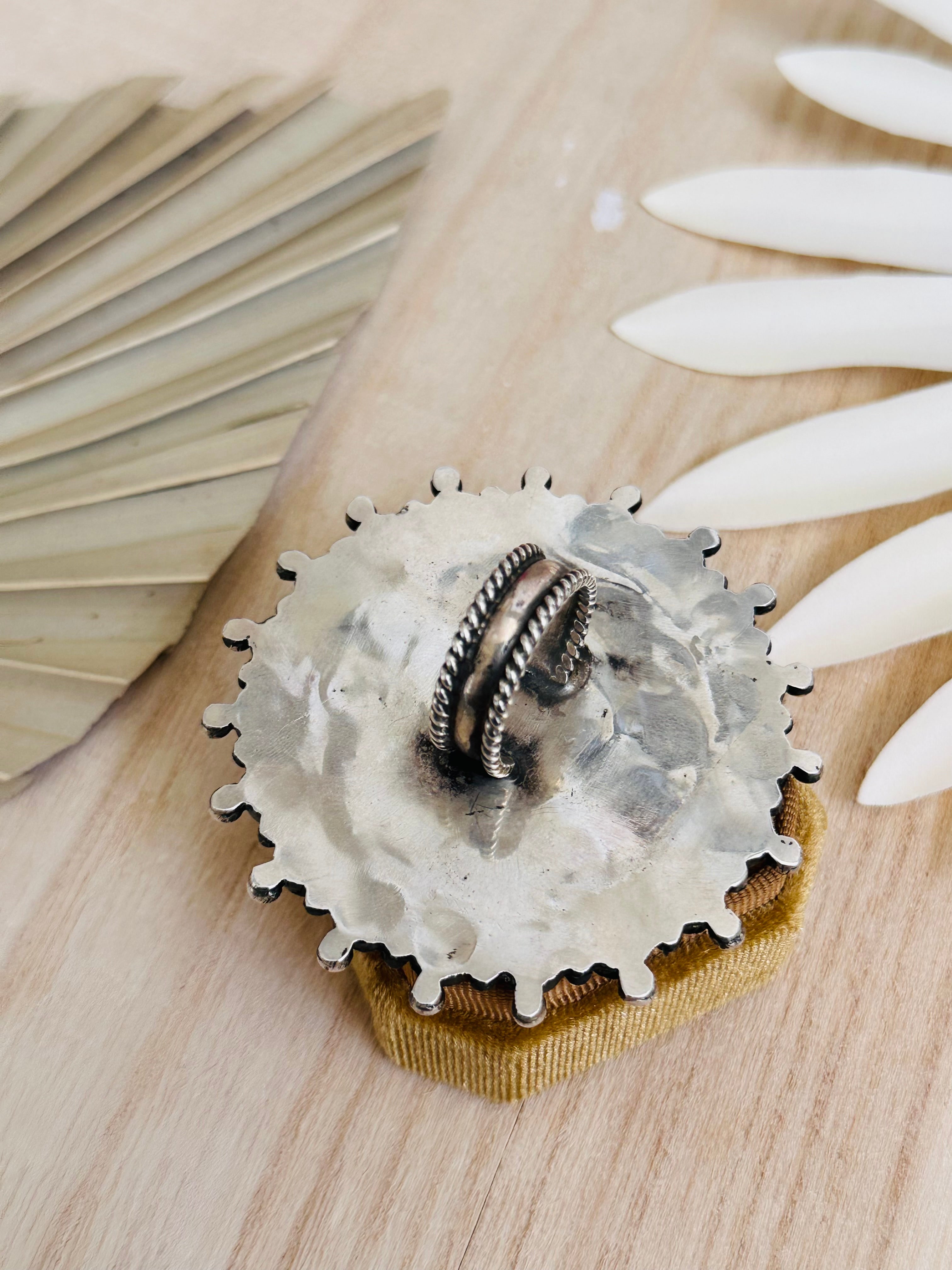 Lee Brown Spiny Oyster & Sterling Silver Adjustable Cluster Ring. It measures 2 1/2 inches round. Signed by the artist and stamped sterling silver.