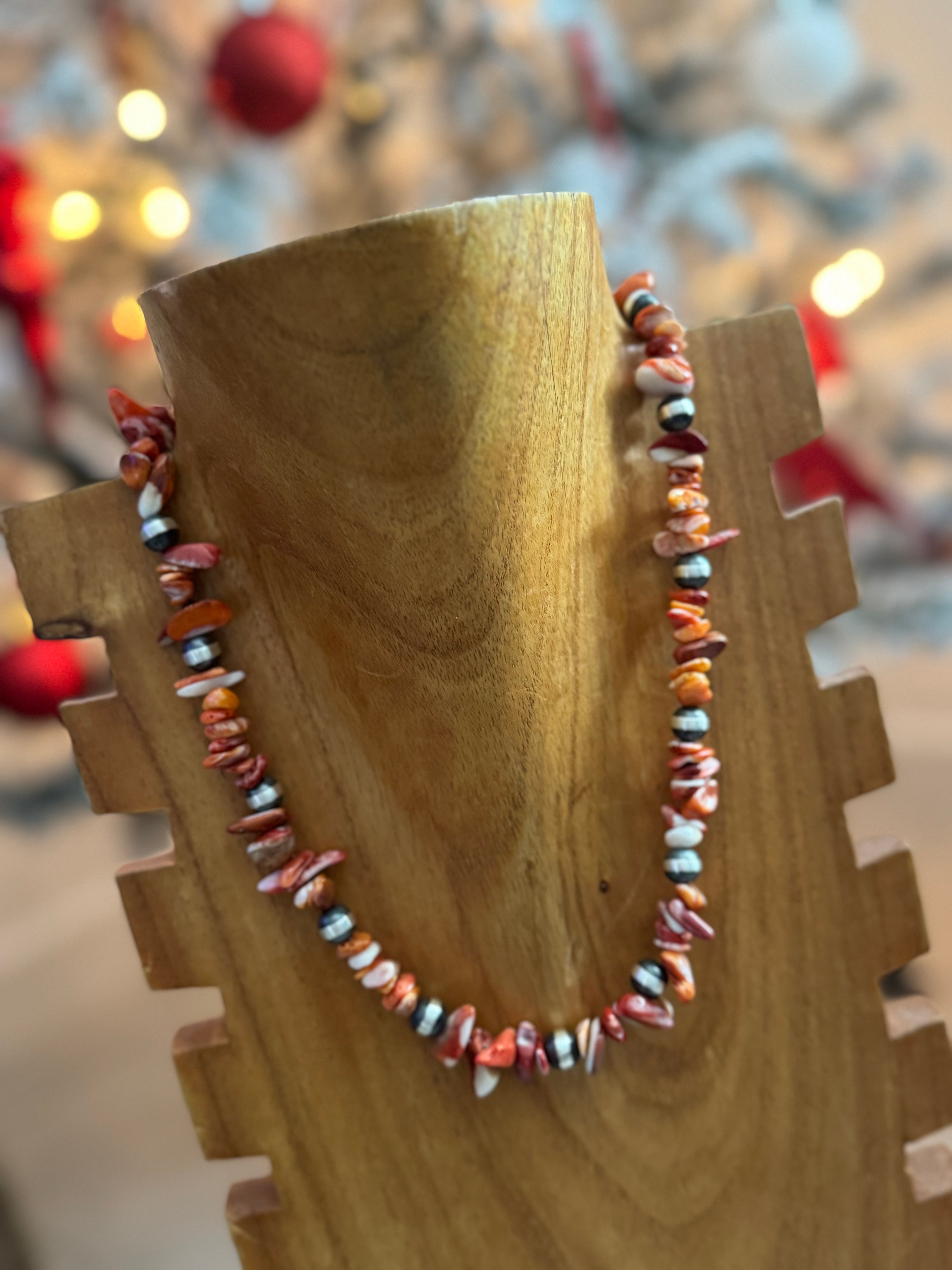 Navajo Strung Red/Orange Spiny Oyster & Sterling Silver Pearl Necklace. Measures 18 inches long.