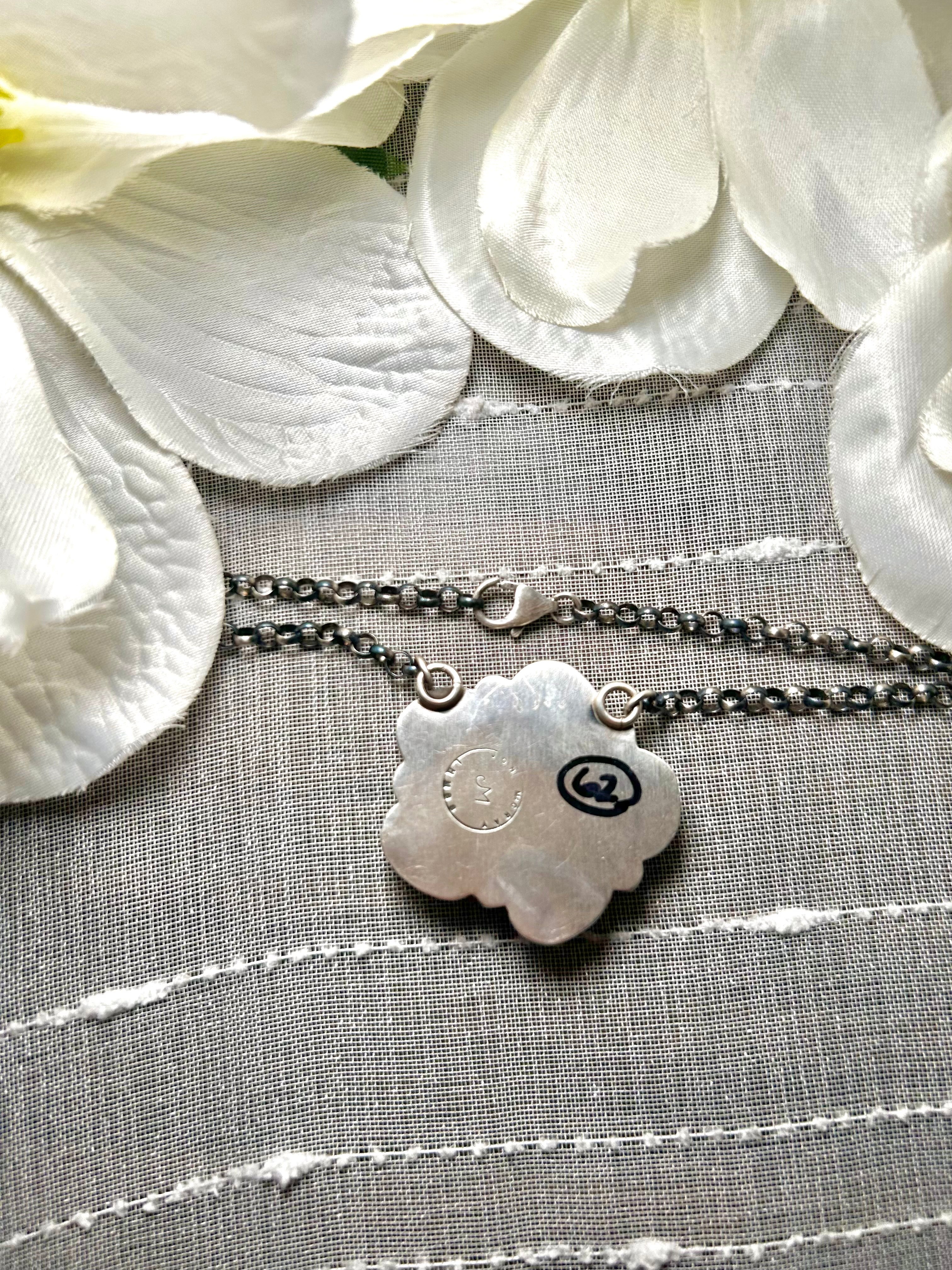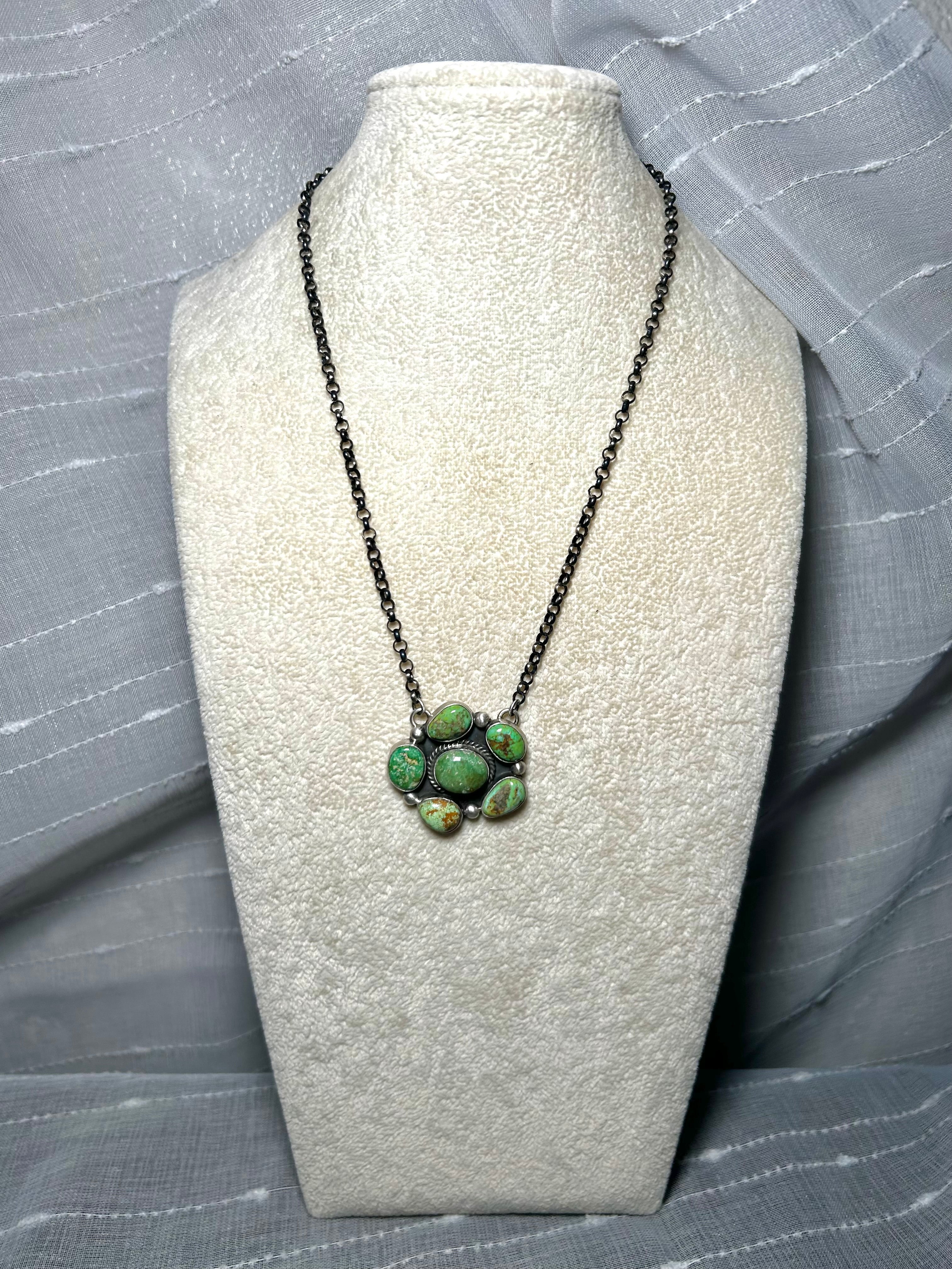 Jon McCray Sonoran Gold Turquoise & Sterling Silver Necklace. It measures 21 1/2 inches long with hang while the chain measures 19 inches long. Signed by the artist and stamped sterling silver.