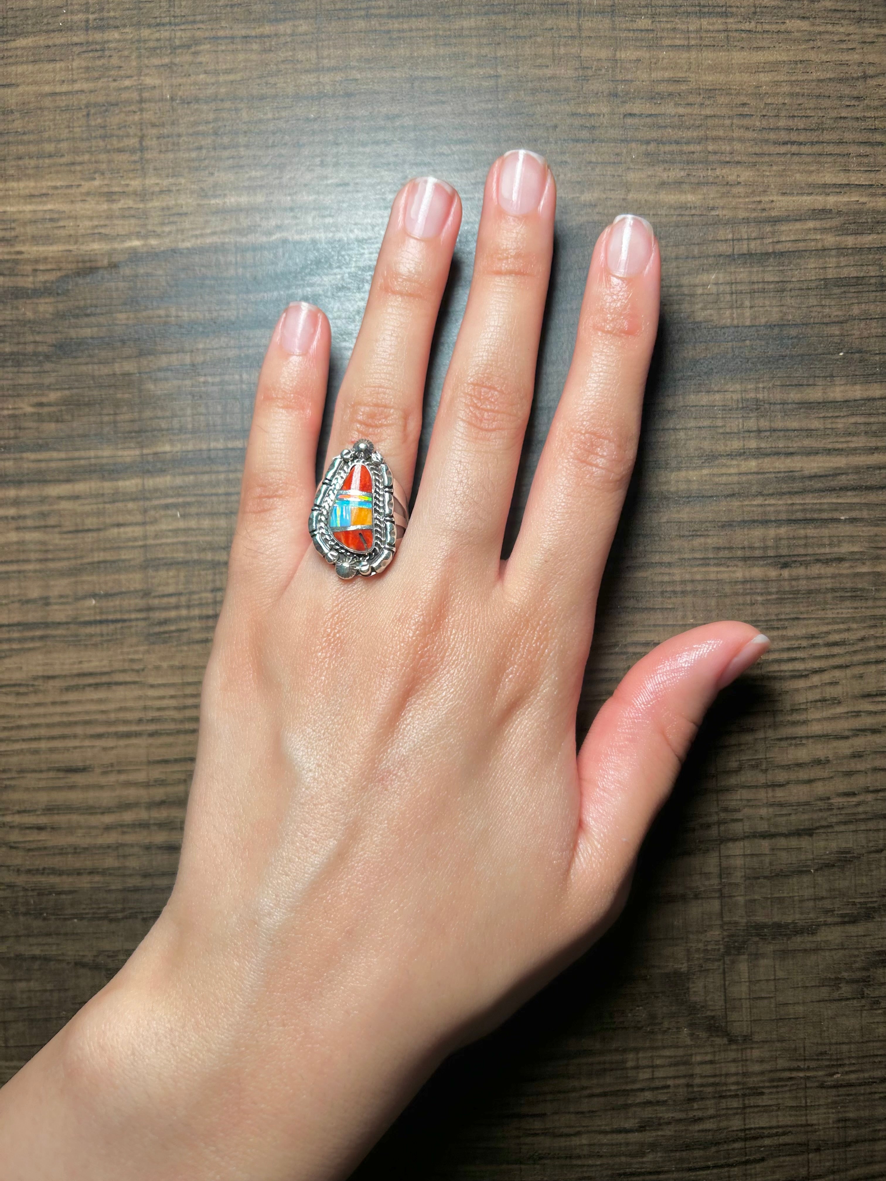 James Mannygoats Multi Stone & Sterling Silver Ring Size 5.75. It measures 1 inch long and 5/8 of an inch wide.