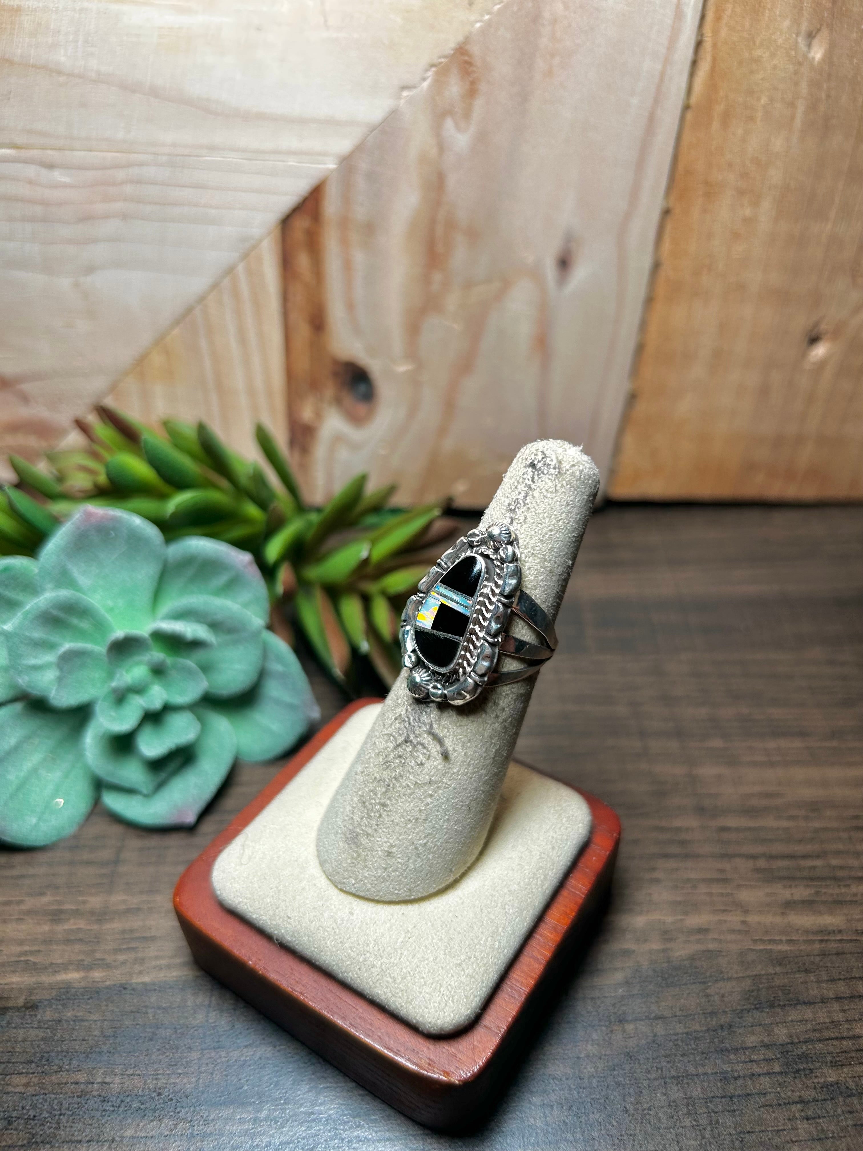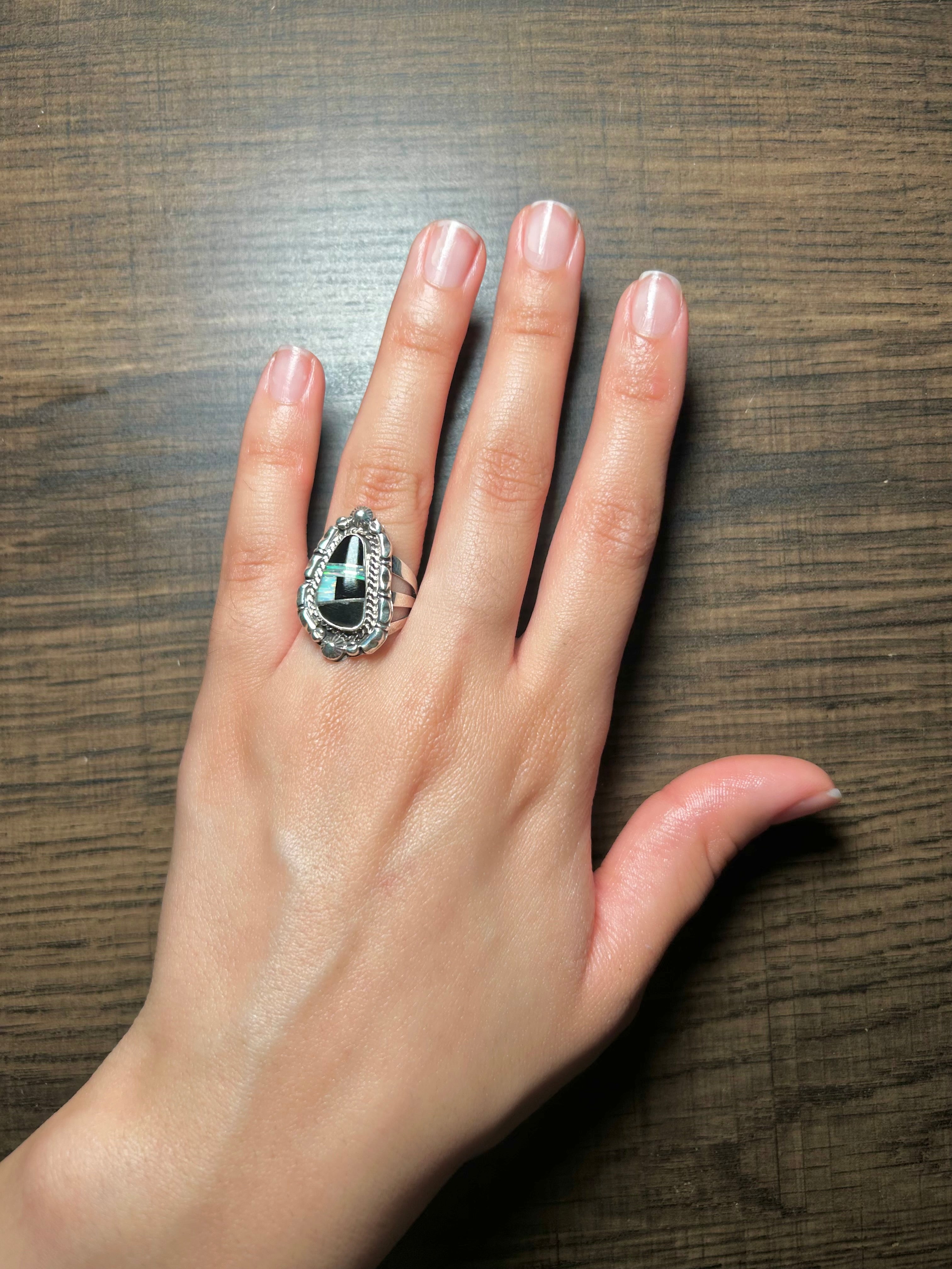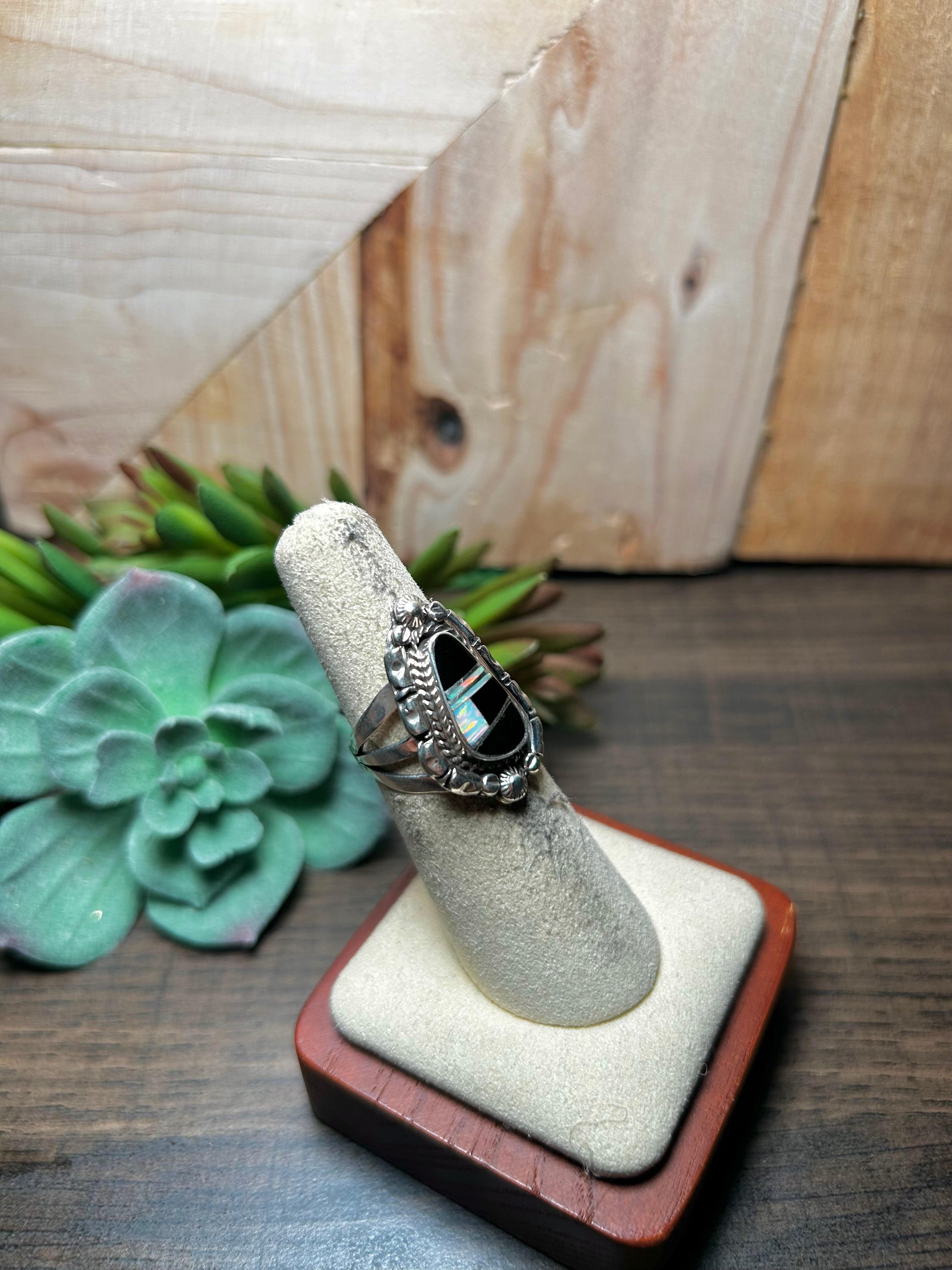 James Mannygoats Multi Stone & Sterling Silver Ring Size 5.5. It measures 1 inch long and 5/8 of an inch wide.