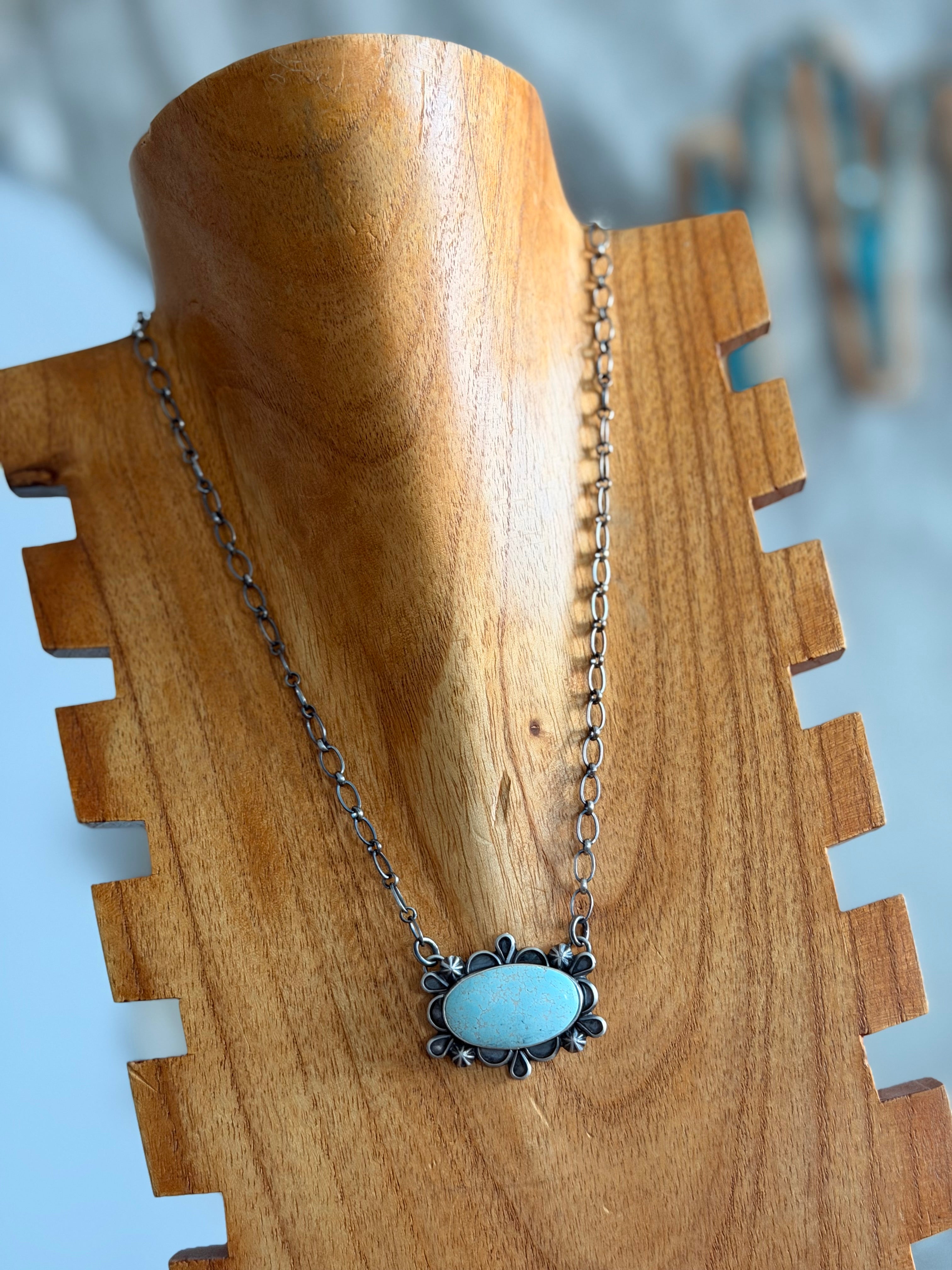 Jameson Garcia Natural Dry Creek Turquoise & Sterling Silver Bar Necklace. It measures 19 inches long with hang while the chain measures 18 inches long. Signed by the artist and stamped sterling silver.