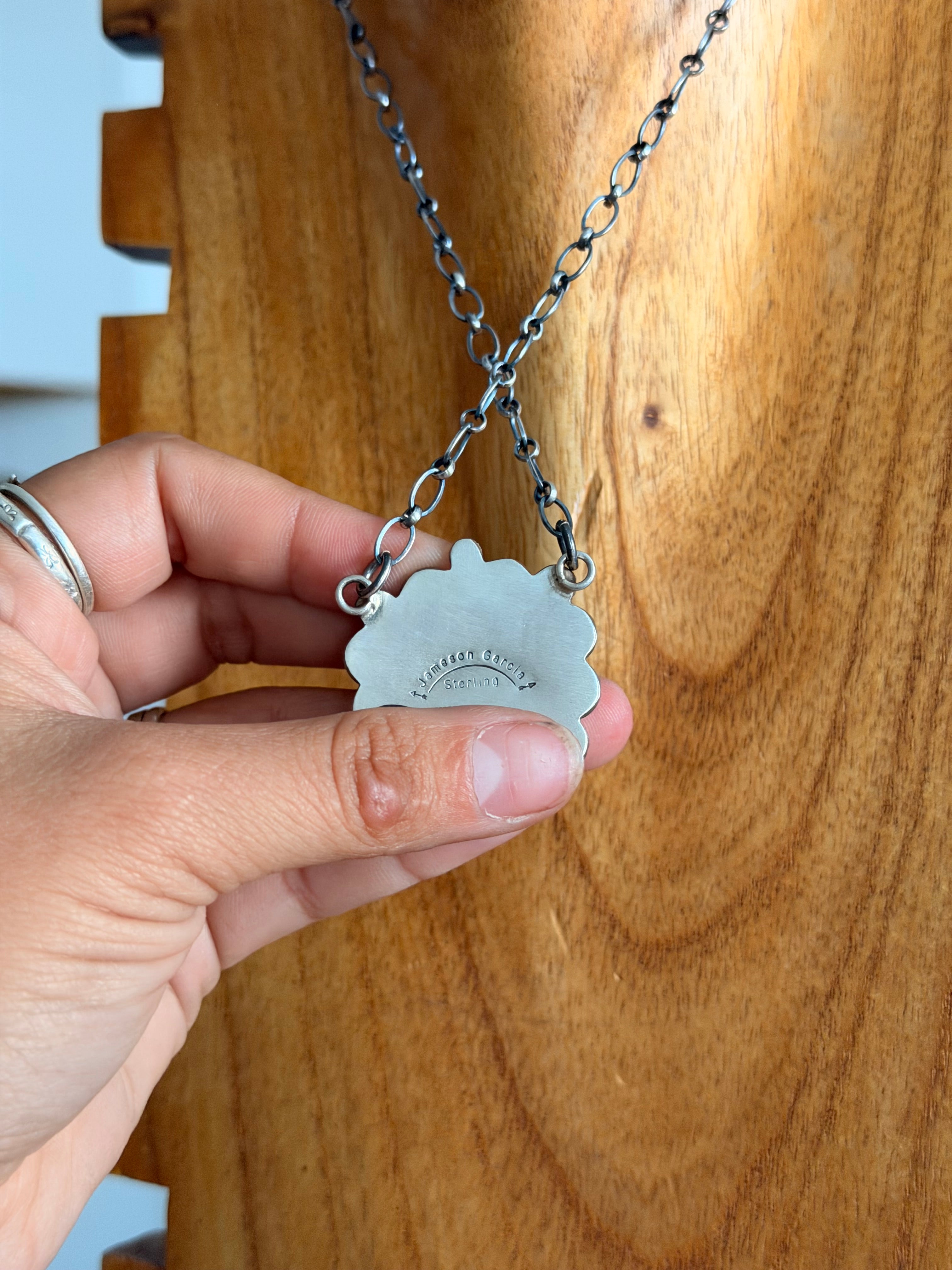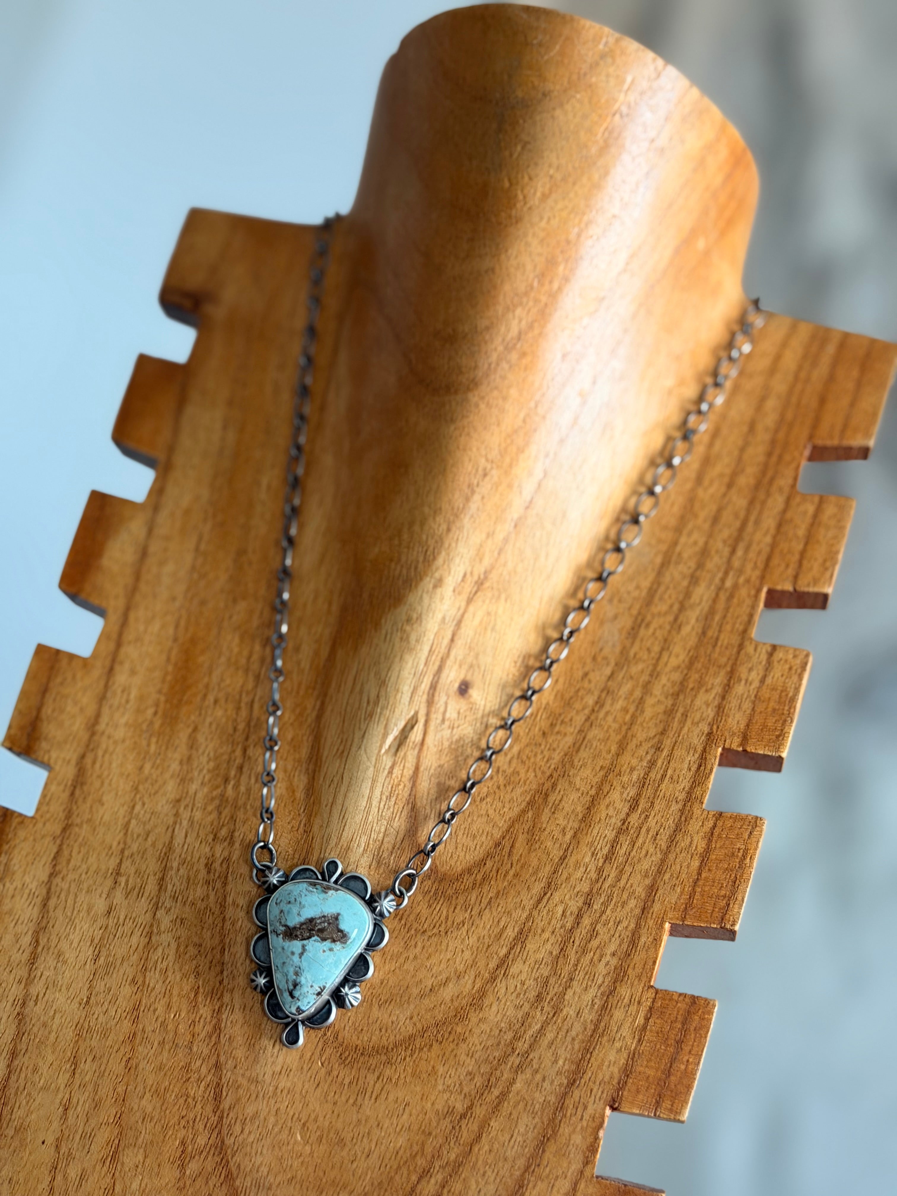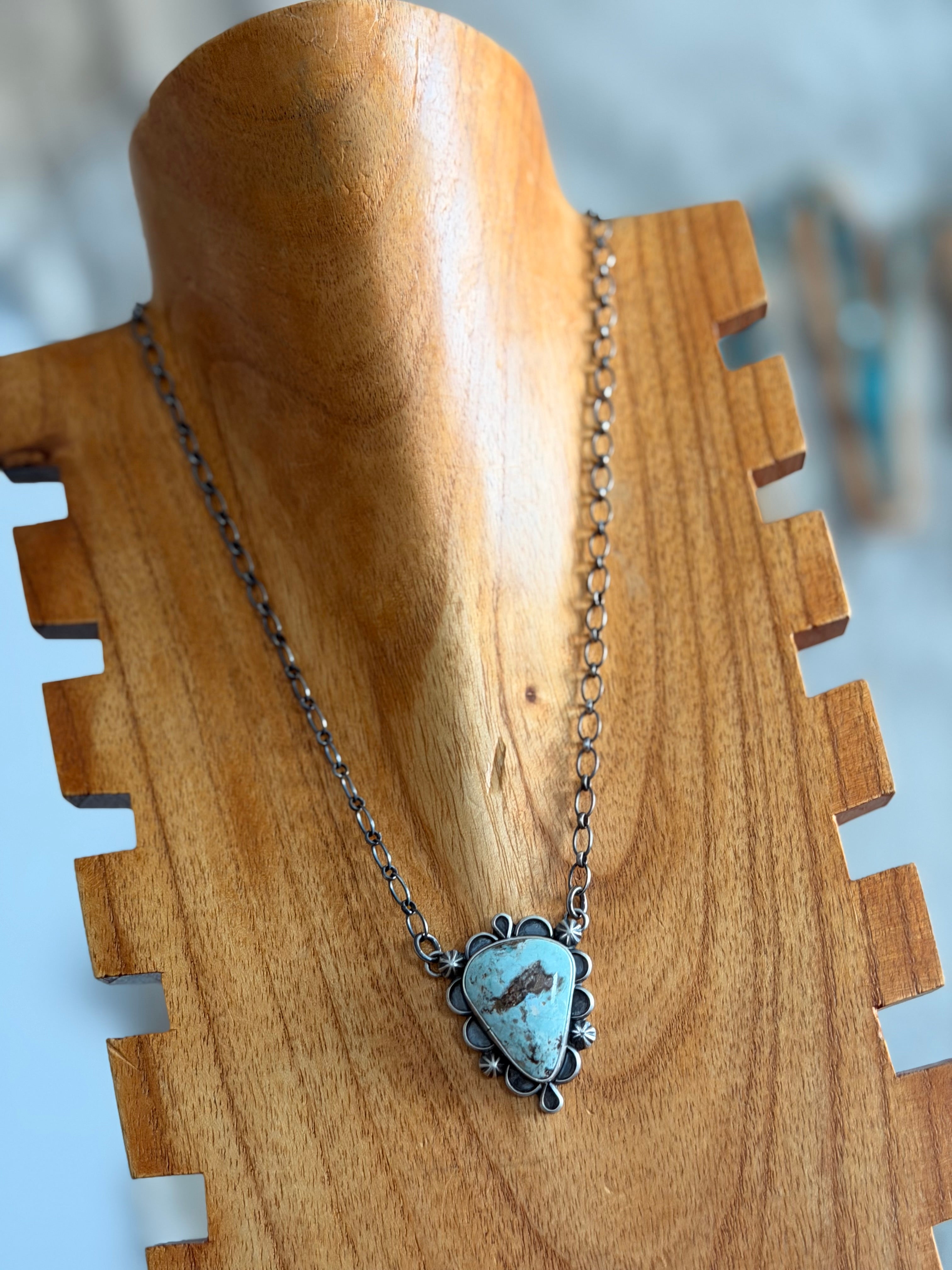Jameson Garcia Natural Dry Creek Turquoise & Sterling Silver Bar Necklace. It measures 20 1/4 inches long with hang while the chain measures 18 inches long. Signed by the artist and stamped sterling silver.