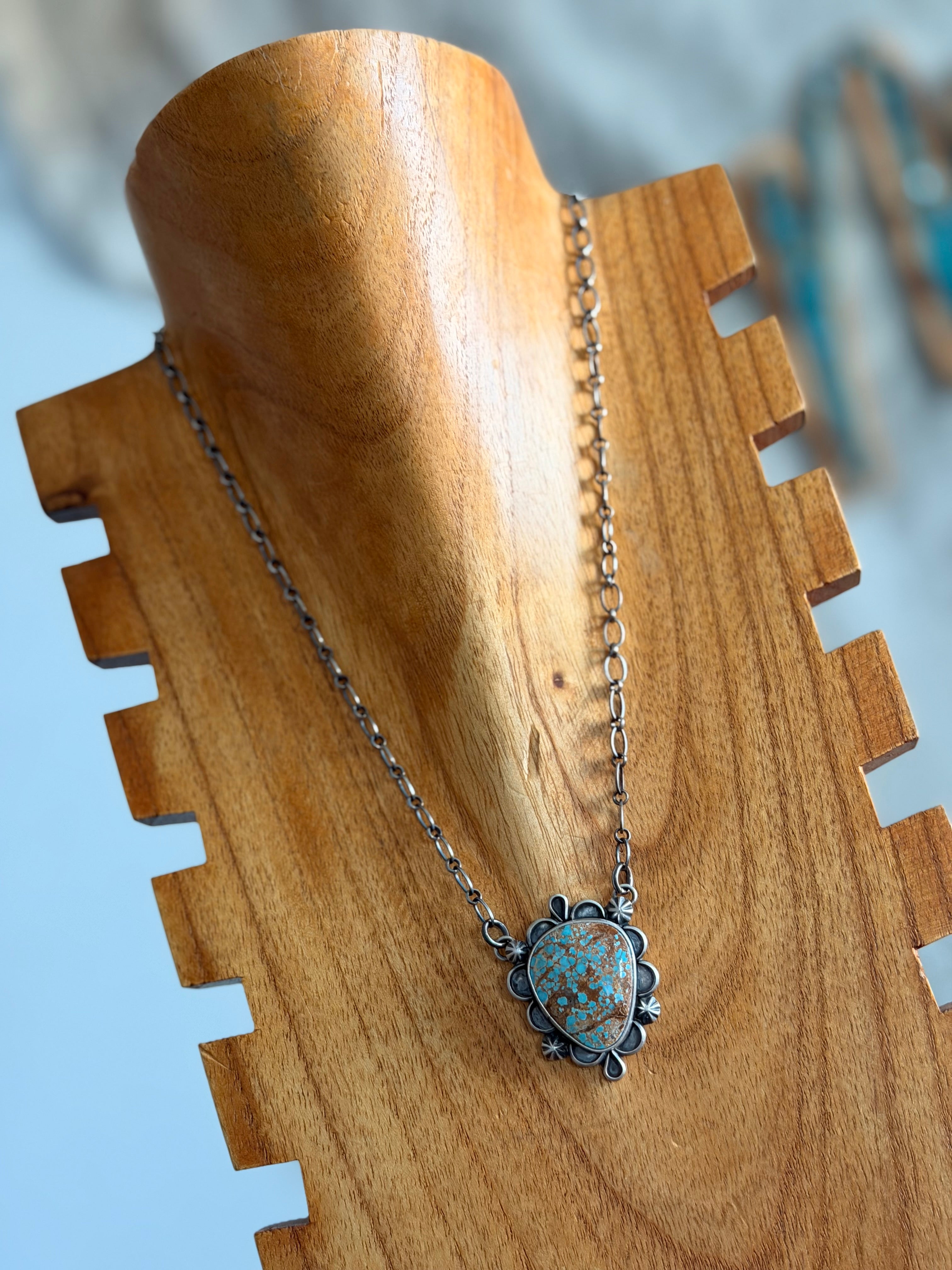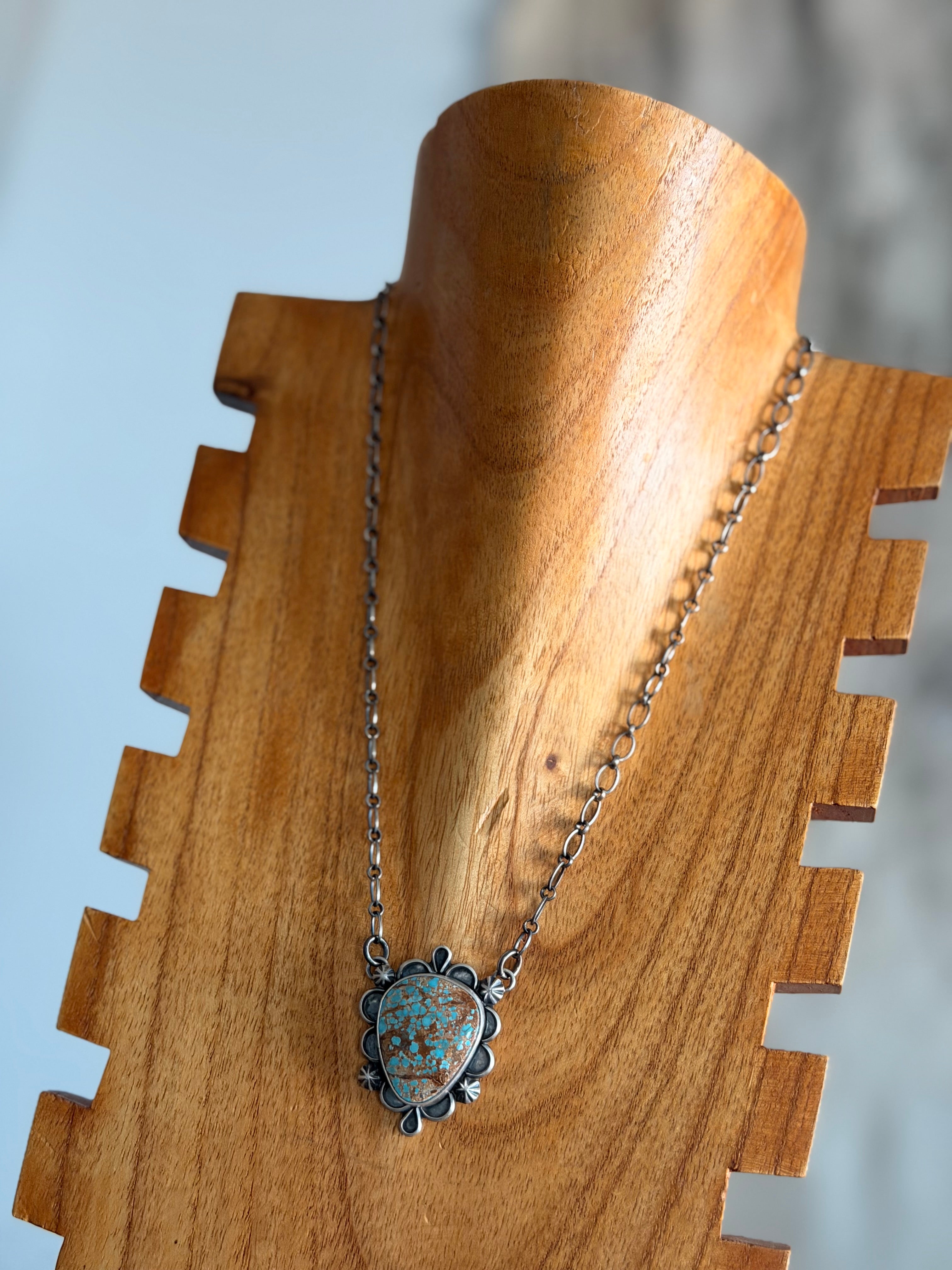 Jameson Garcia Natural Dry Creek Turquoise & Sterling Silver Bar Necklace. It measures 20 1/4 inches long with hang while the chain measures 18 inches long. Signed by the artist and stamped sterling silver.