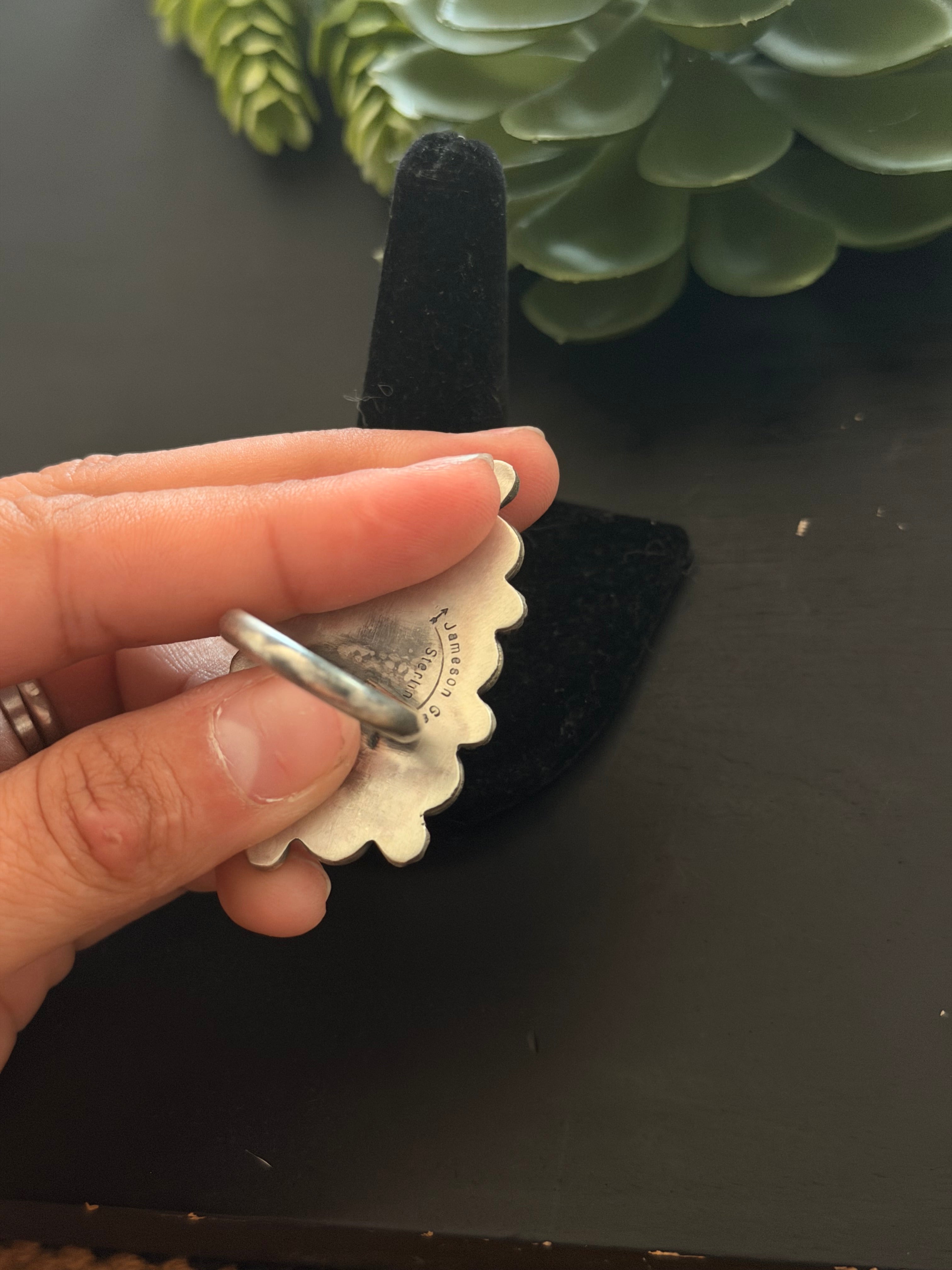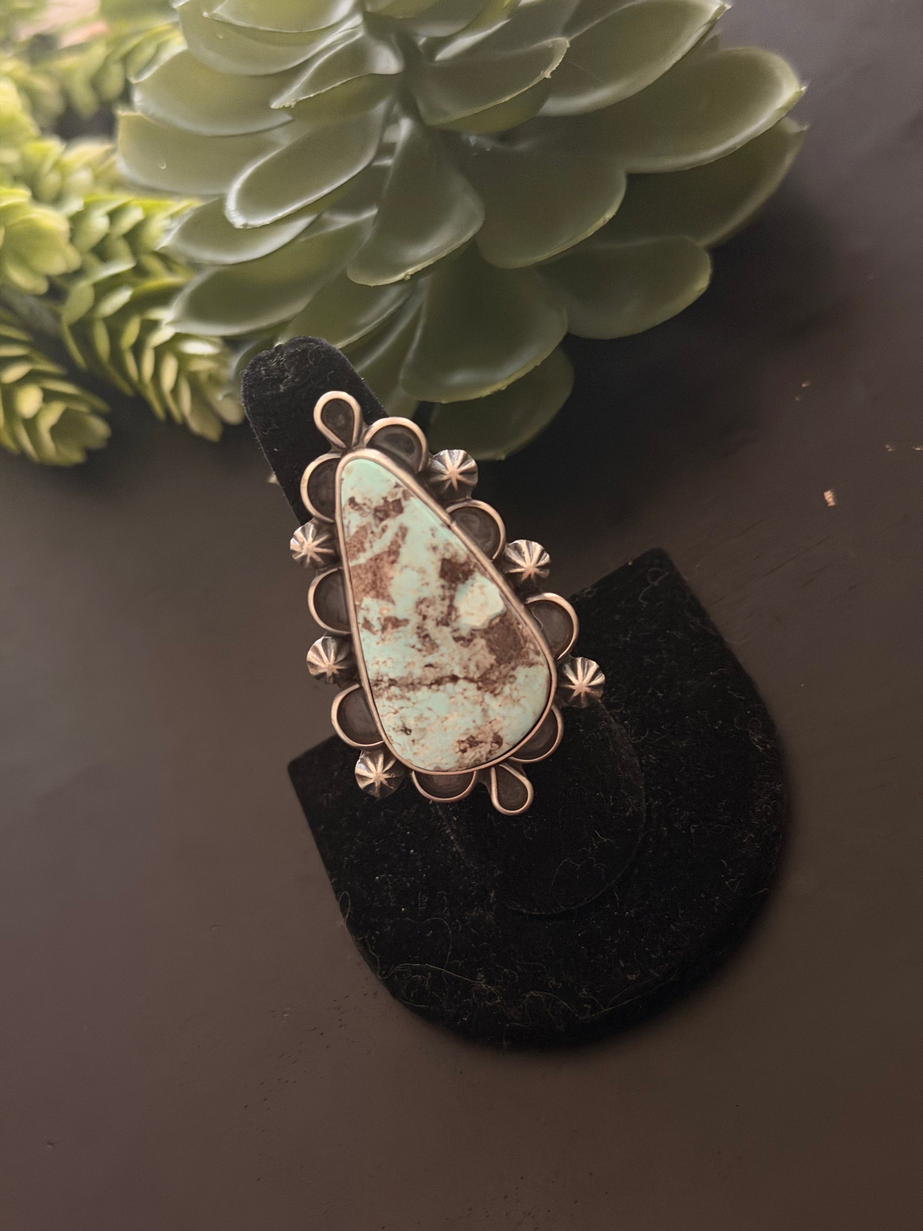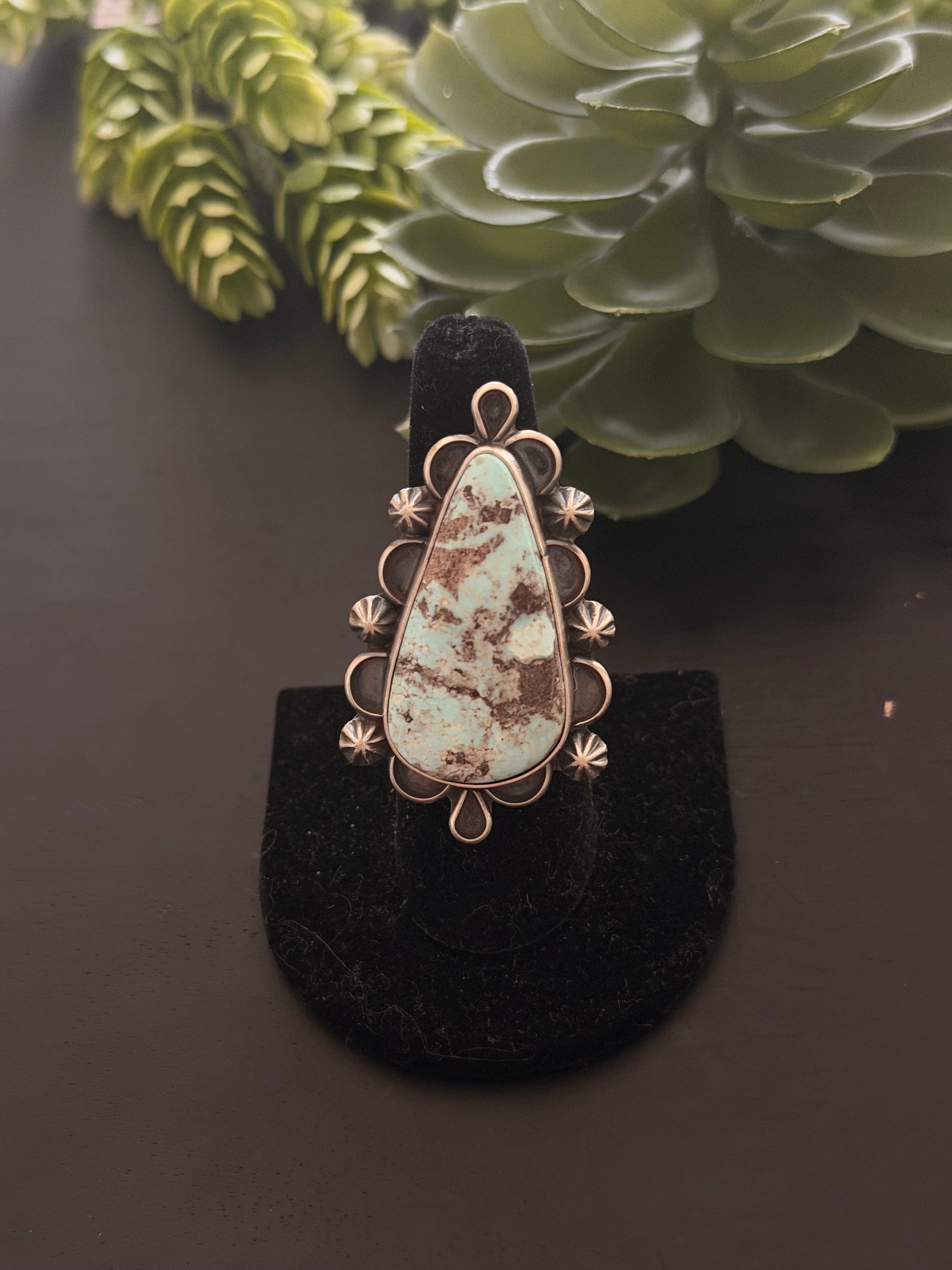 Jameson Garcia Natural Dry Creek Turquoise & Sterling Silver Ring Size 8.5. It measures 2 inches long and 1 1/4 inches wide. Signed by the artist and stamped sterling silver.
