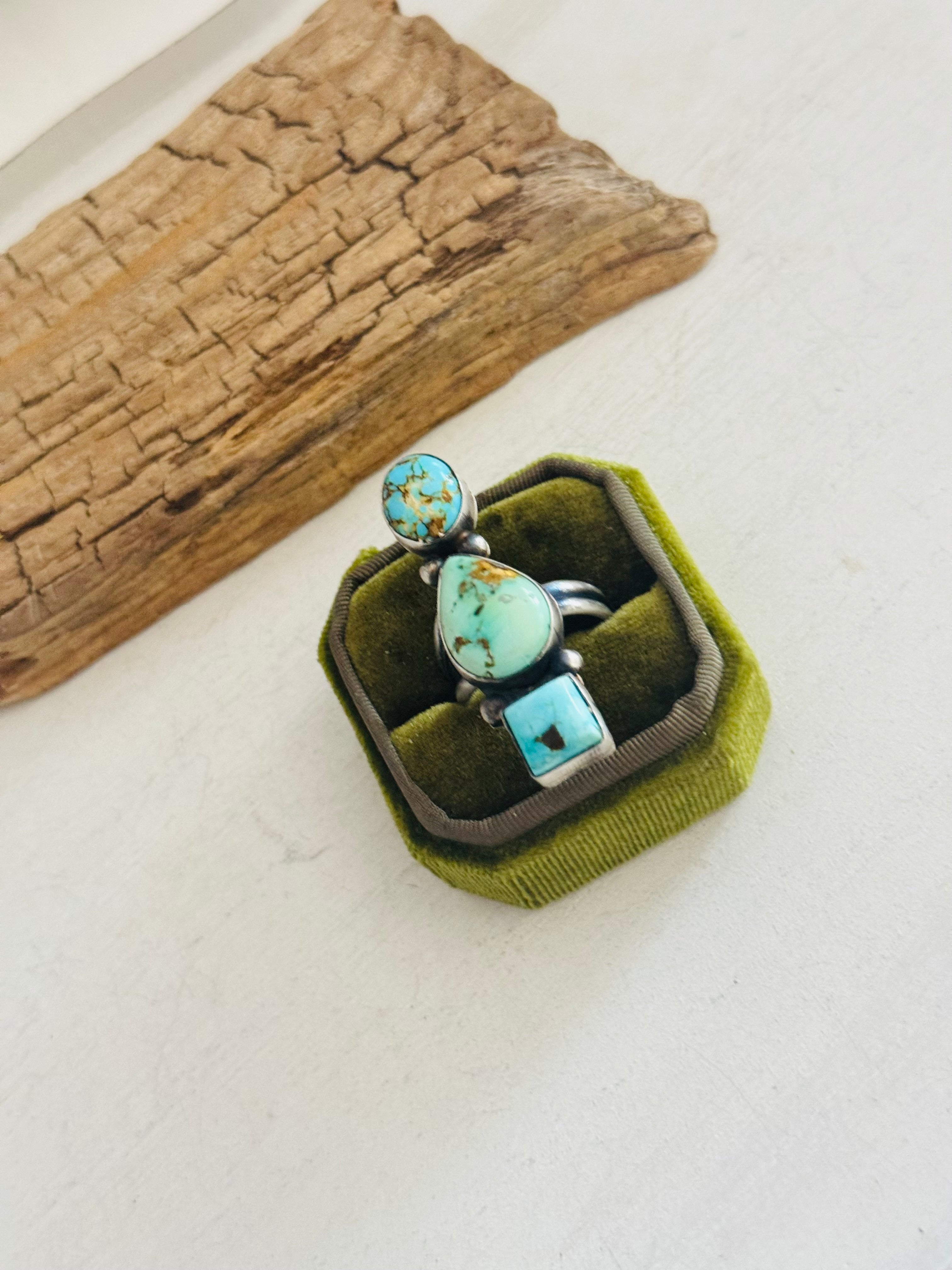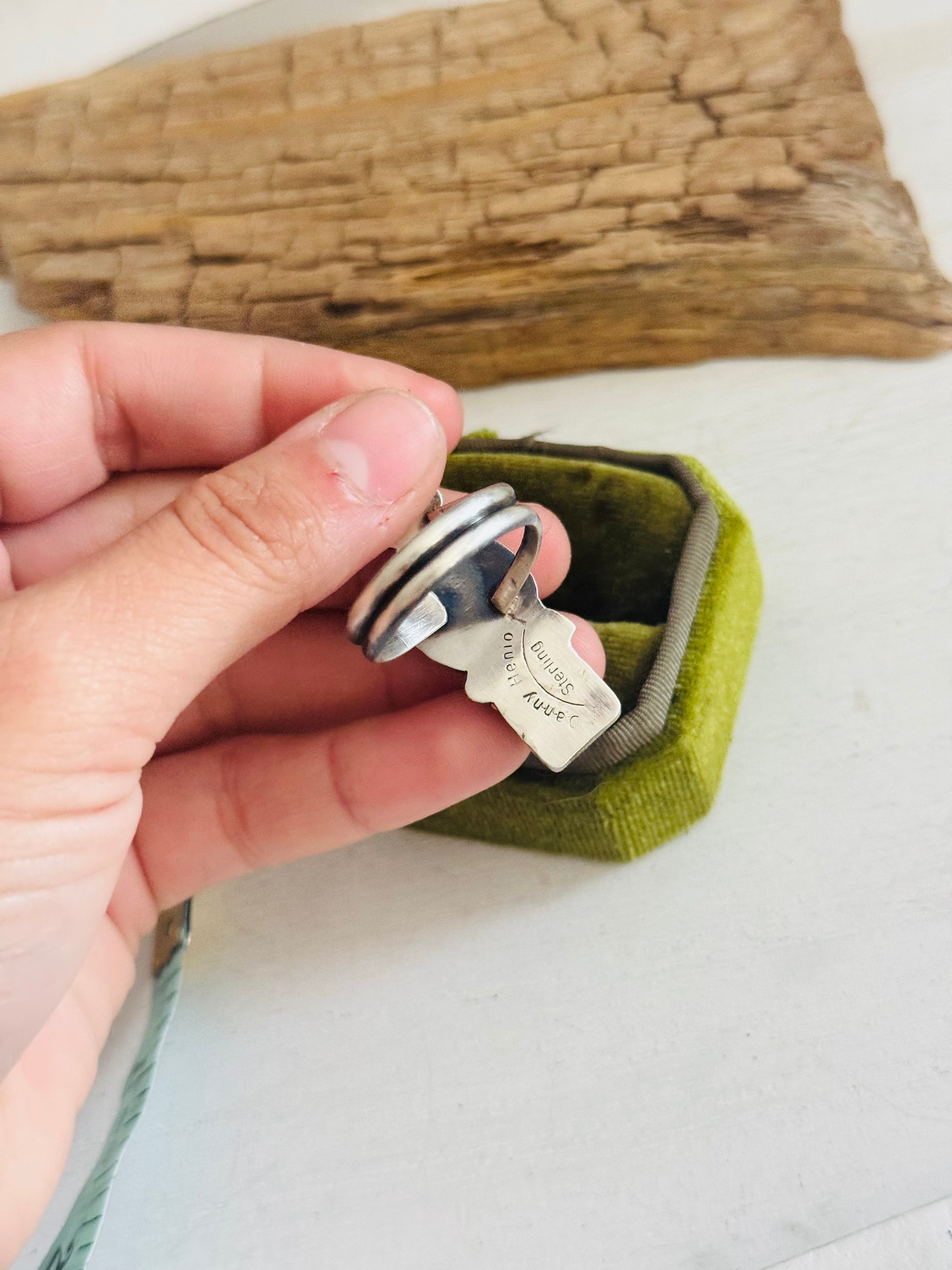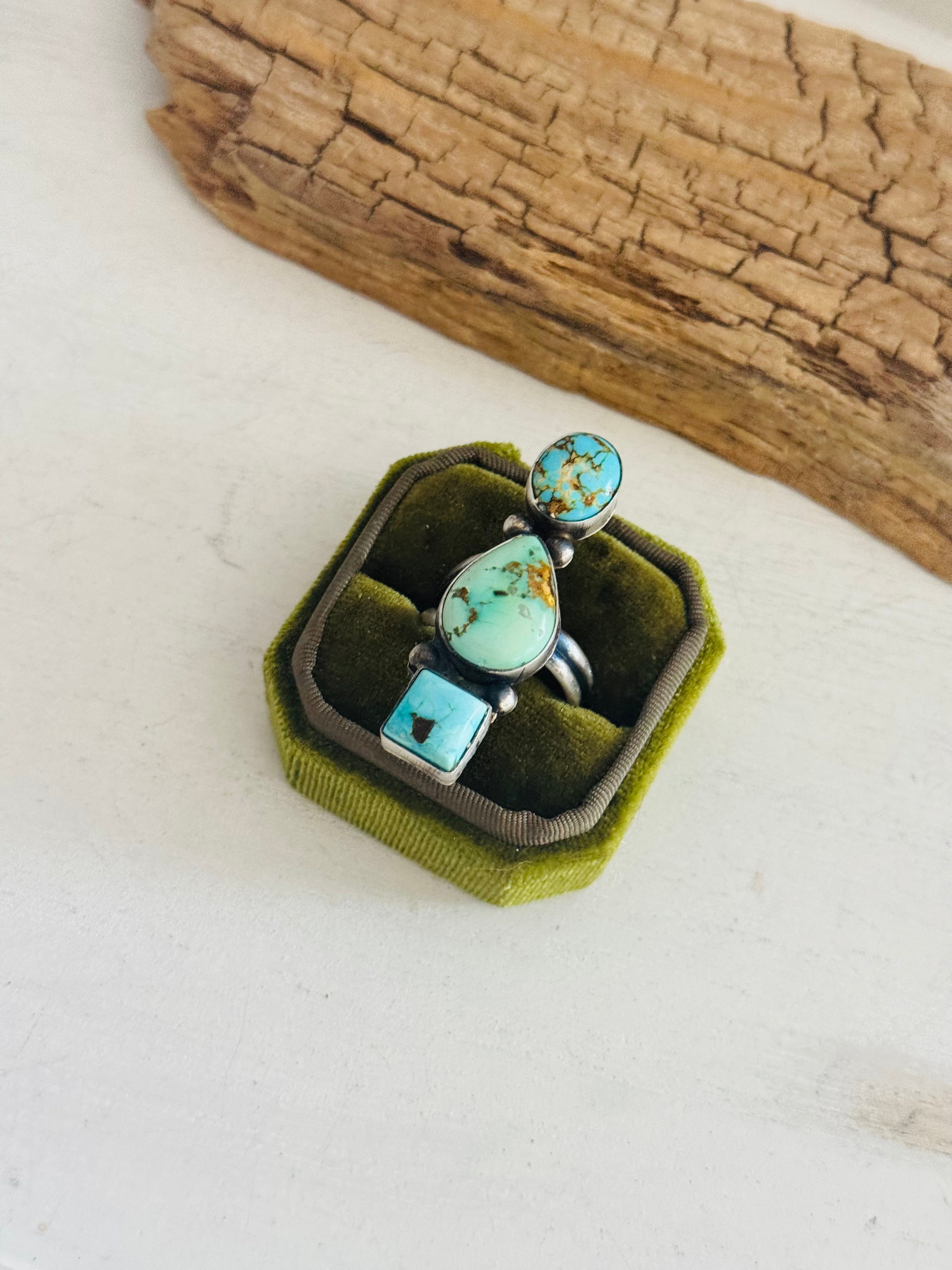 Danny Henio Royston Turquoise & Sterling Silver Adjustable Cluster Ring. It measures 1 7/8 inches long and 5/8 of an inch wide. Signed by the artist and stamped sterling silver.