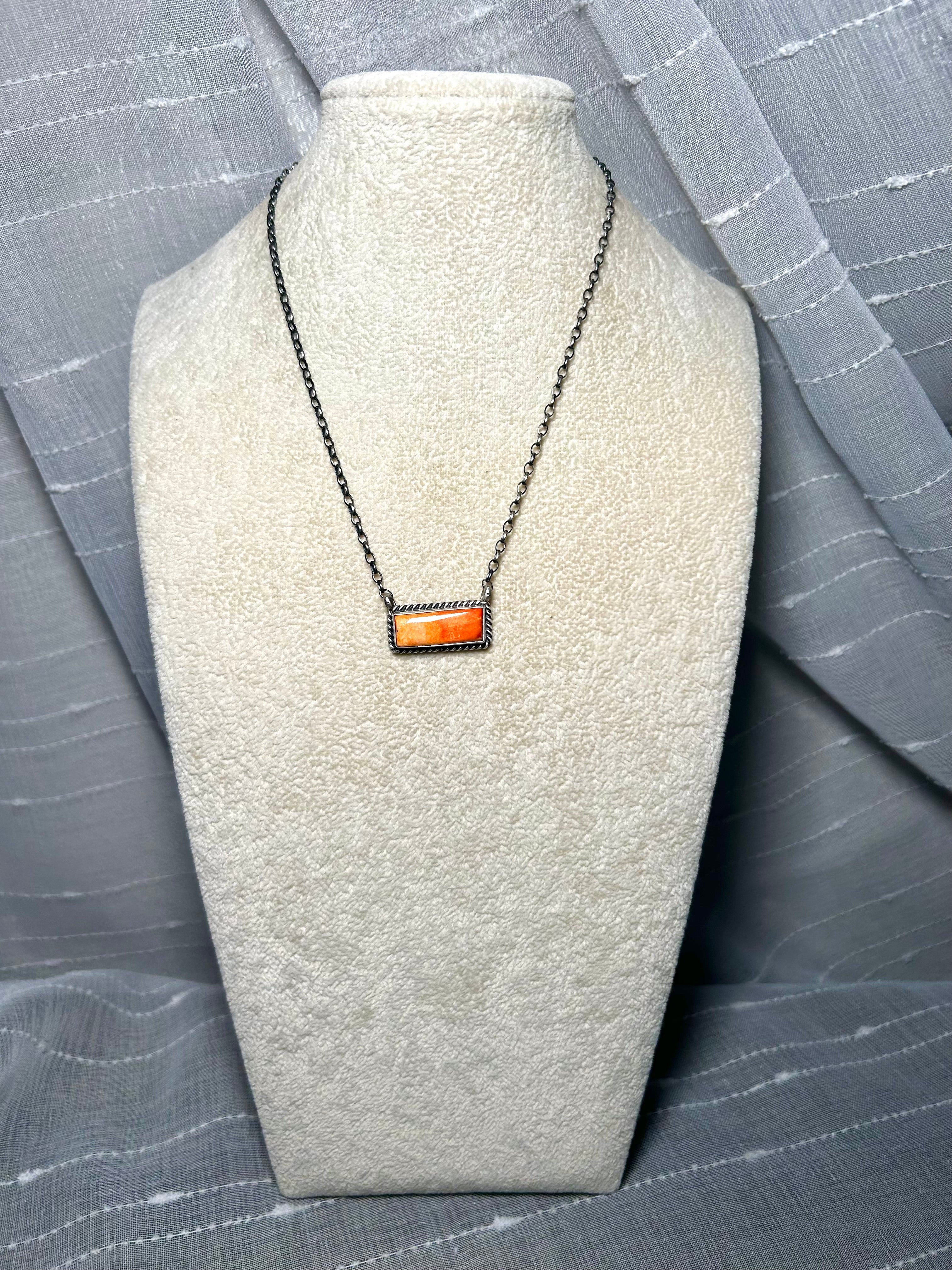 Chassily Belone Spiny Oyster & Sterling Silver Necklace. It measures 17 inches long with hang while the chain measures 16 inches long. Signed by the artist and stamped sterling silver.