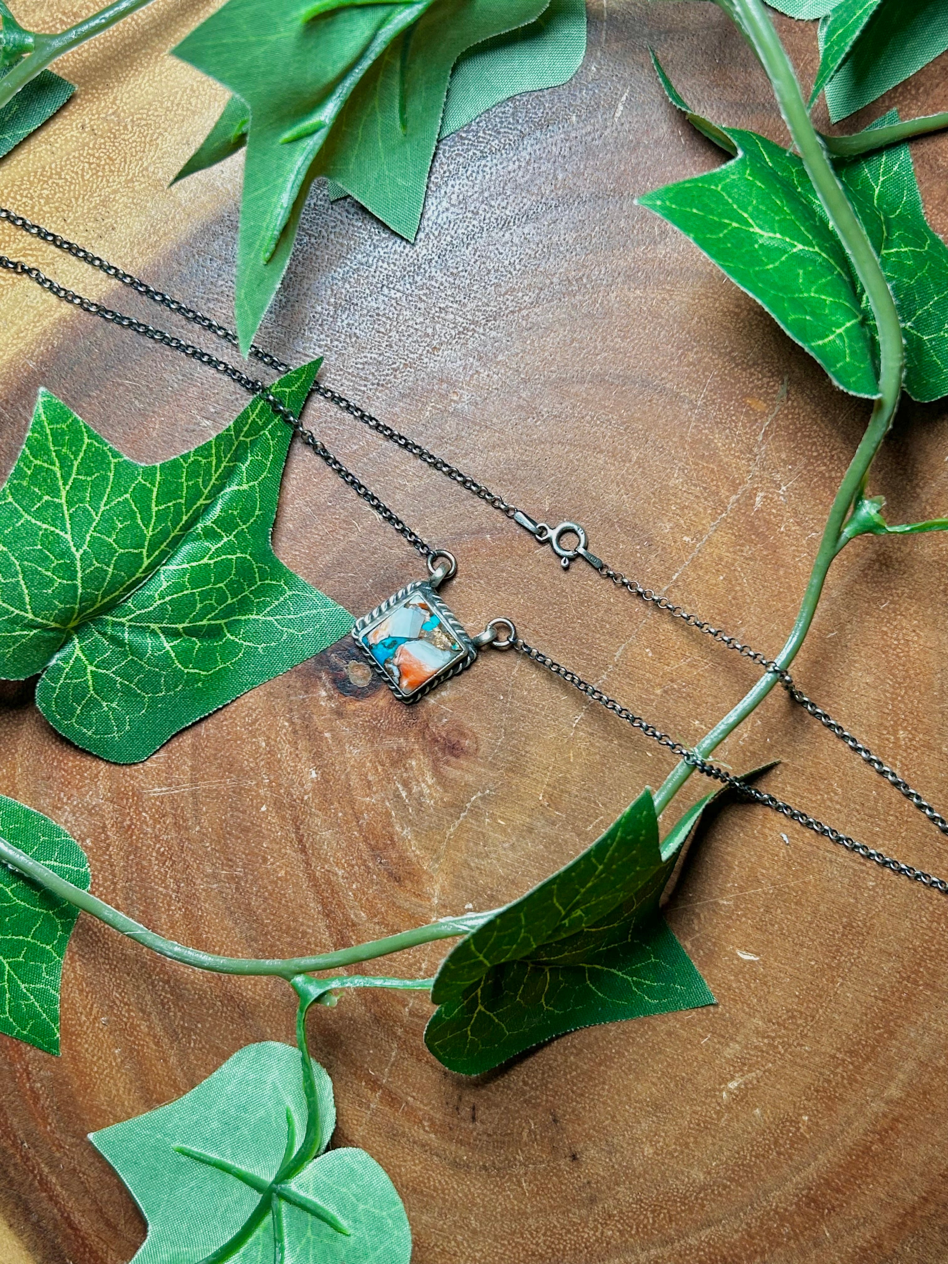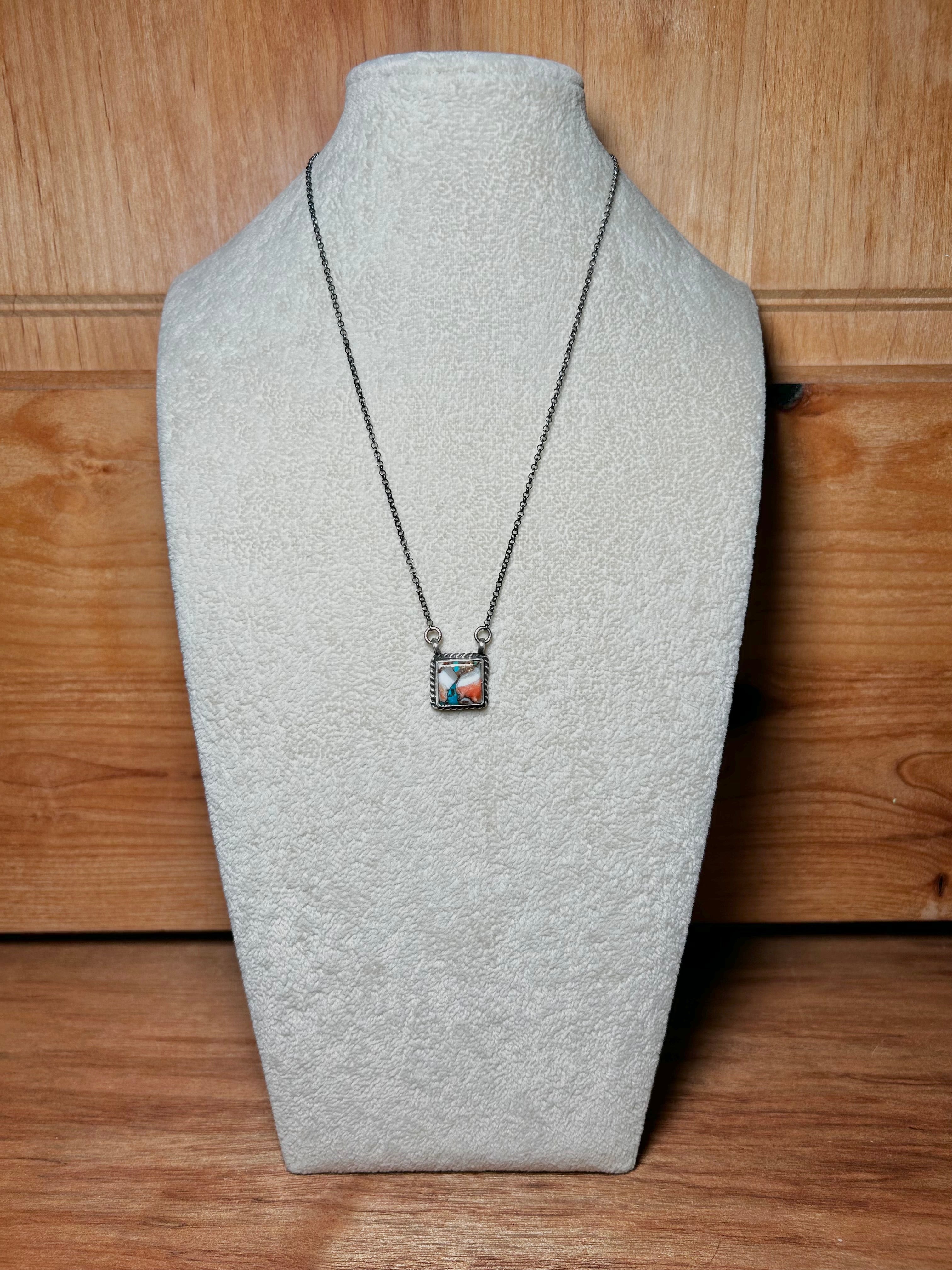 Johnny Dixon Mohave Turquoise & Sterling Silver Necklace. It measures 19 1/2 inches long with hang while the chain by itself measures 17 3/4 inches long. Signed by the artist and stamped sterling silver.