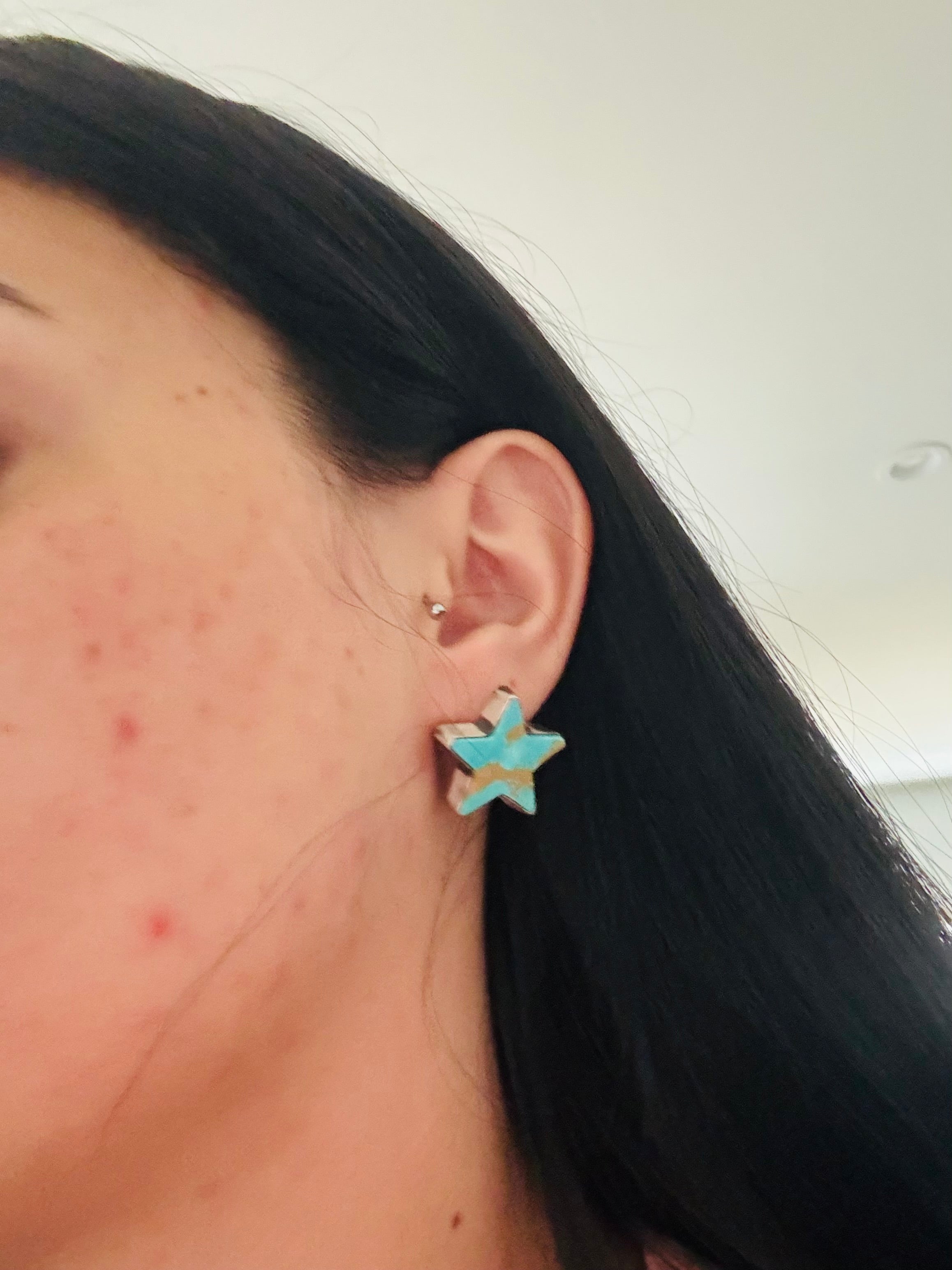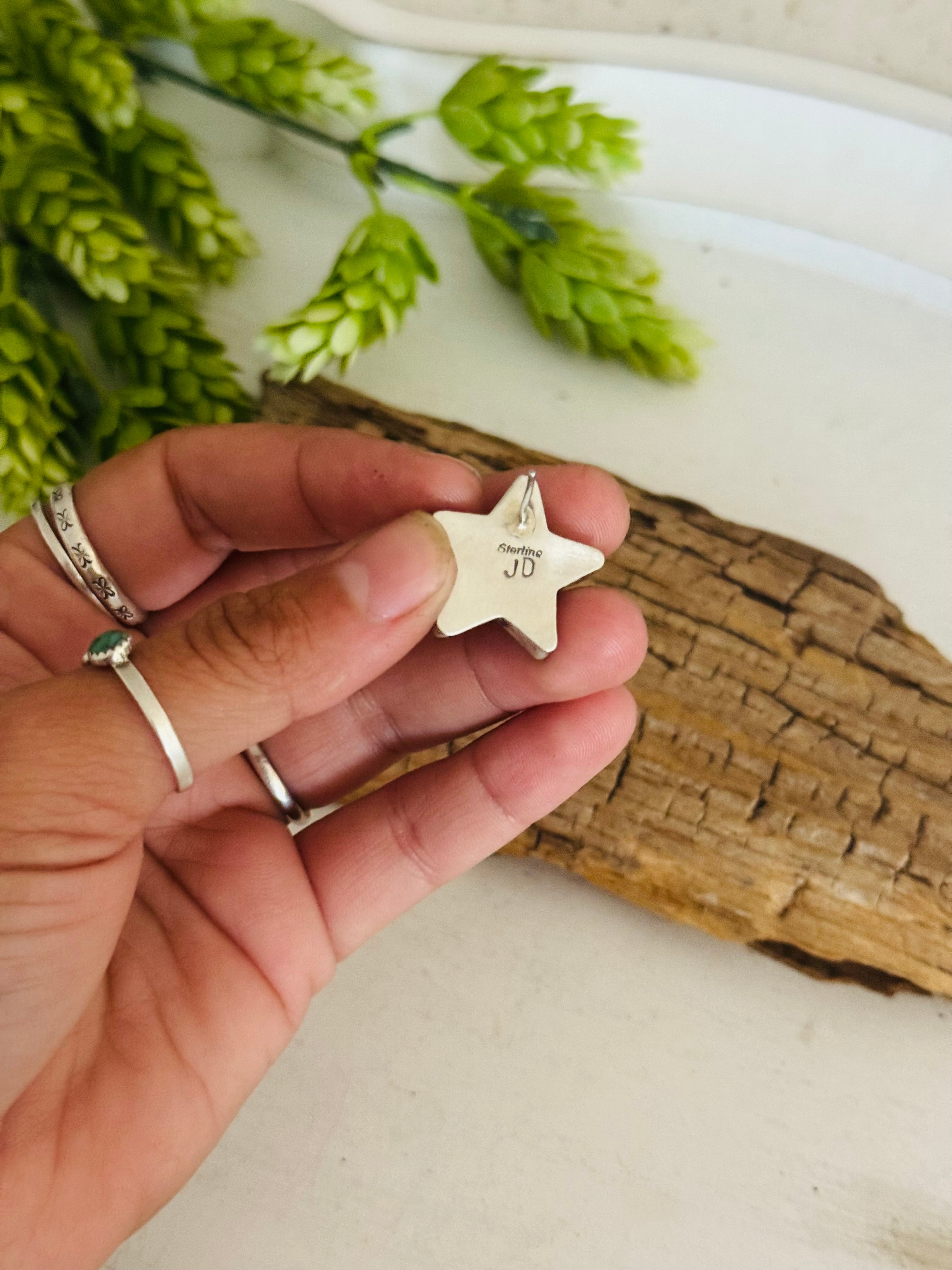 Johnny Dixon Kingman Turquoise & Sterling Silver Post Star Earrings. It measures 7/8 of an inch long and 7/8 of an inch wide. Signed by the artist and stamped sterling silver.