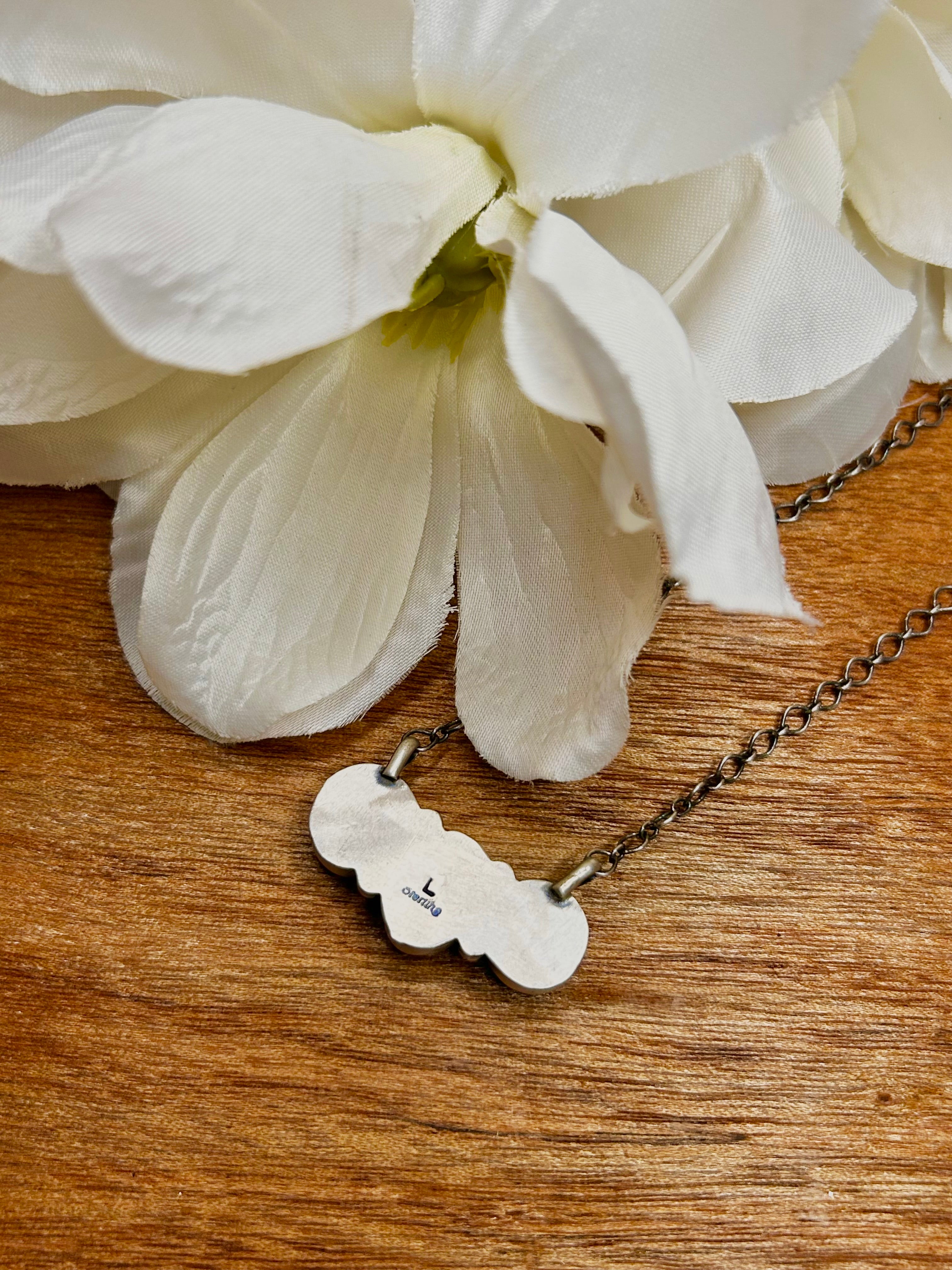 Lorenzo Juan Egyptian Blue Turquoise & Sterling Silver Necklace. It measures 20 inches long with hang while the chain by itself measures 18 1/2 inches long. Signed by the artist and stamped sterling silver.