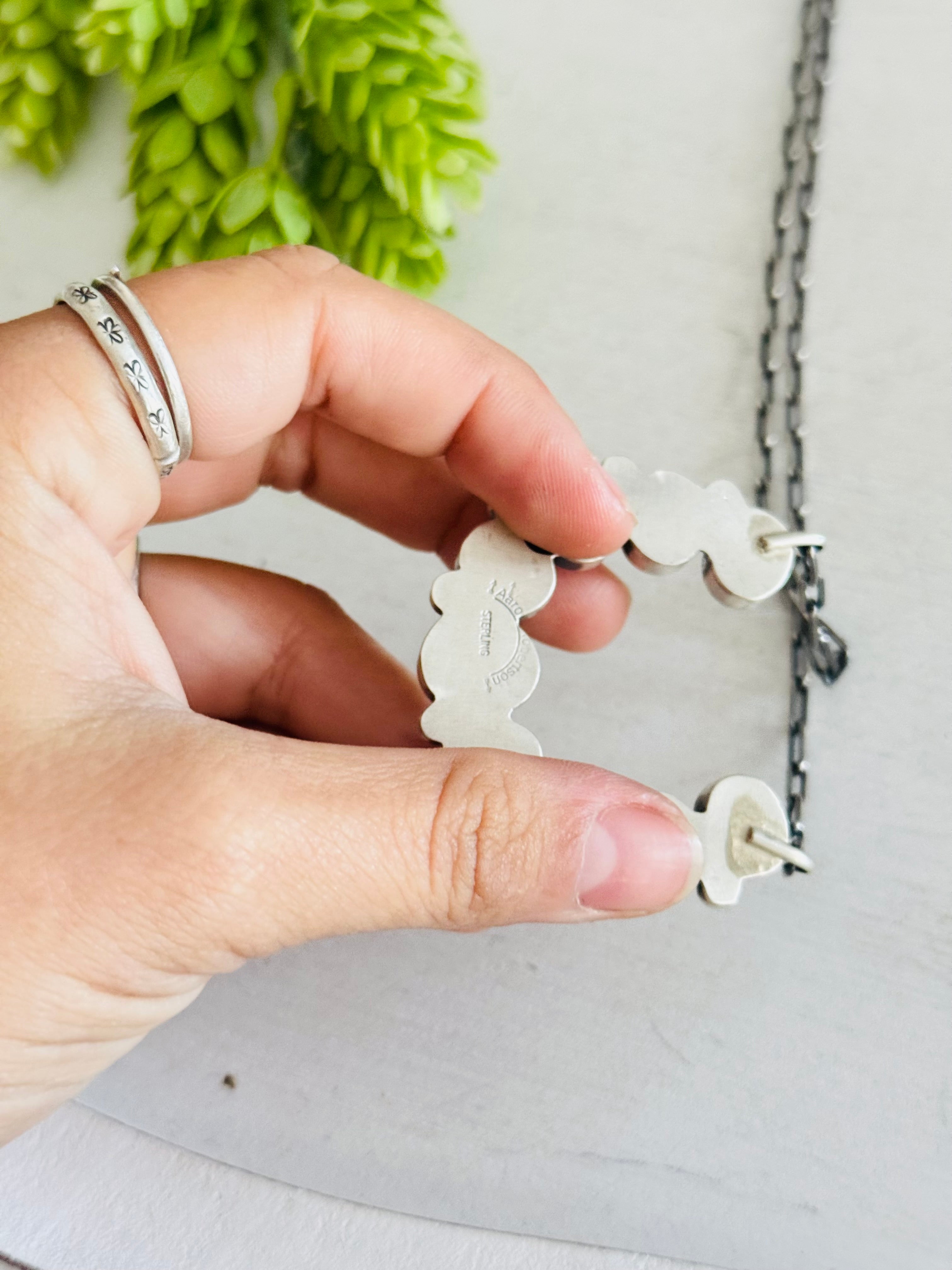 Aarron Robinson White Buffalo & Sterling Silver Naja Cluster Necklace. It measures 21 1/2 inches long with hang while the chain by itself measures 18 inches long but can be adjusted down. Signed by the artist and stamped sterling silver.