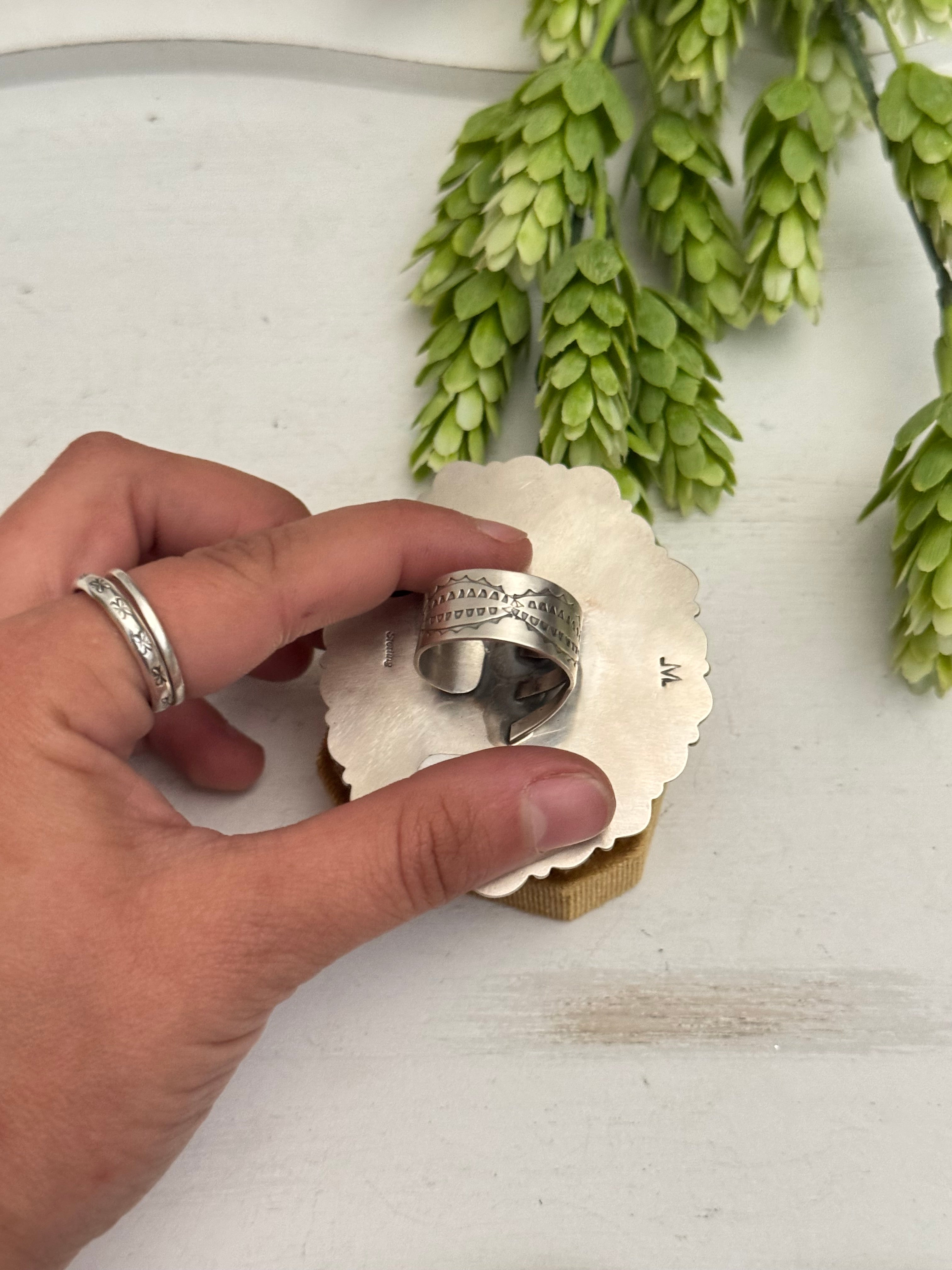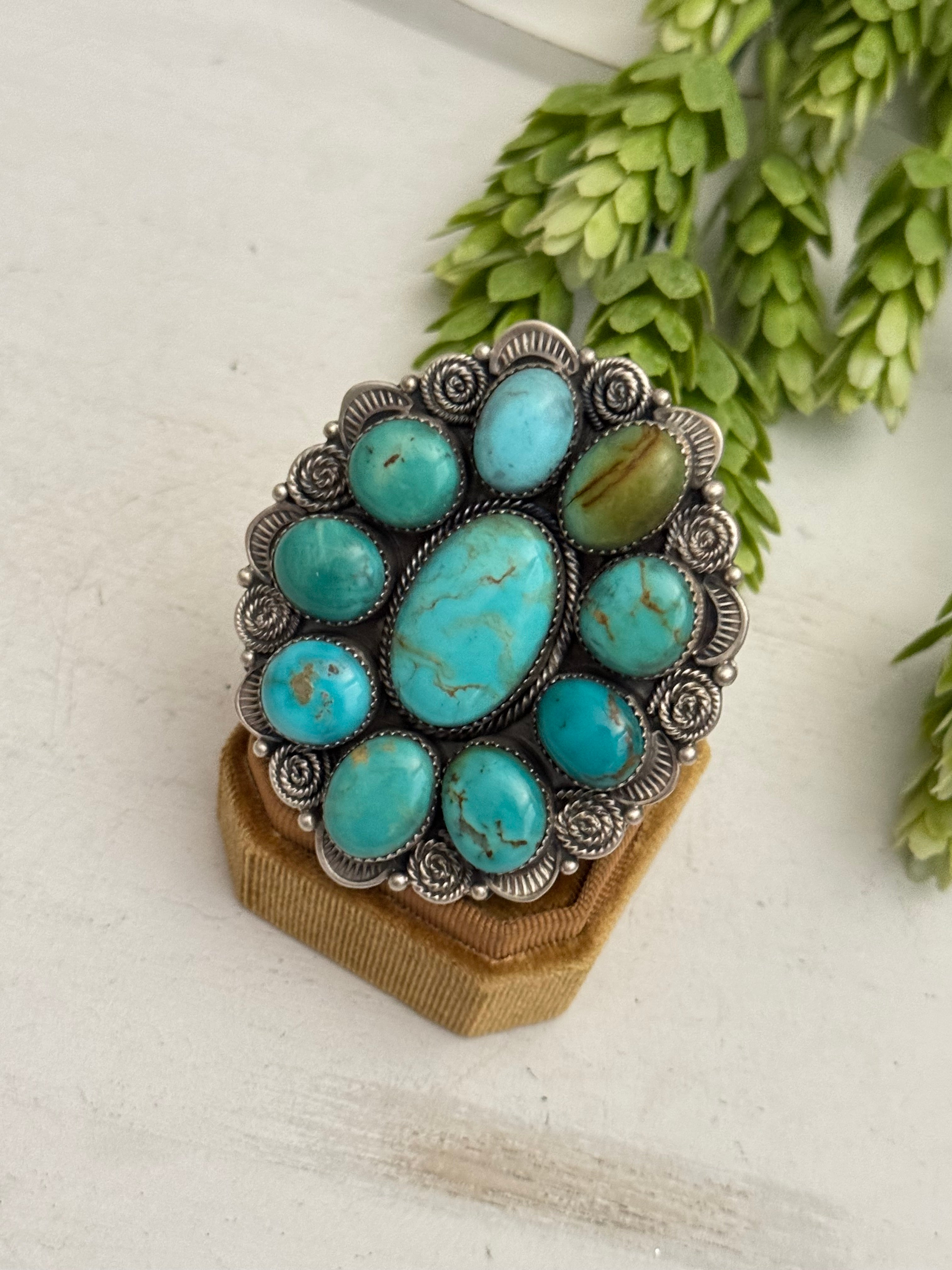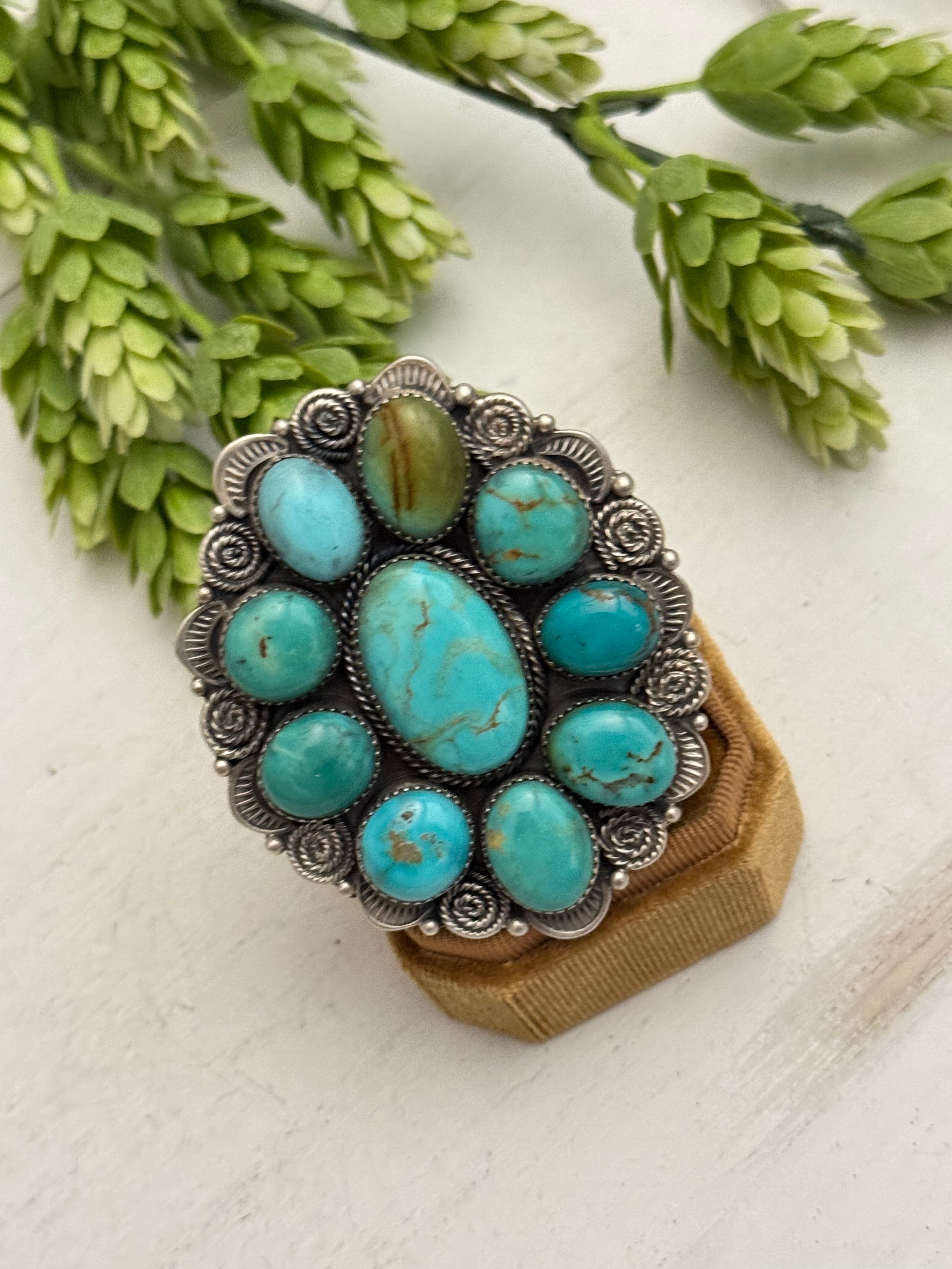 Juanita Long Kingman Turquoise & Sterling Silver Adjustable Cluster Ring. It measures 2 3/4 inches long and just over 2 1/4 inches wide. Signed by artist and stamped sterling silver.