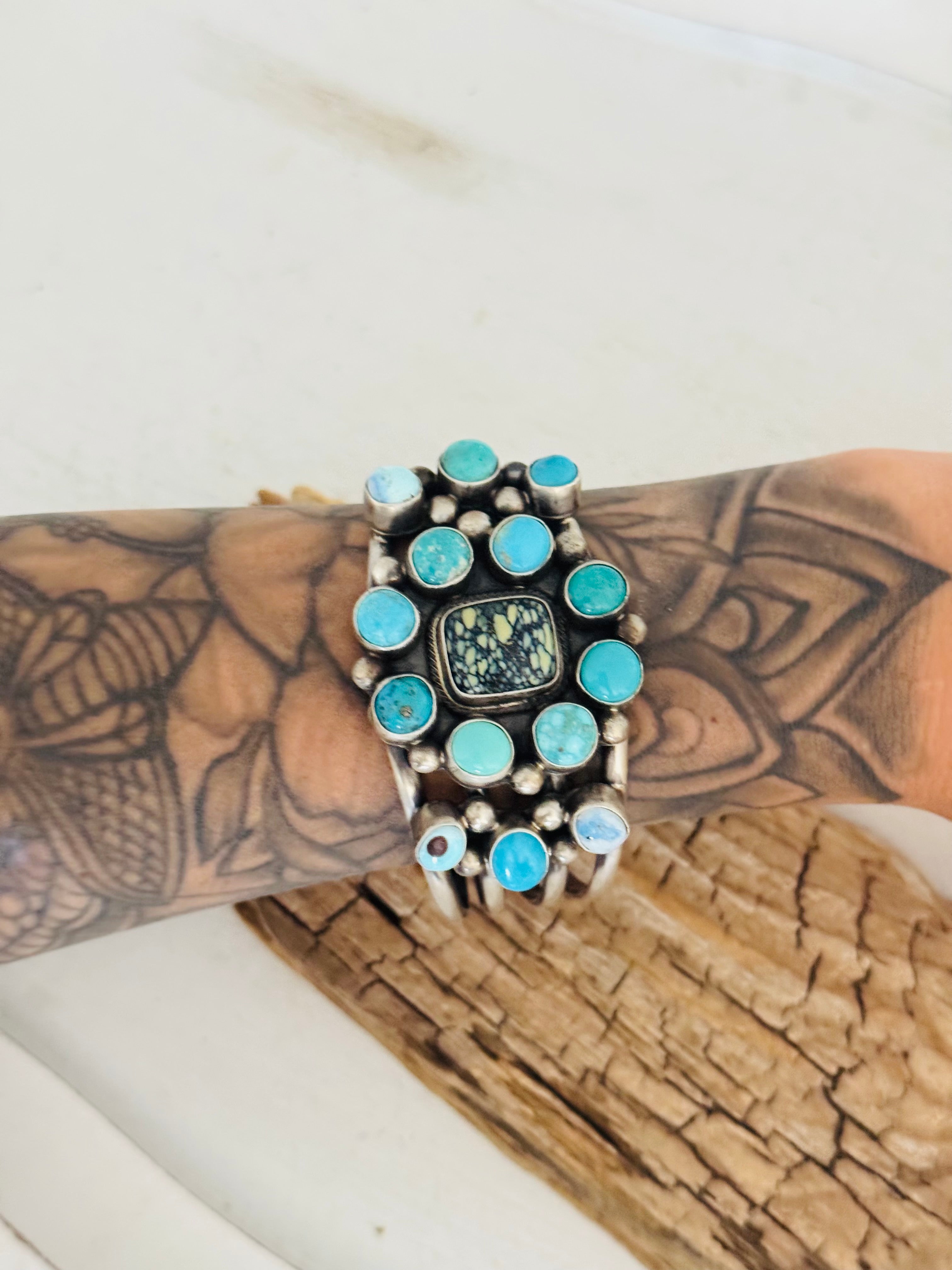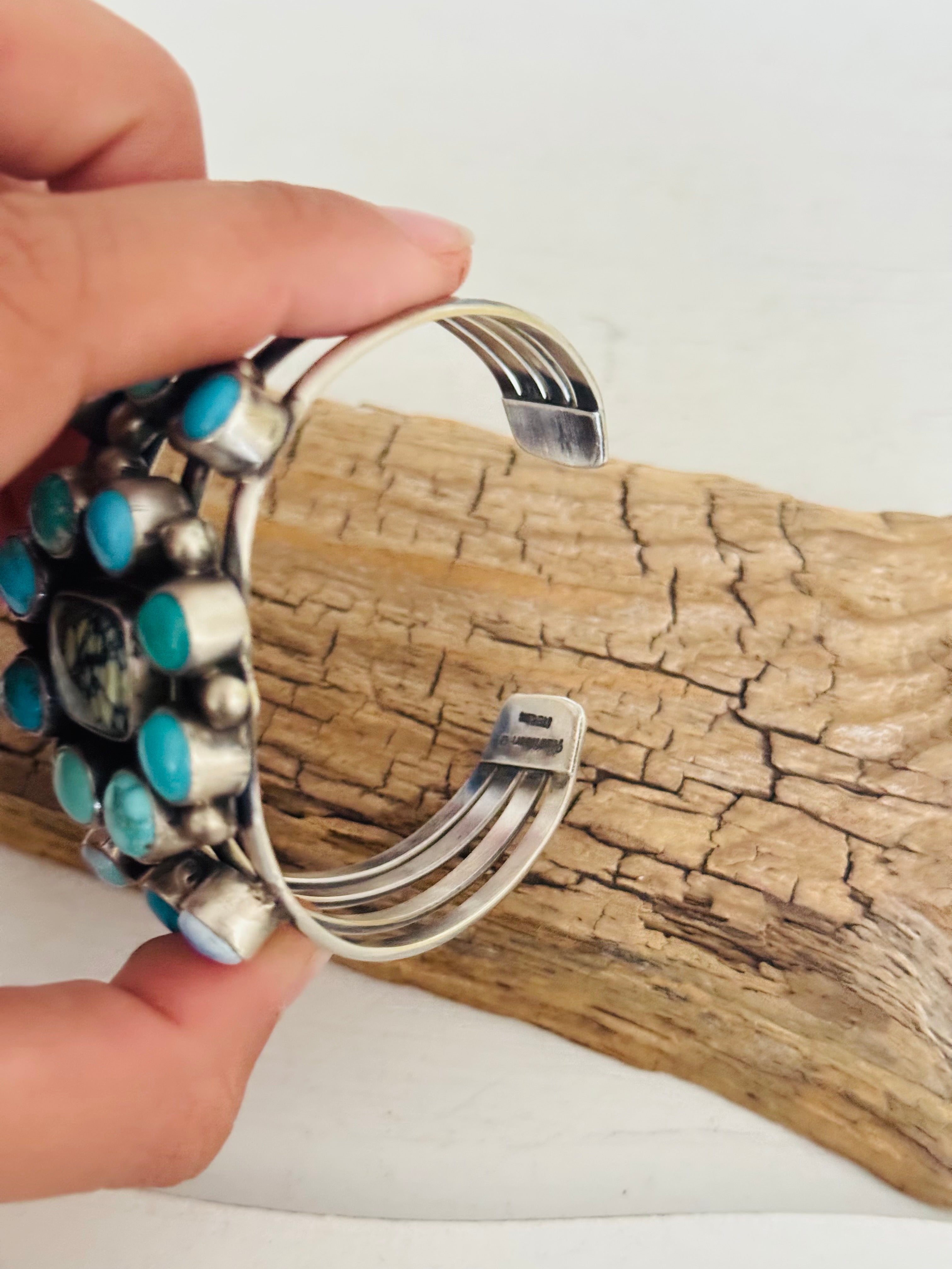 Kathleen Chavez Multi Stone & Sterling Silver Cluster Cuff Bracelet. It measures 1 1/2 inches wide with an inside circumference of 5 3/4 inches and a gap of 1 inch. Signed by the artist and stamped sterling silver.