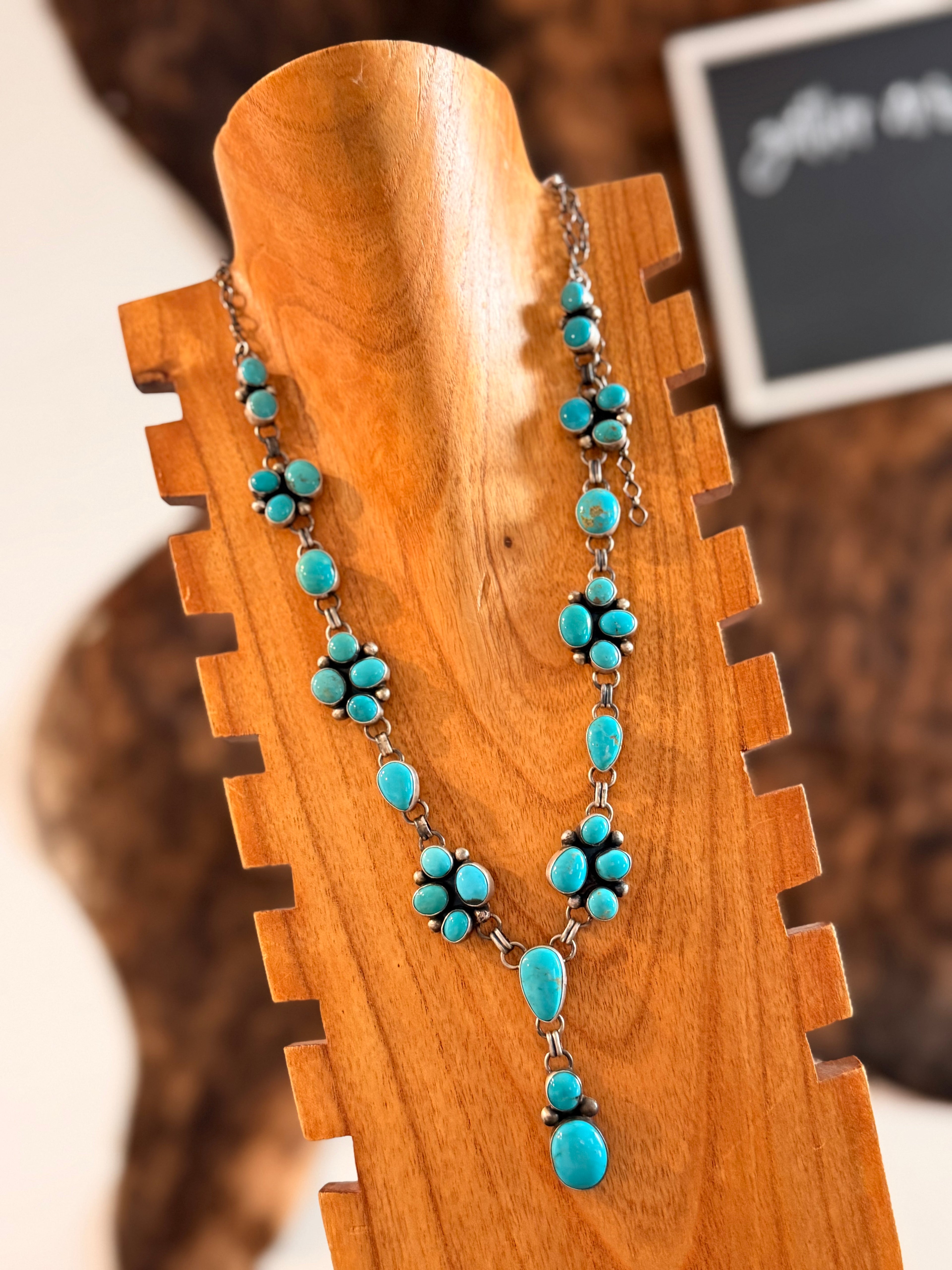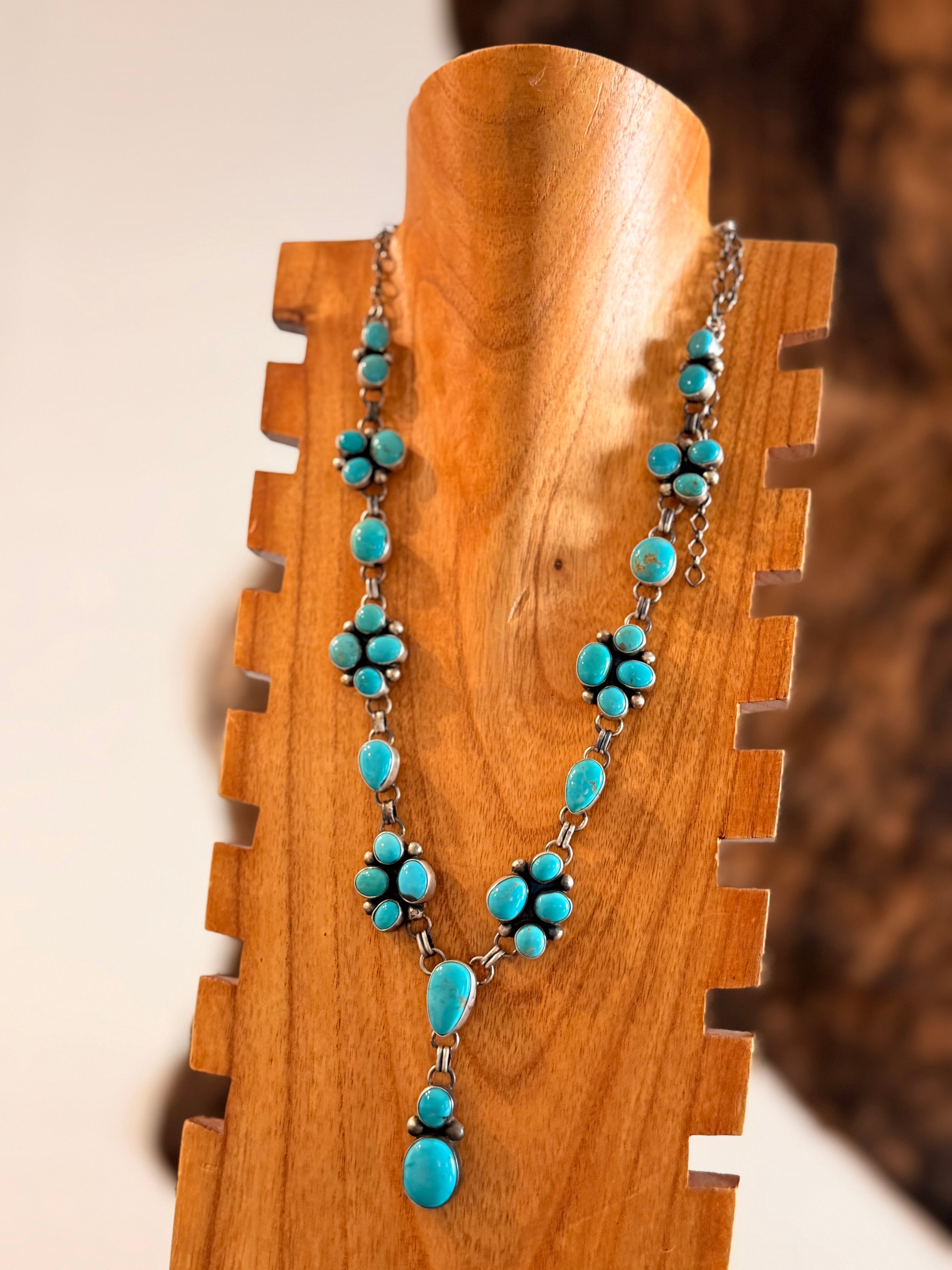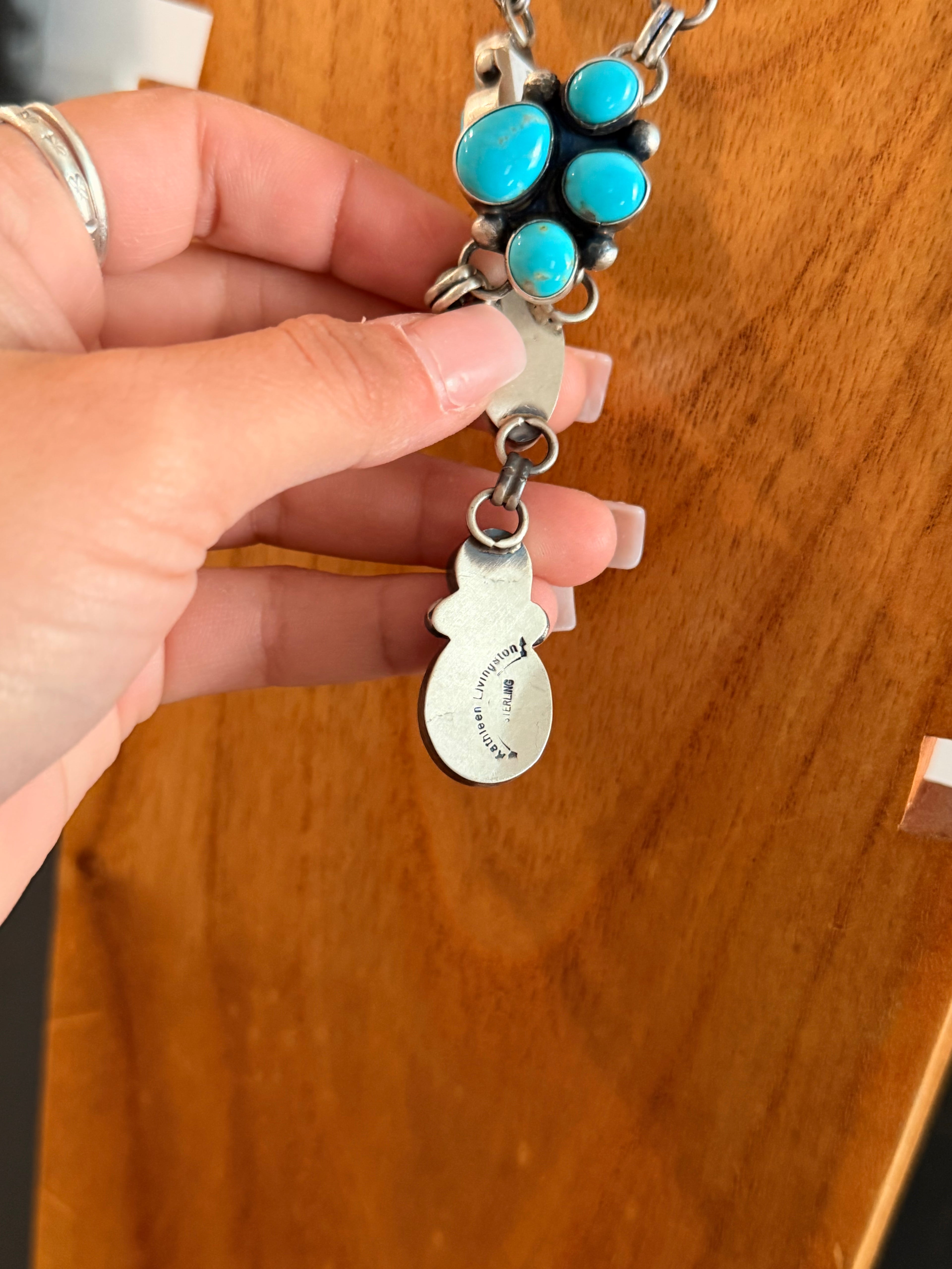 Kathleen Livingston Kingman Turquoise & Sterling Silver Lariat Necklace Set. It measures 32 1/2 inches long with hang while the chain measures 28 inches long. Signed by the artist and stamped sterling silver.