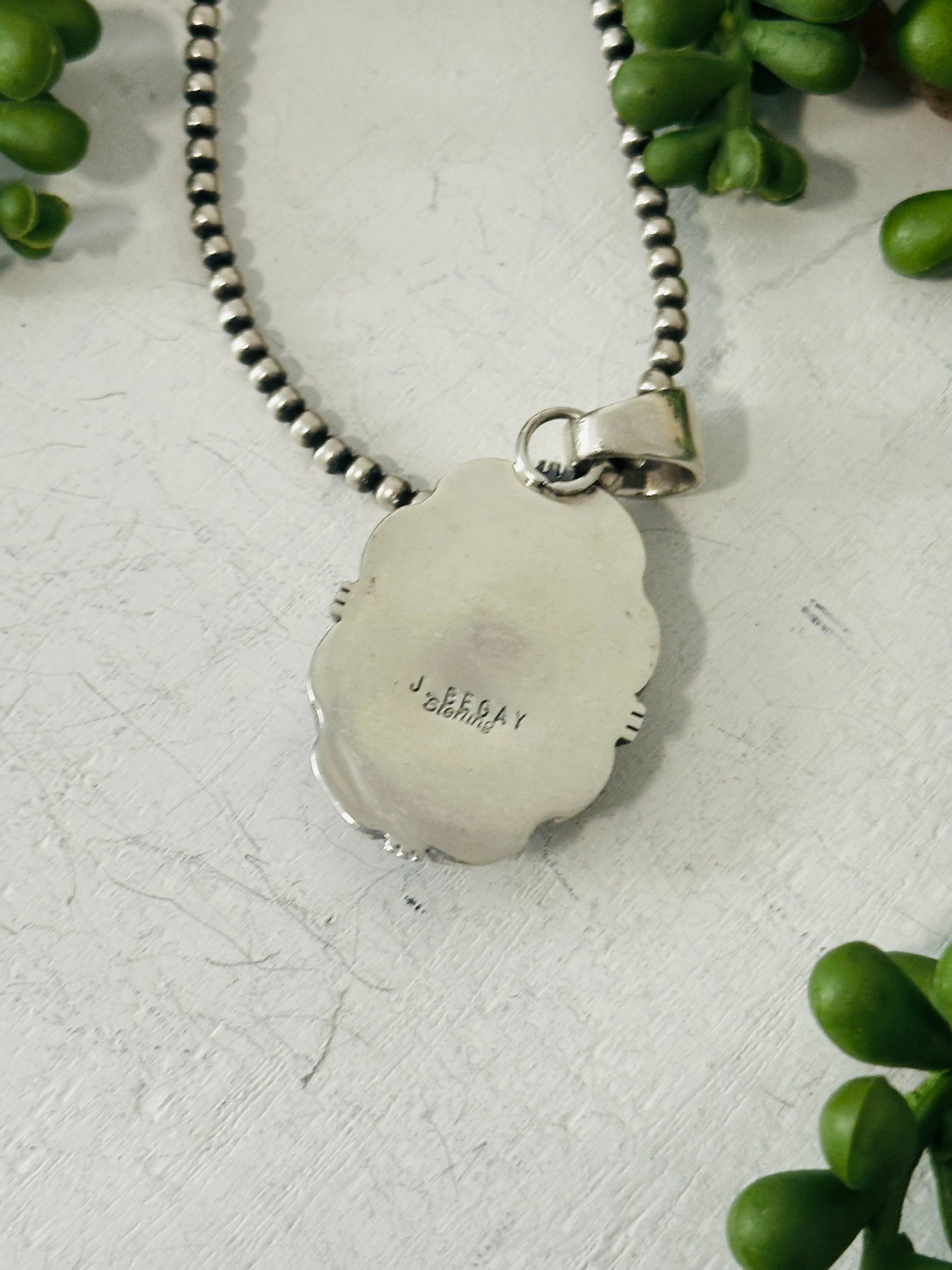 John Begay Kingman Turquoise & Sterling Silver Pendant. It measures 1 7/8 inches long and 1 inch wide. Pendant Only!! Signed by the artist and stamped sterling silver.