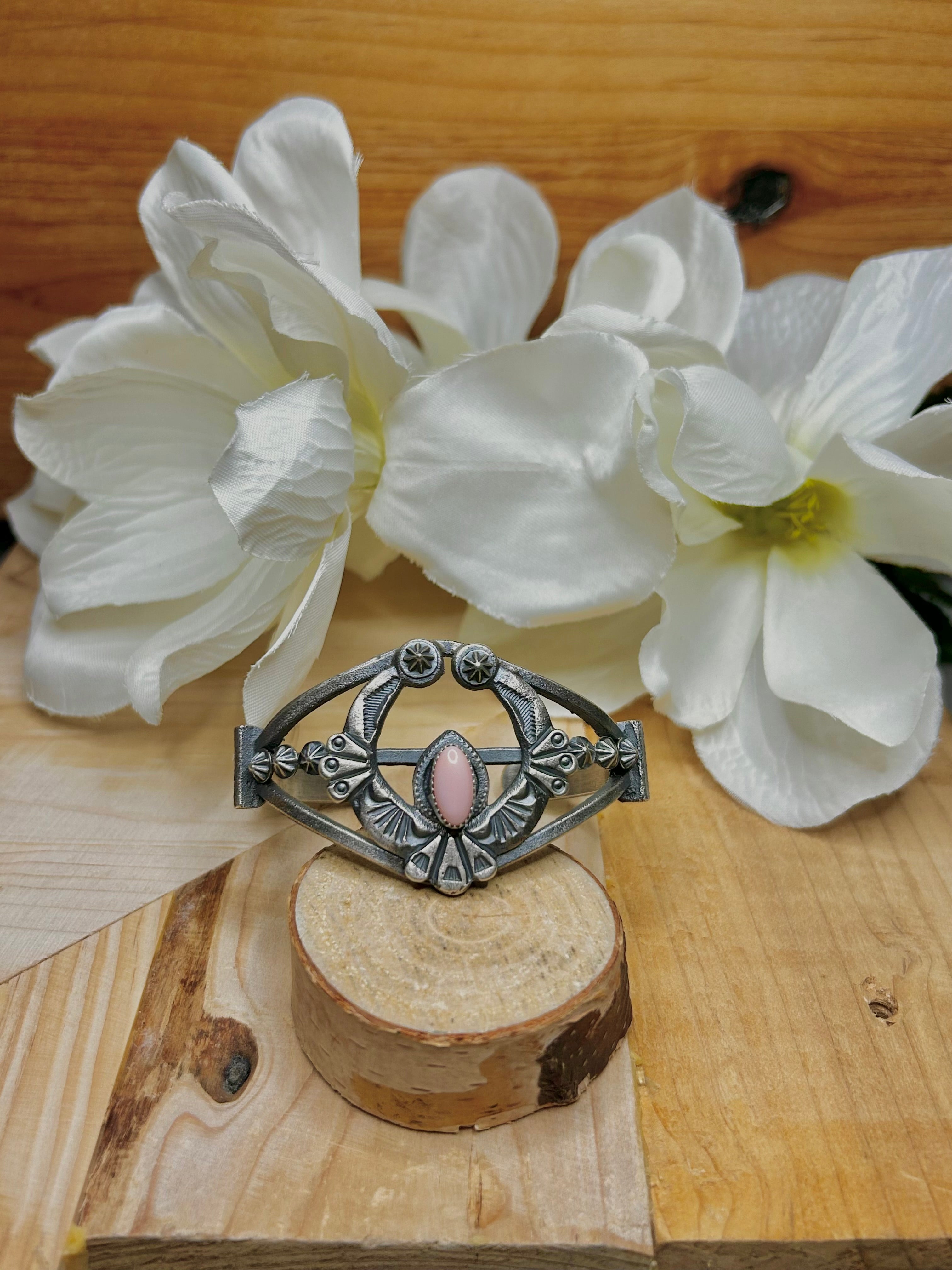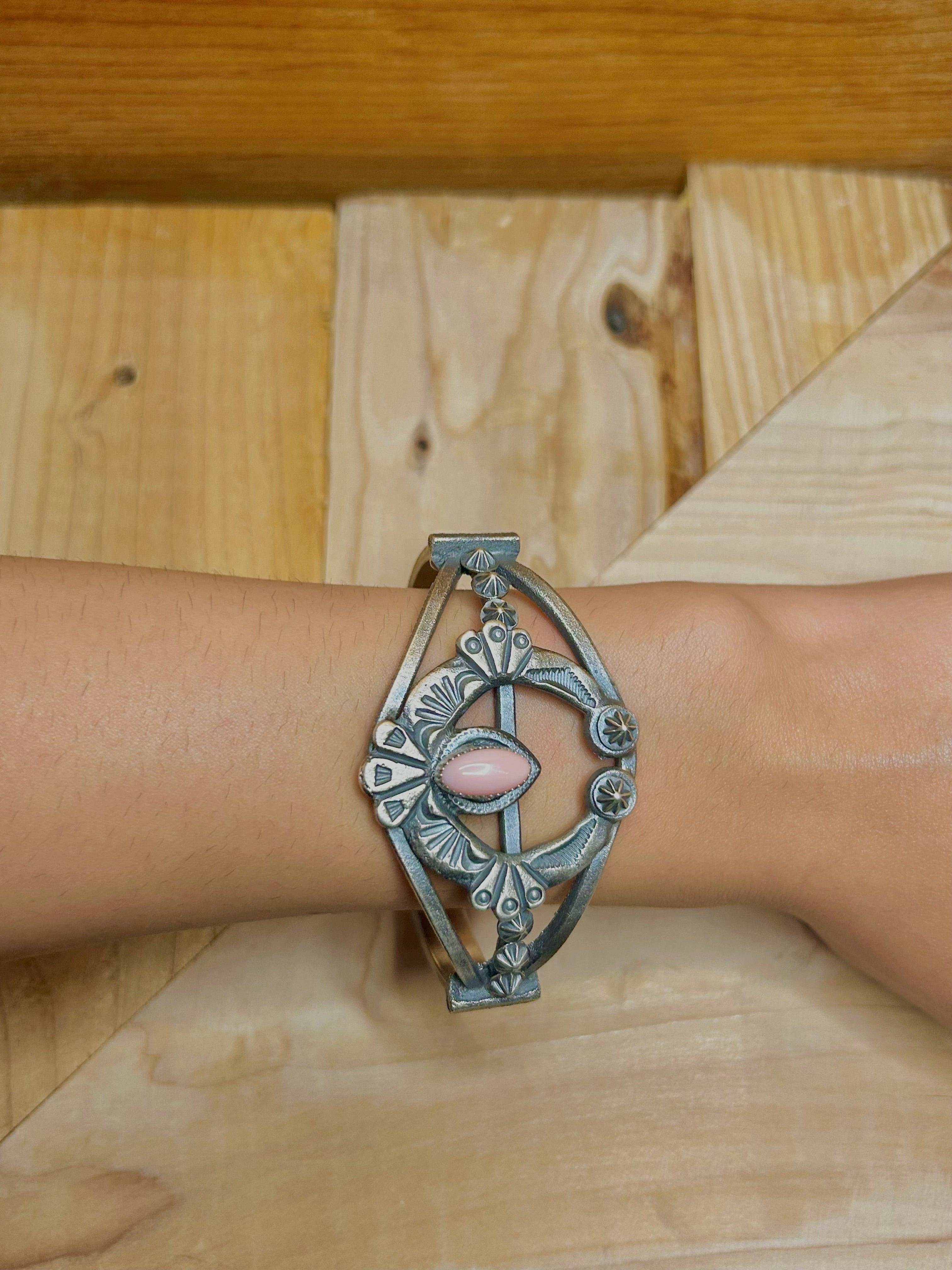 Kindale Billah Made Pink Conch & Sterling Silver Cuff Bracelet. It measures 1 1/2 inches wide with an inside circumference of 6 1/8 inches and a gap of 1 inch. Signed by the artist and stamped sterling silver.