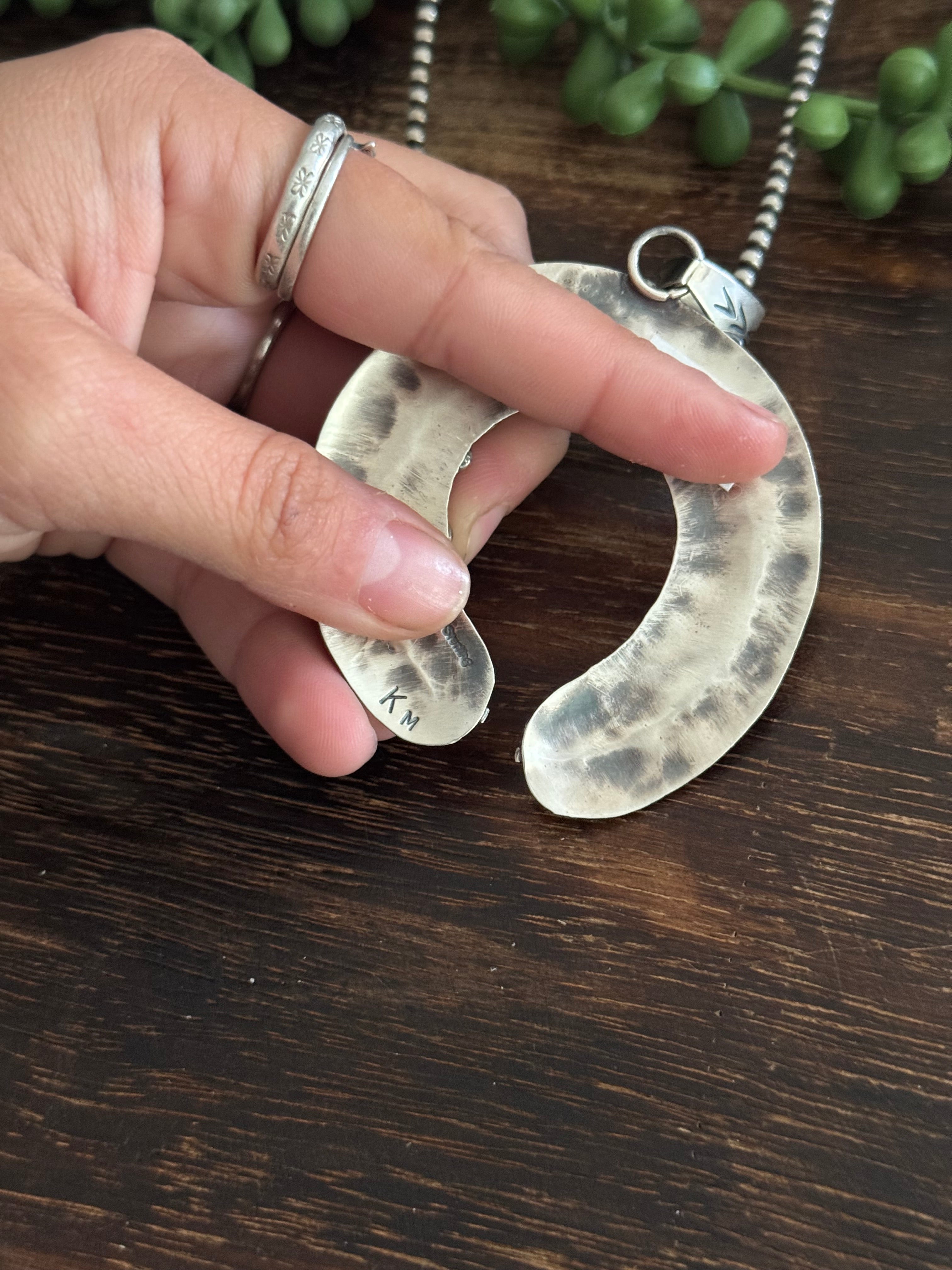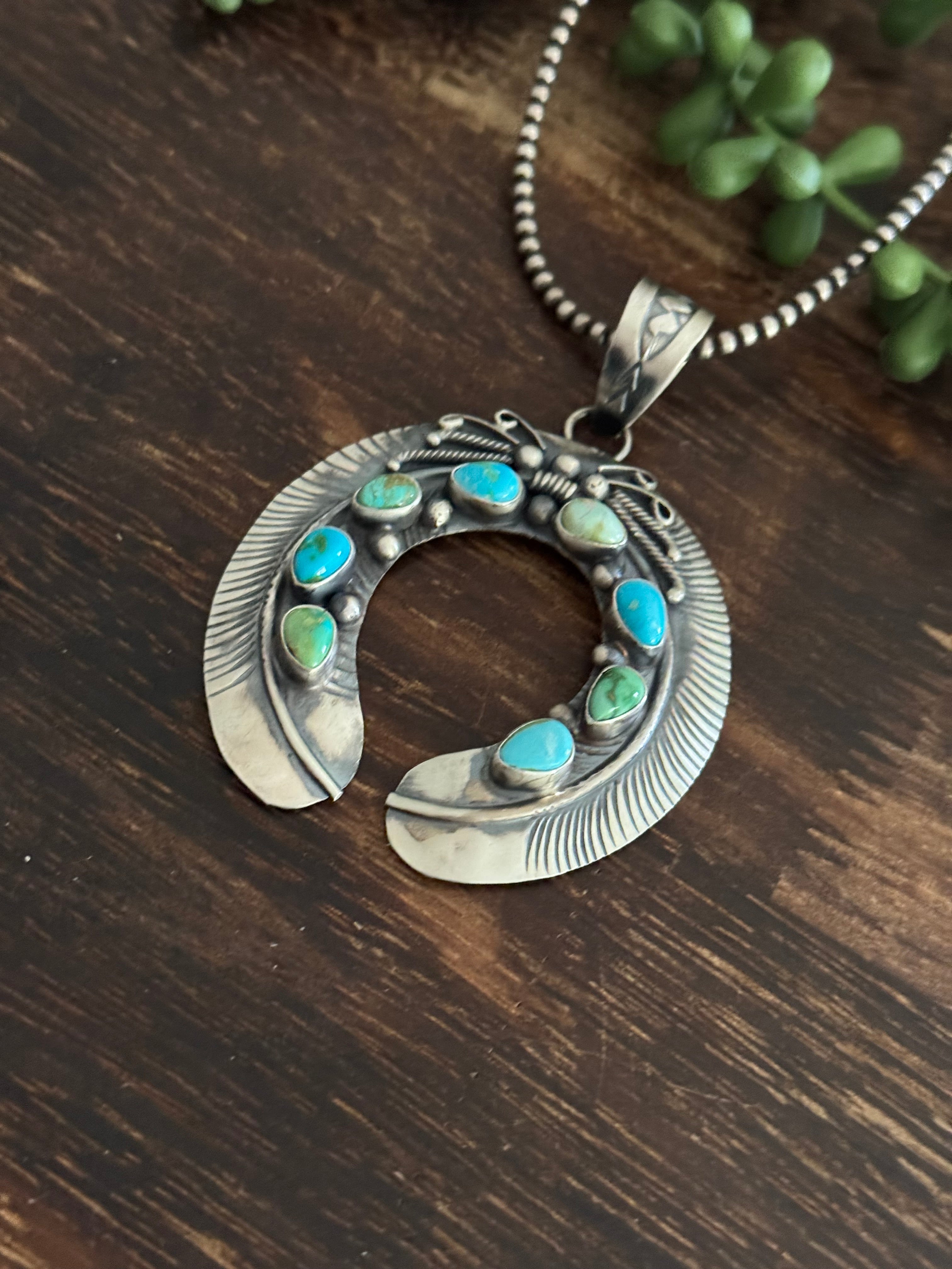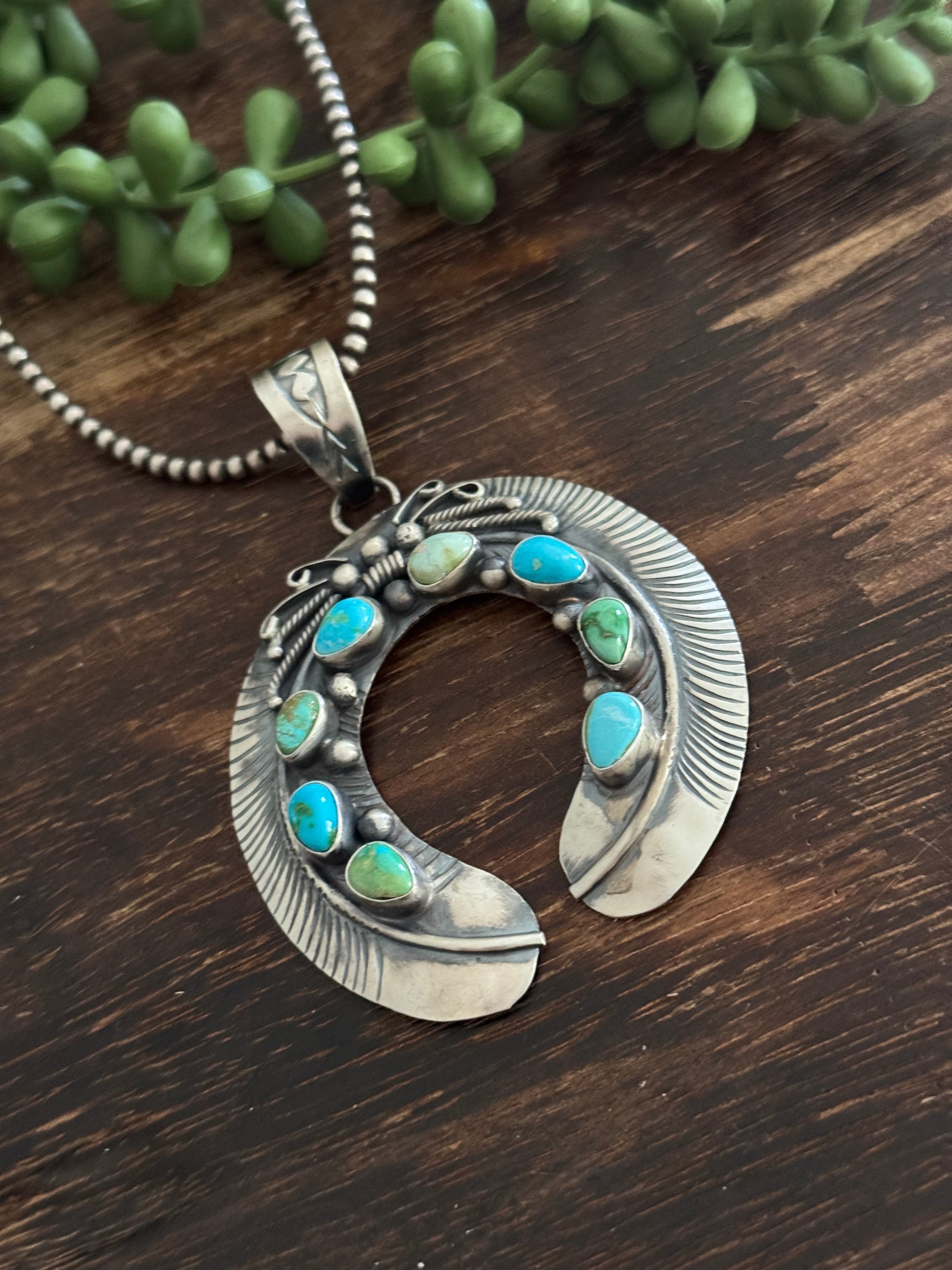 Kobe Martine Sonoran Mountain Turquoise & Sterling Silver Naja Pendant. It measures 3 1/2 inches long and 2 1/2 inches wide. Pendant Only! Signed by the artist and stamped sterling silver.
