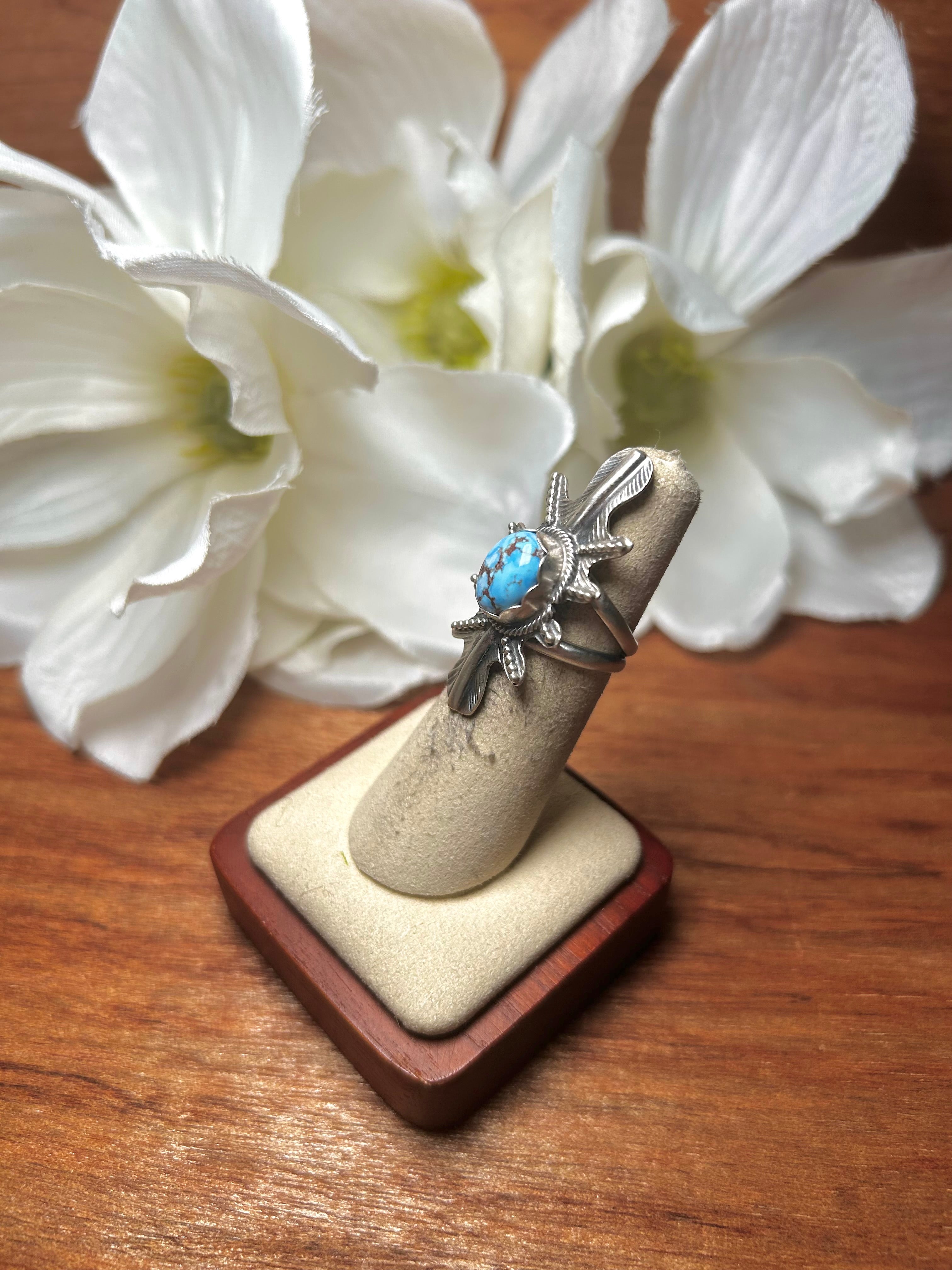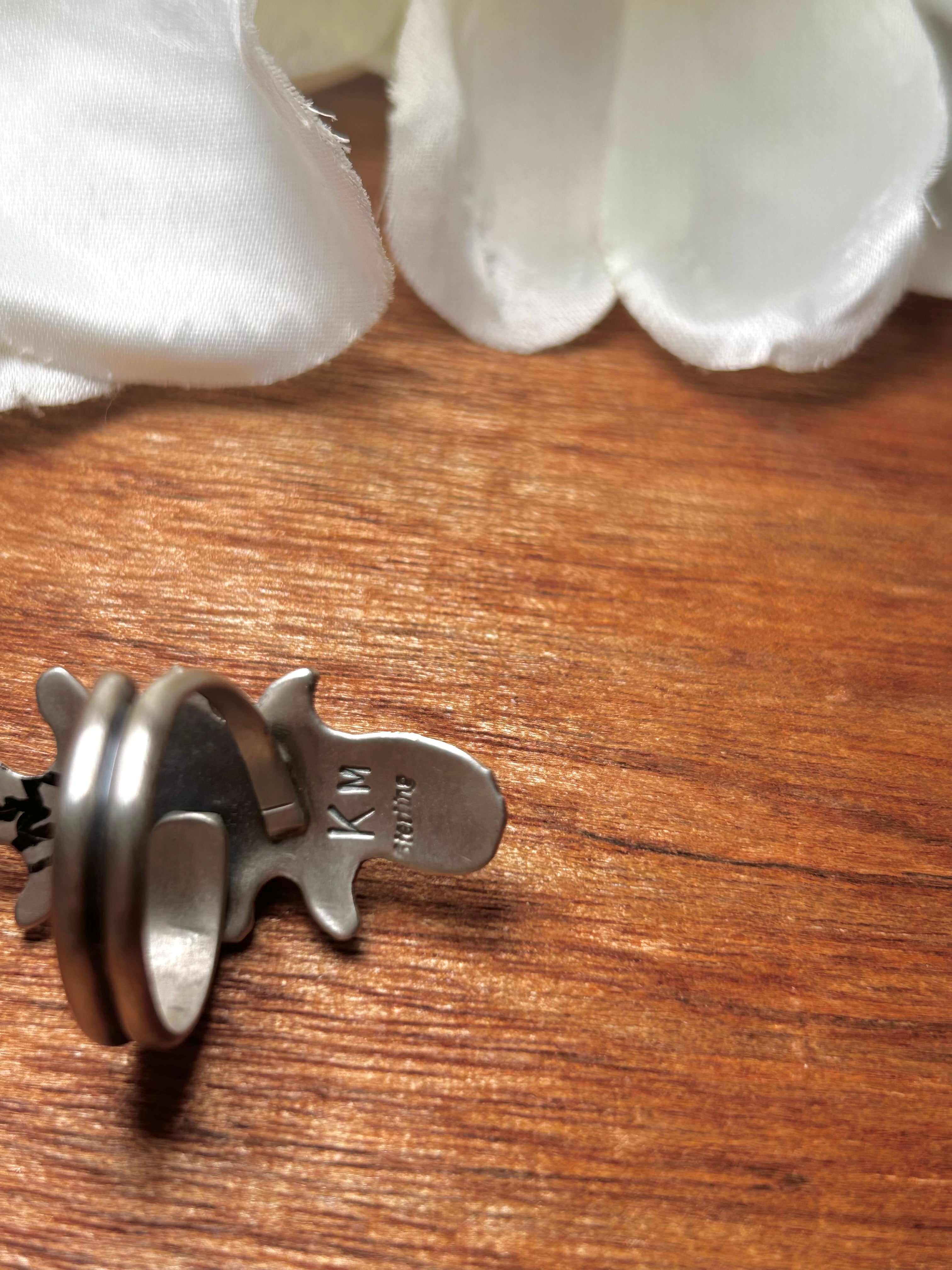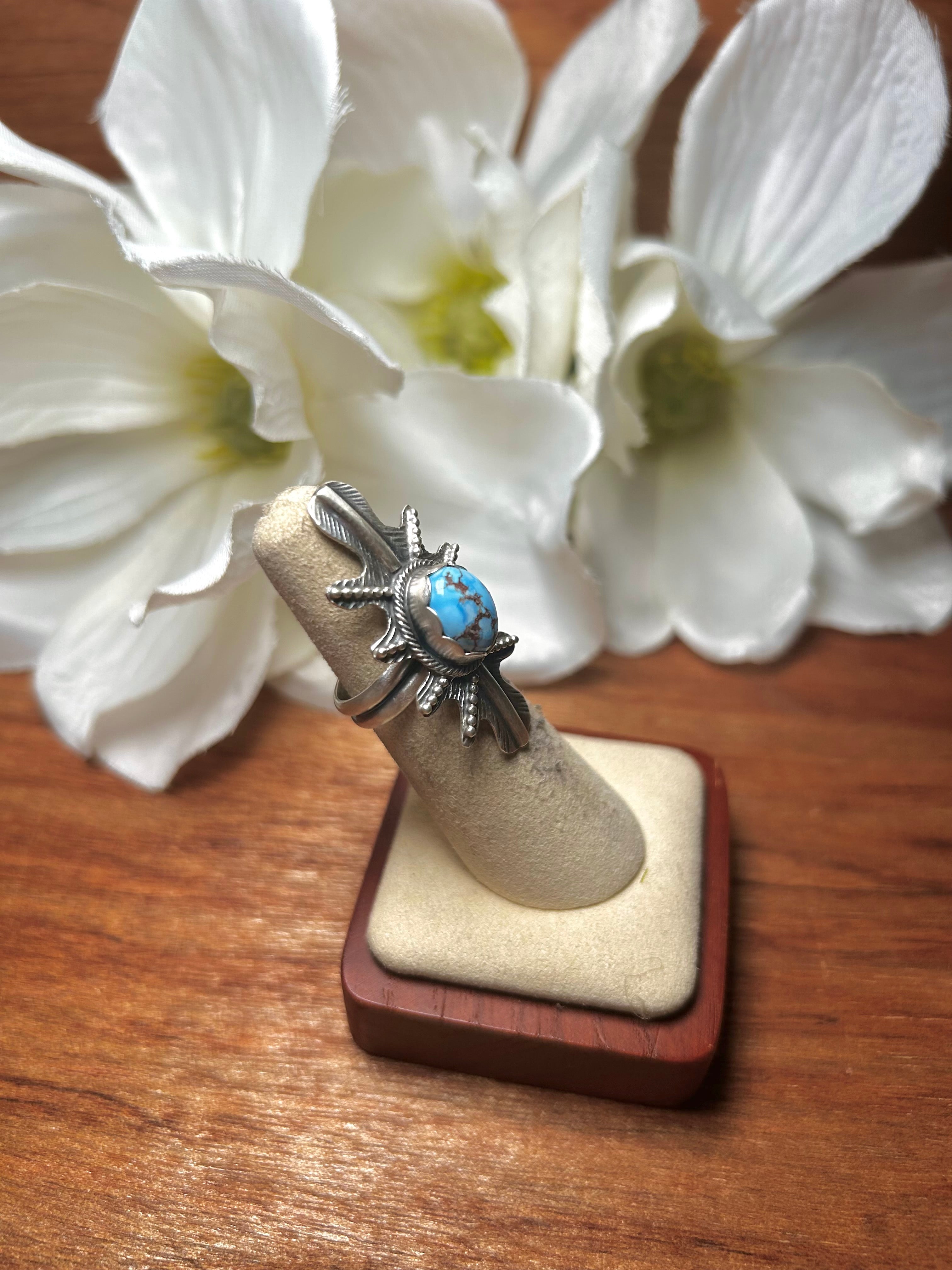 Kobe Martinez Golden Hill Turquoise & Sterling Silver Adjustable Ring. It measures 1 1/2 inches long and 3/4 of an inch wide. Signed by the artist. Stones will vary due to natural stones.