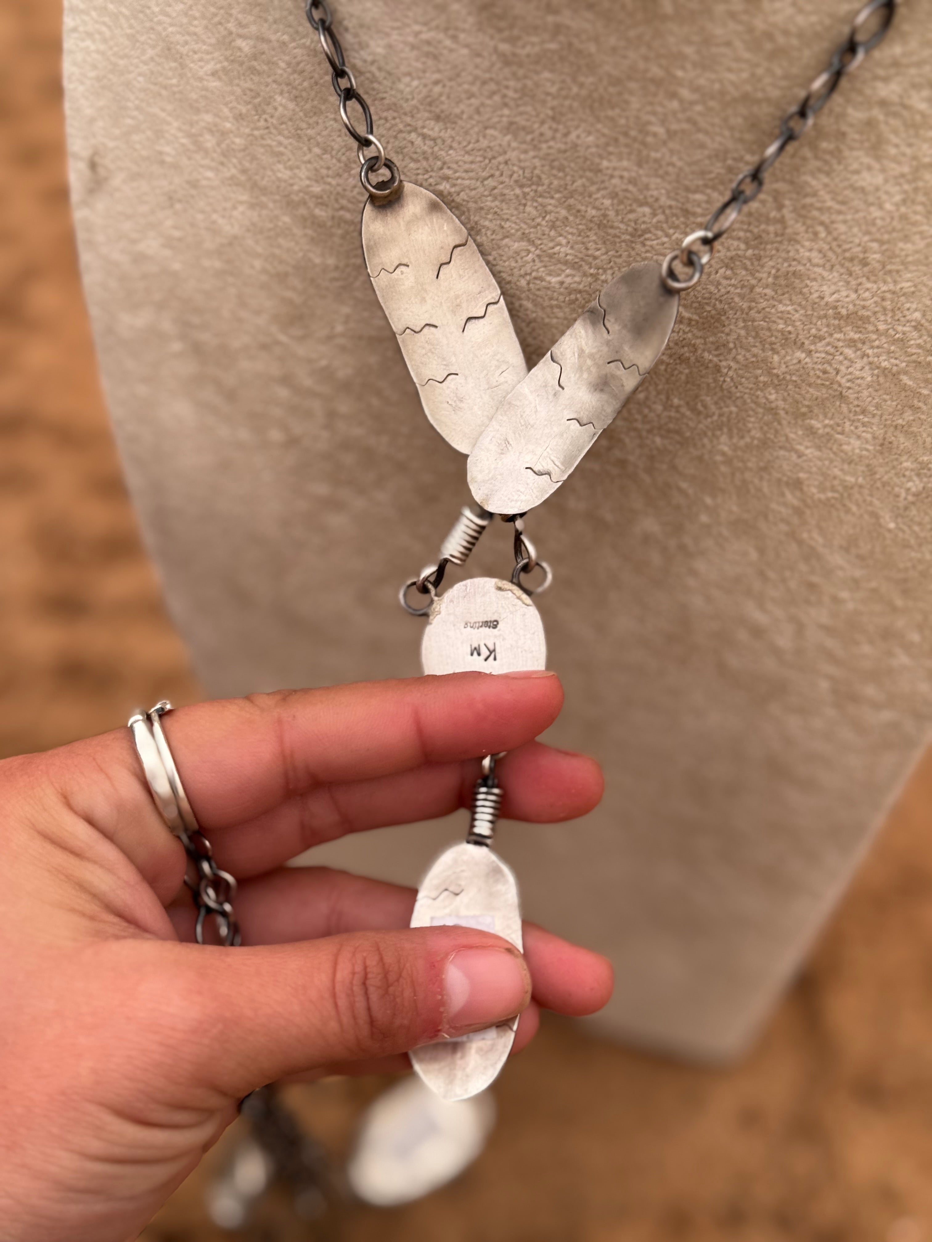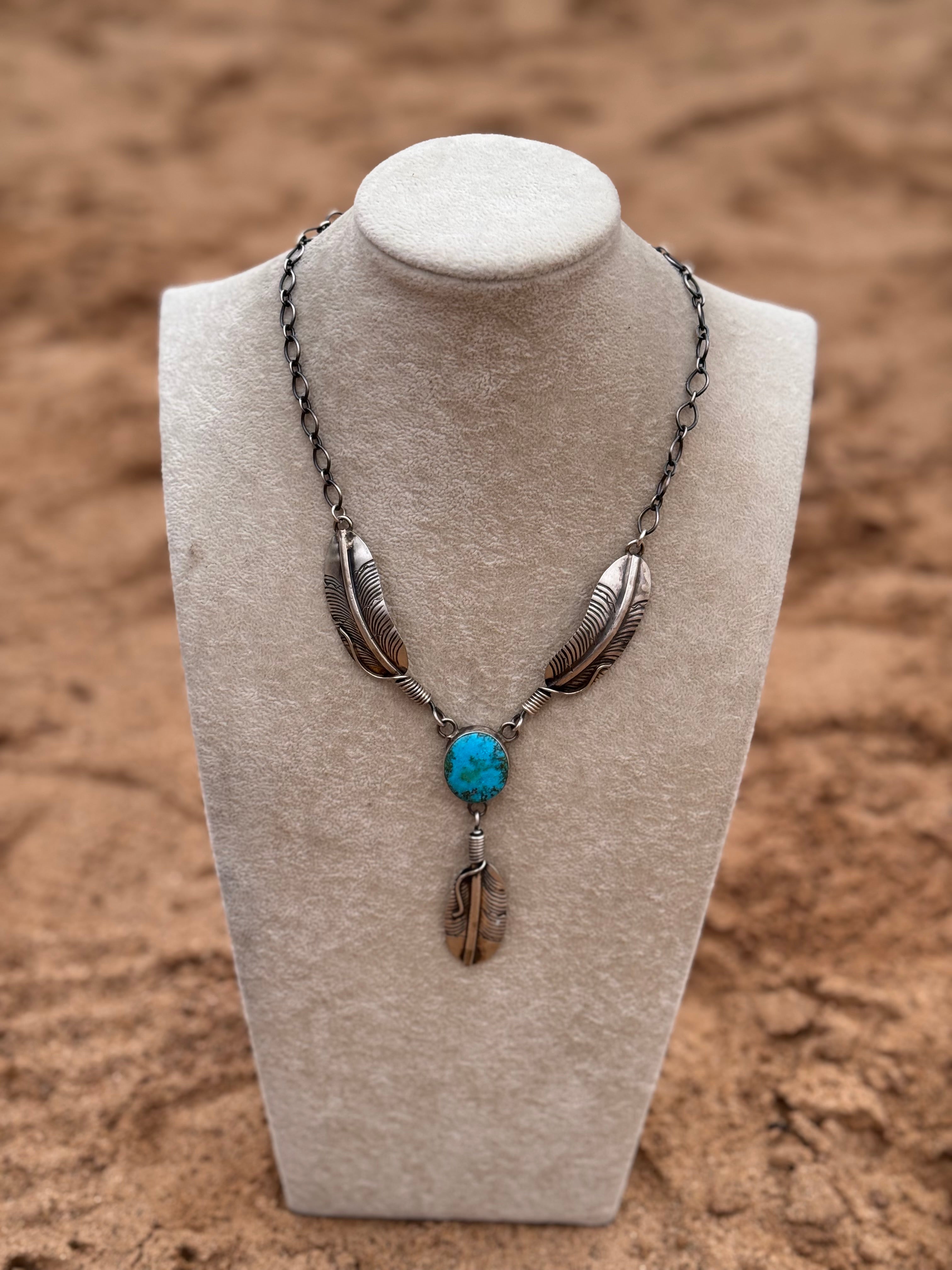 Kobe Martinez Royston Turquoise and Sterling Silver Feather Necklace. The necklace measures 23 1/2 inches long, while the chain only measures 17 inches long . Signed by the artist and stamped sterling silver.