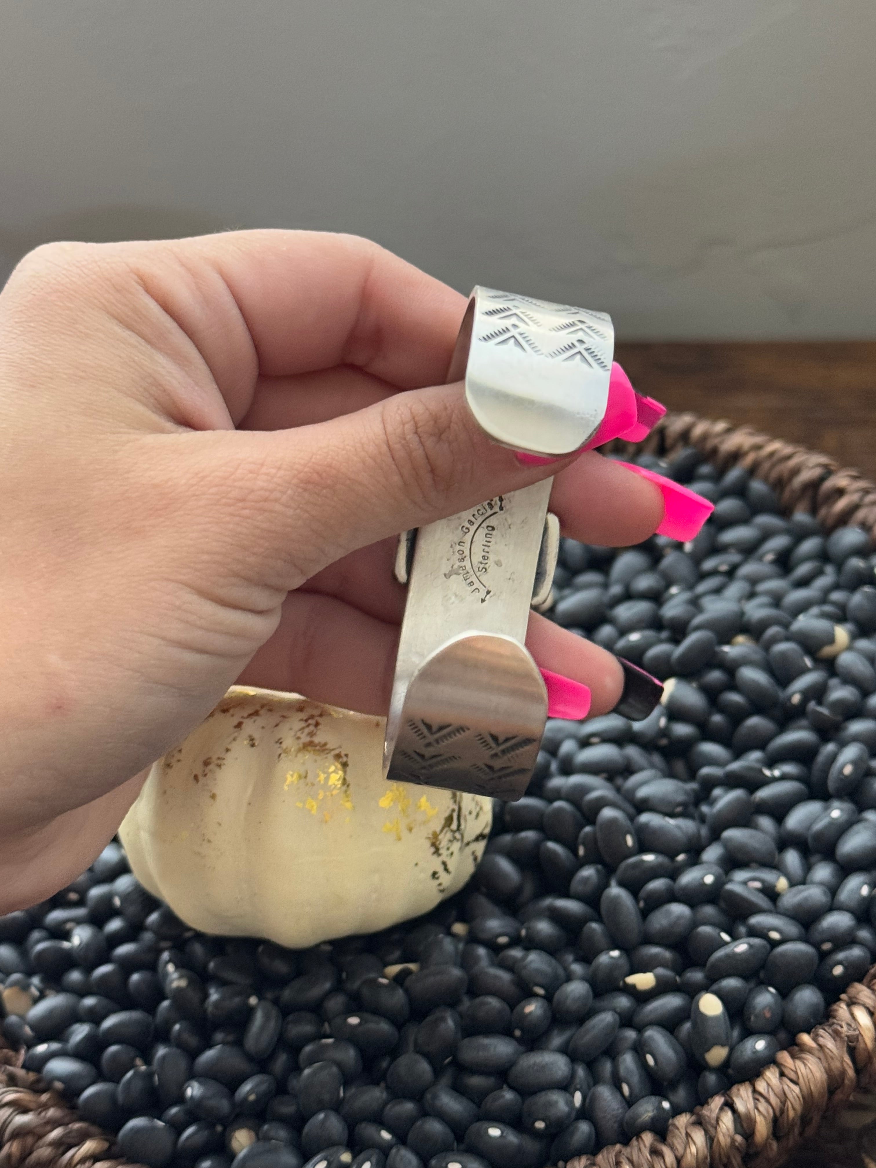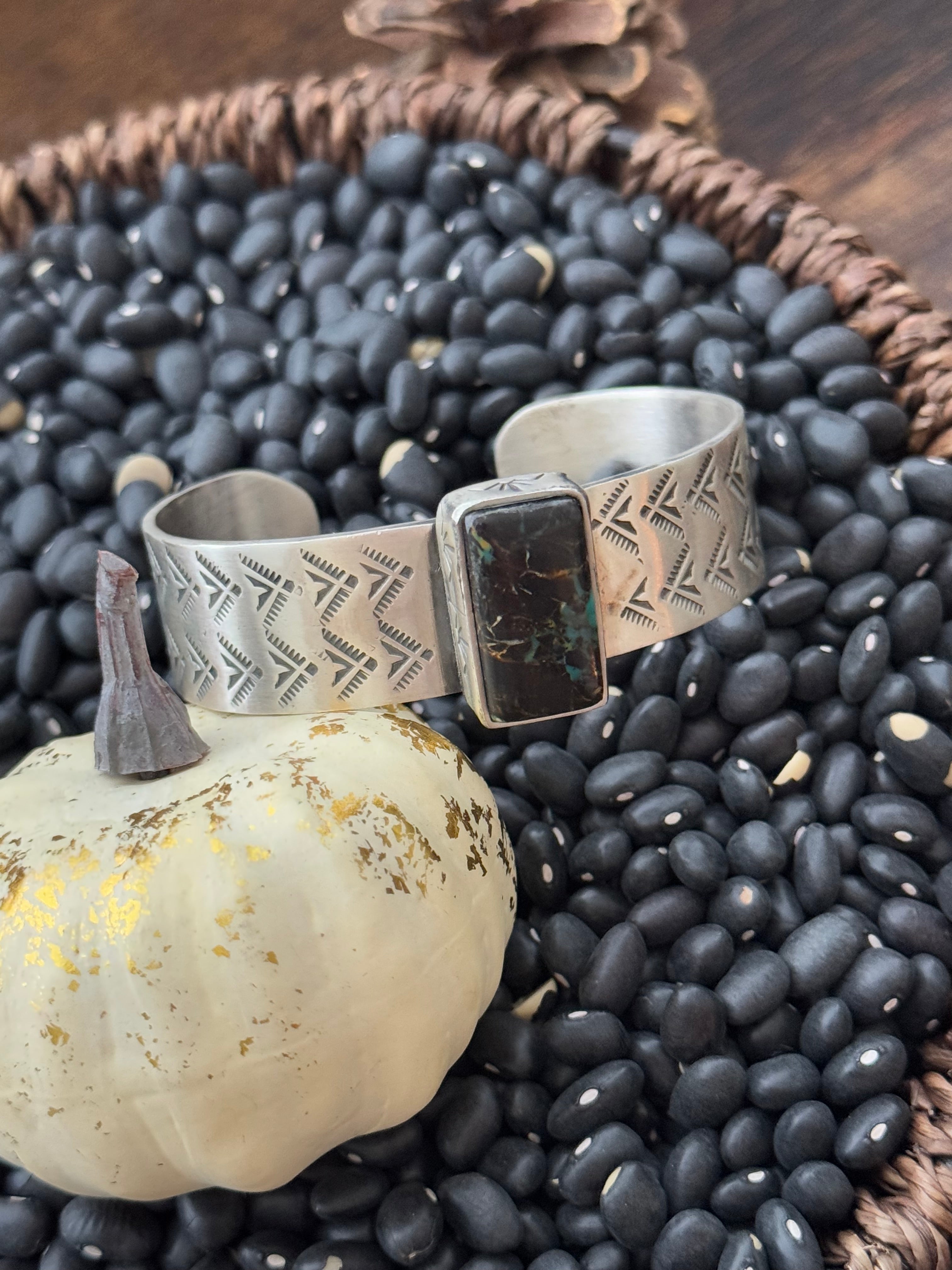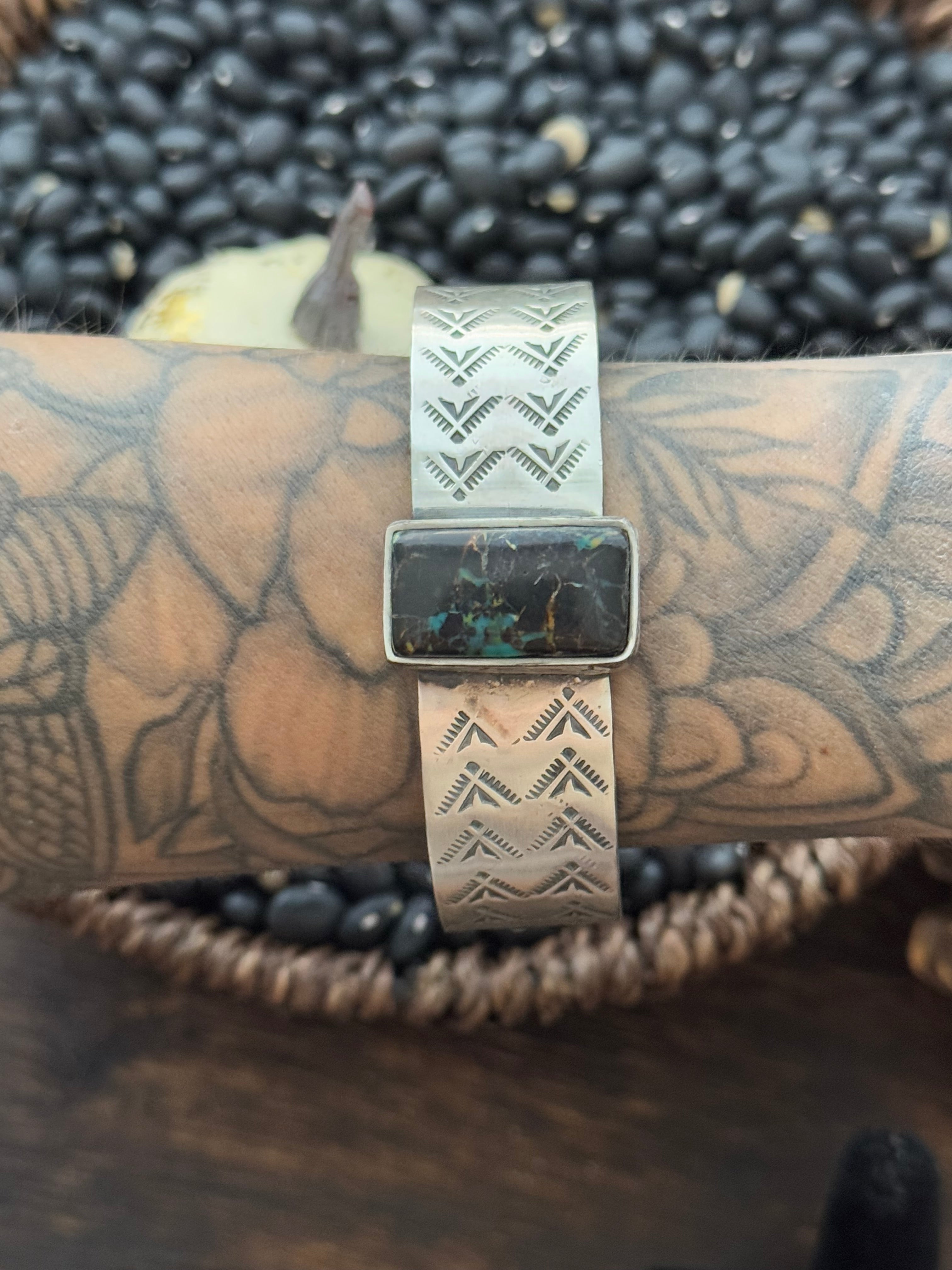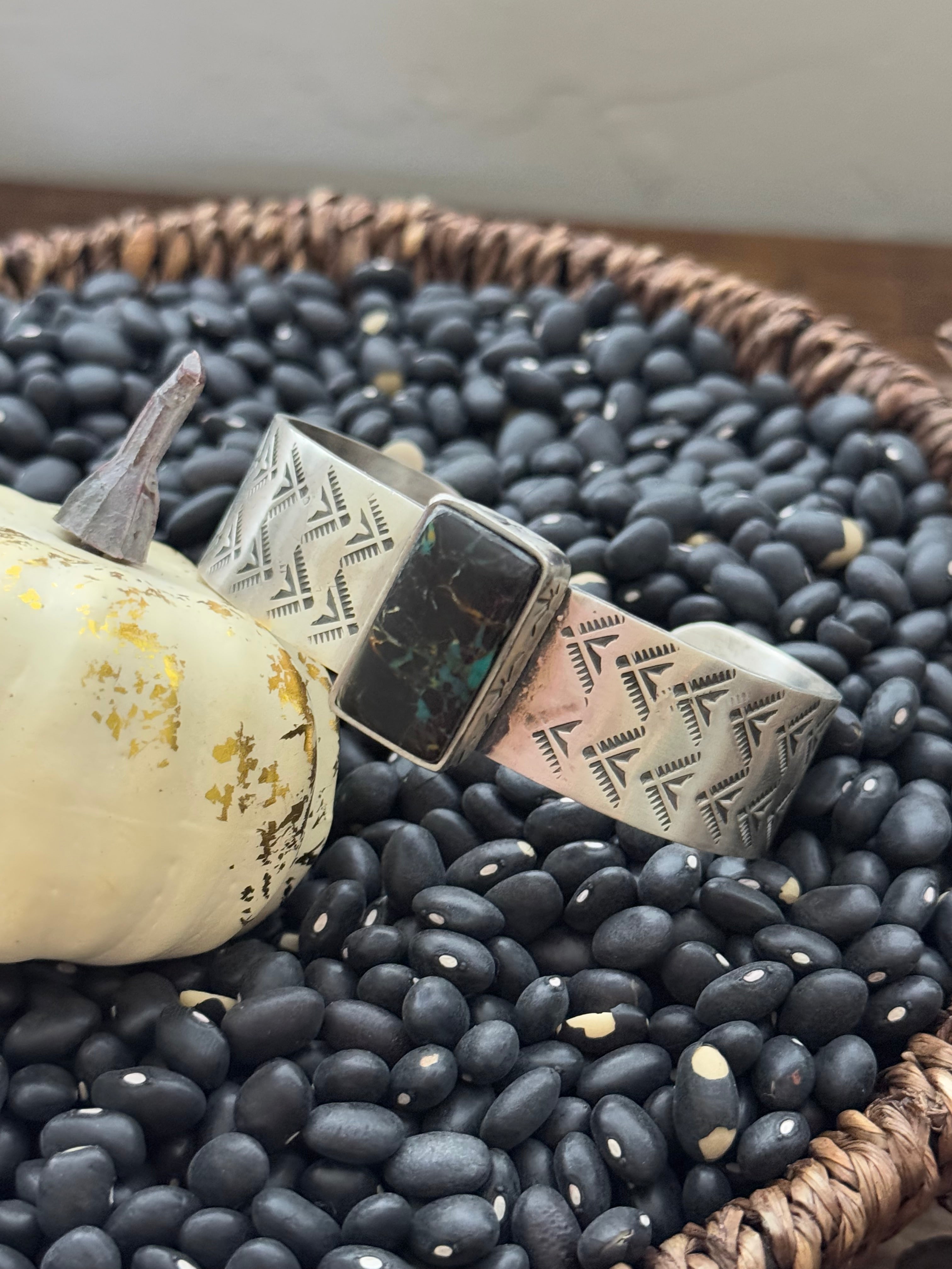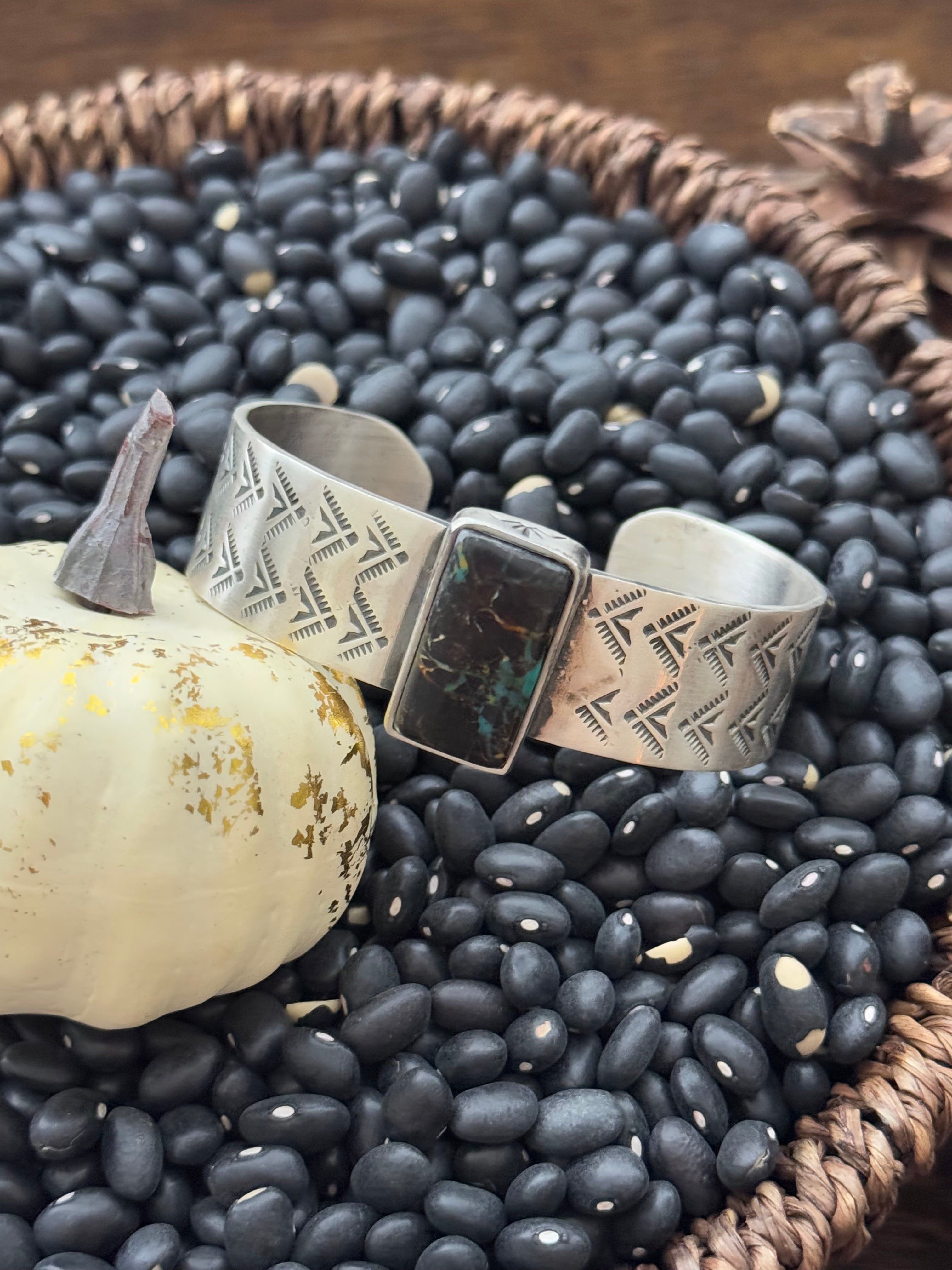Jameson Garcia Black Jack Turquoise & Sterling Silver Cluster Cuff Bracelet. It measures 7/8 of an inch wide with an inside circumference of 5 3/4 inches and a gap of 7/8 of an inch. Signed by artist and stamped sterling silver.
