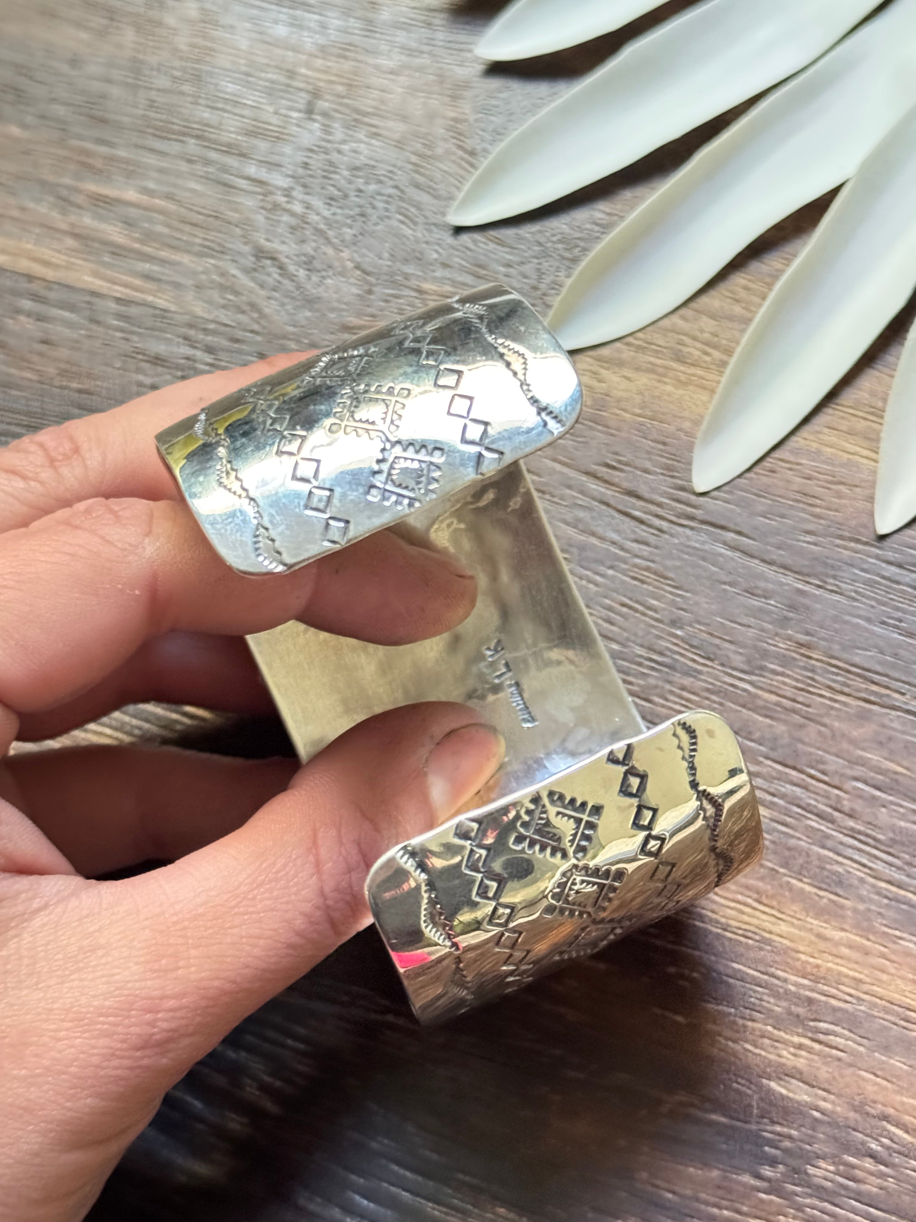 Larry Kaye Kingman Turquoise & Sterling Silver Cluster Cuff Bracelet. It measures 1 1/2 inches wide with an inside circumference of 6 inches and a gap of 1 1/8 inches. Signed by artist and stamped sterling silver.