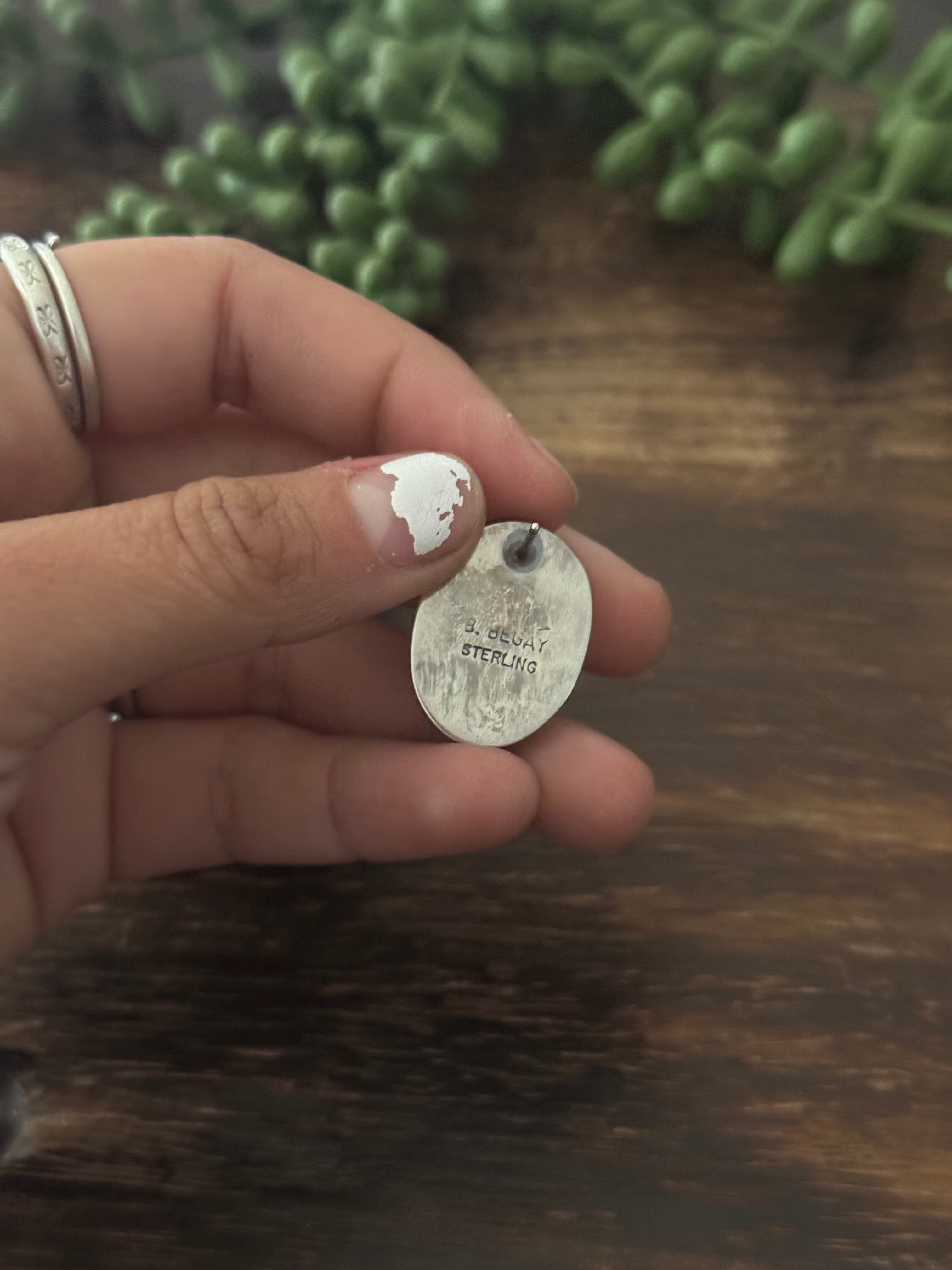 Larry Kaye Kingman Turquoise & Sterling Silver Post Earrings. They measure 1 inch long and 3/4 of an inch wide. Signed by the artist and stamped sterling silver.