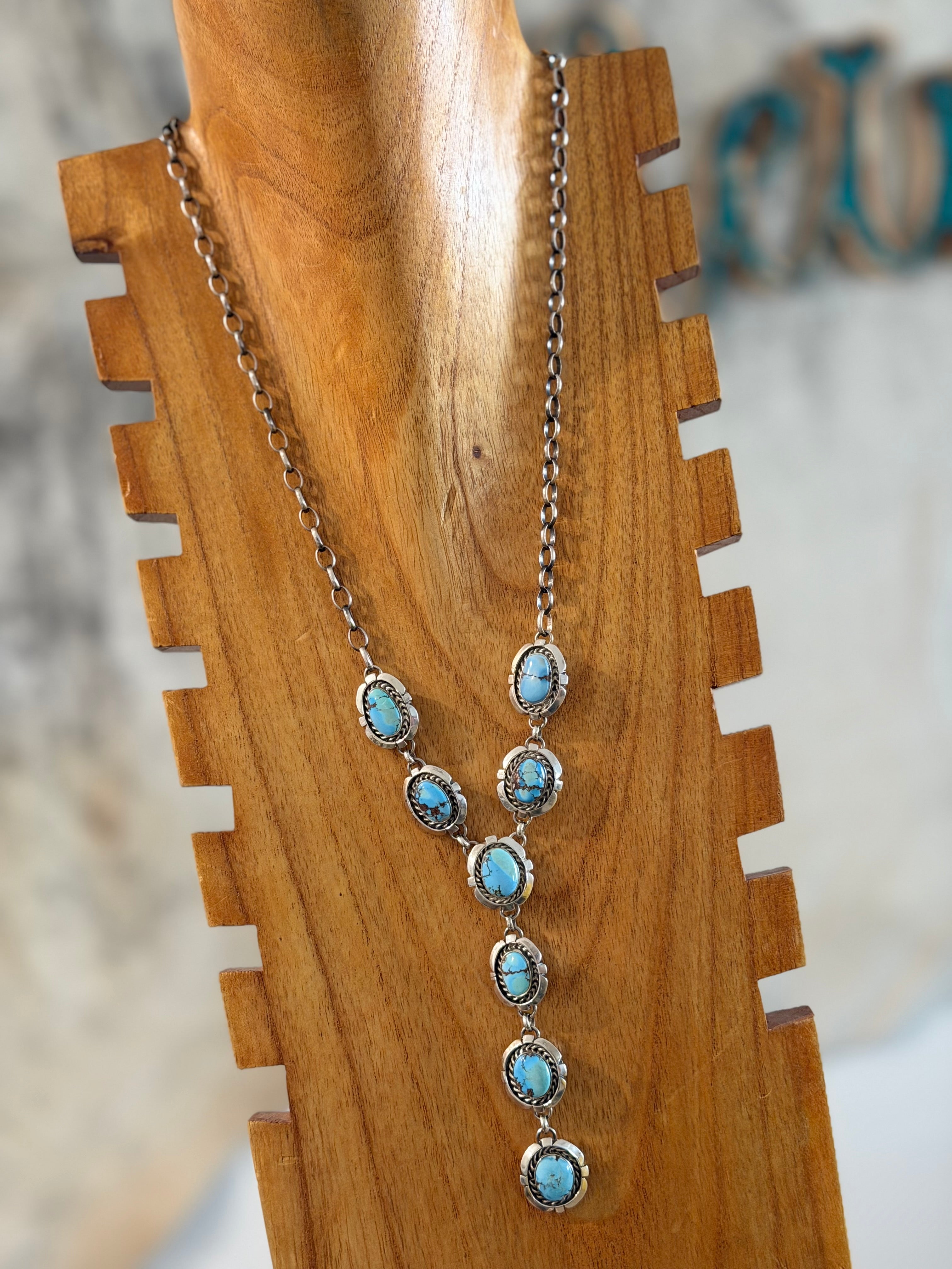 Larry Kaye Golden Hills Turquoise & Sterling Silver Lariat Necklace Set. It measures 30 inches long with hang while the chain itself measures 22 inches long. Signed by the artist and stamped sterling silver.