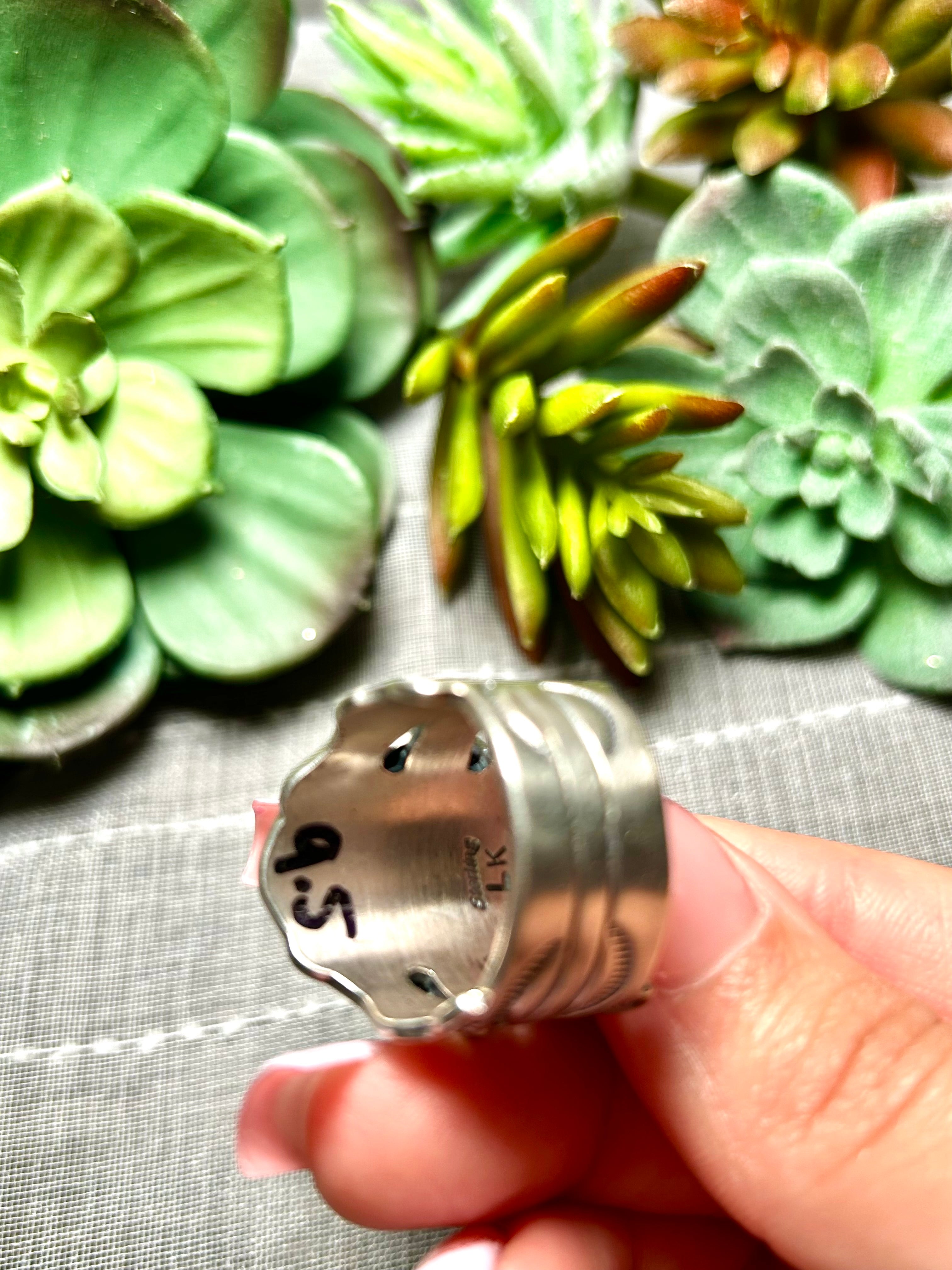 Larry Kaye Sonoran Mountain Turquoise & Sterling Silver Ring Size 10.5. It measures 1 inch long and 7/8 of an inch wide. Signed by the artist and stamped sterling silver.
