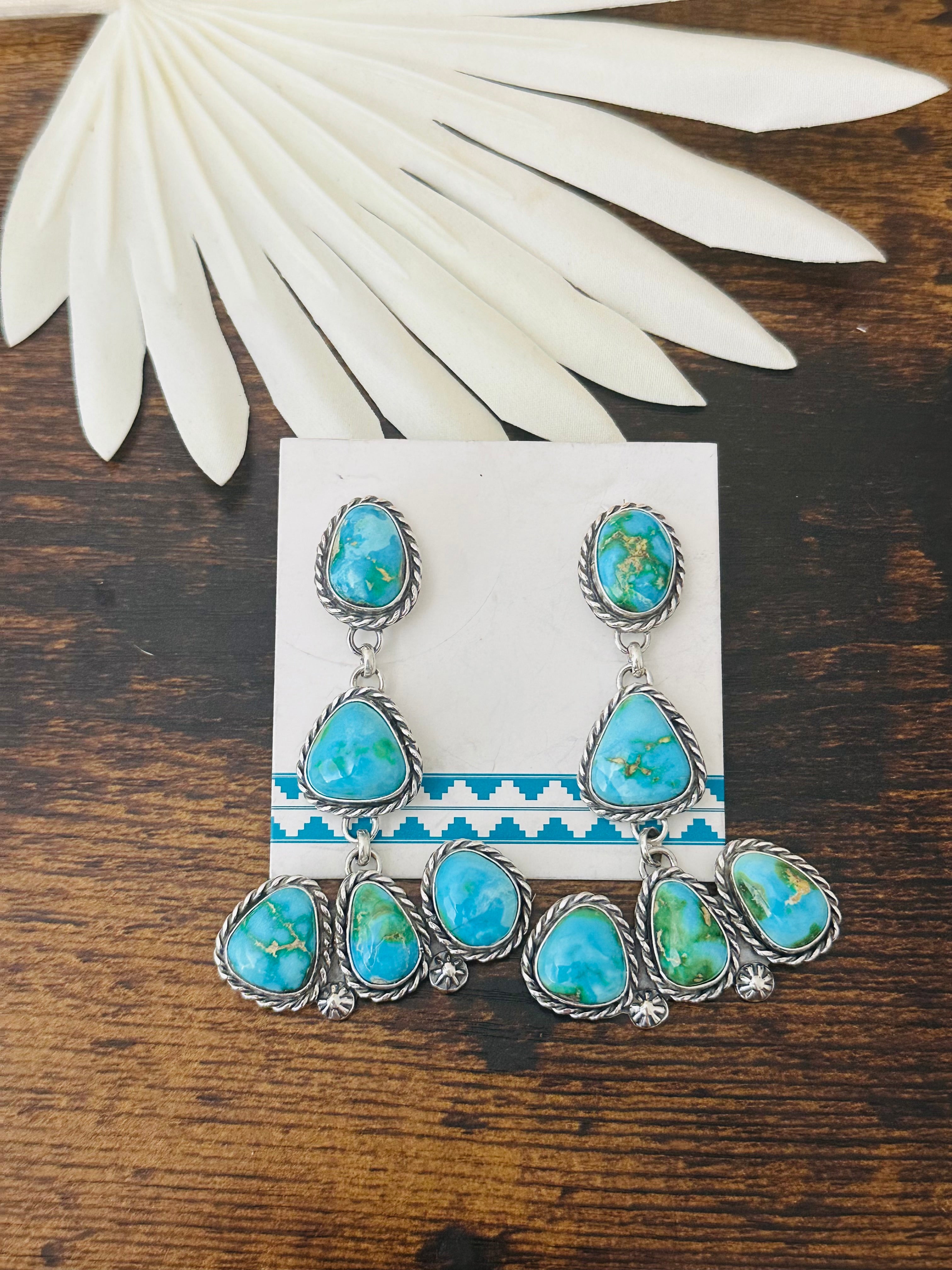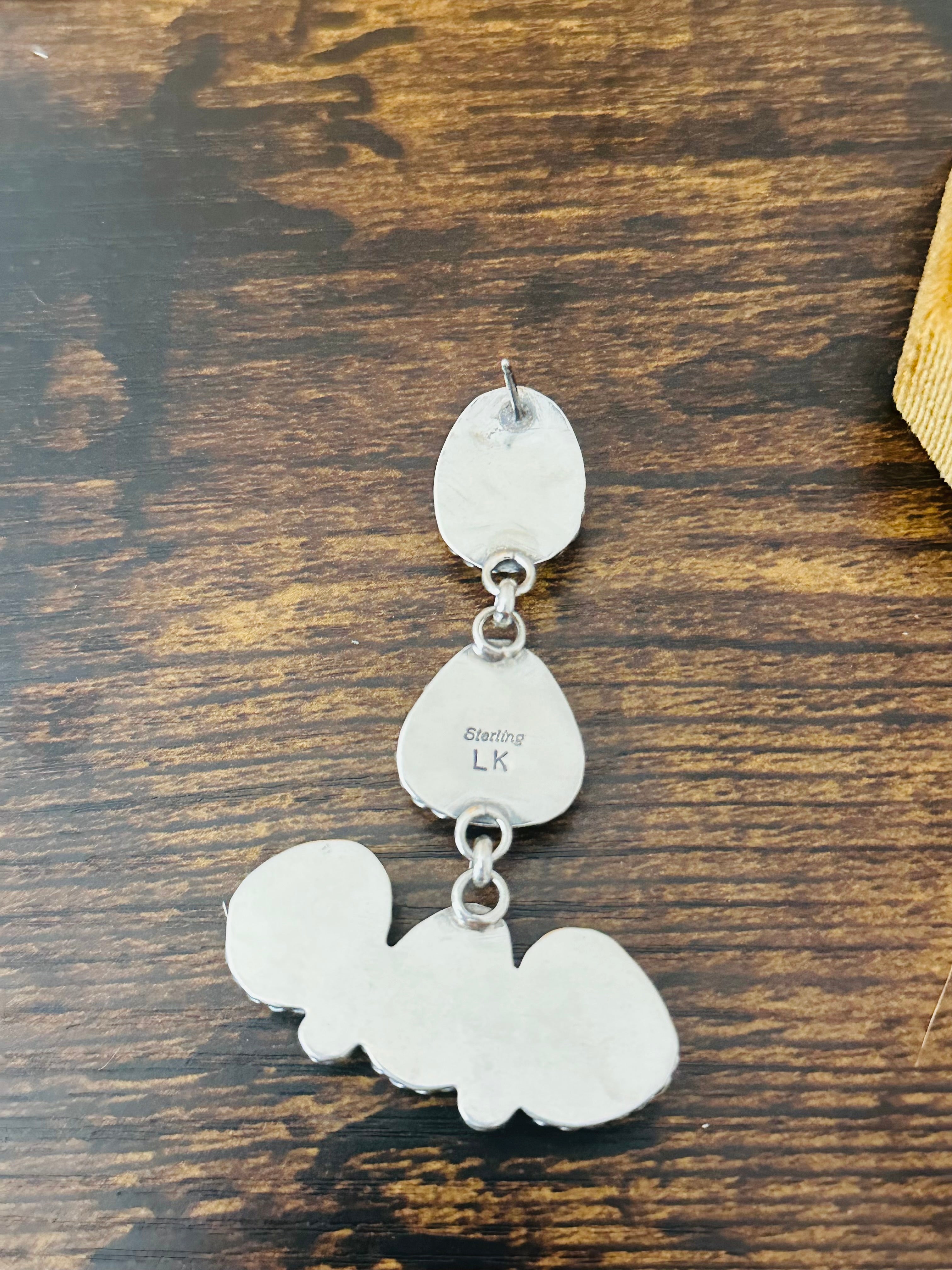 Larry Kaye Sonoran Mountain Turquoise & Sterling Silver Post Earrings. They measure 3 inches long and 1 5/8 inches wide. Signed by the artist and stamped sterling silver.