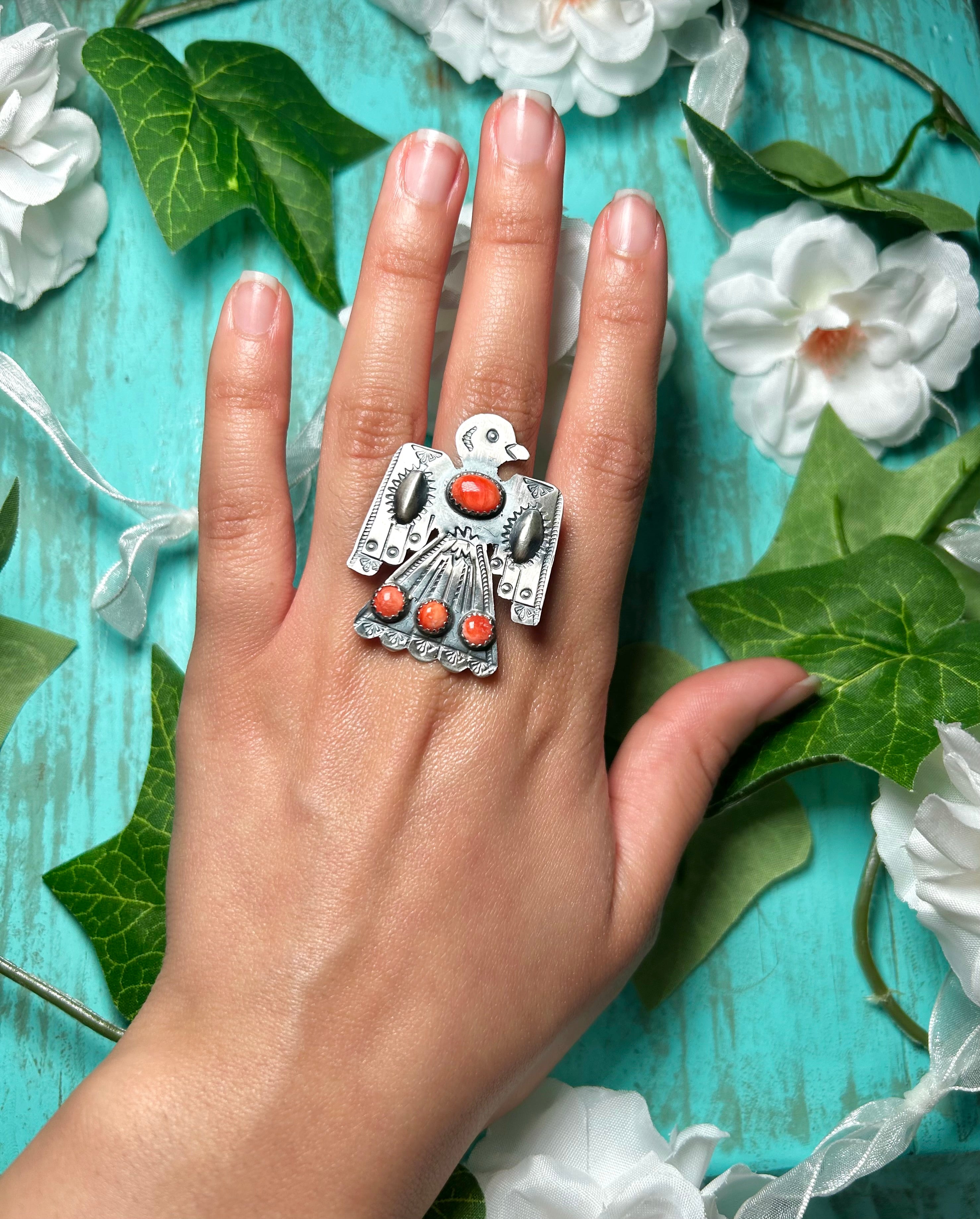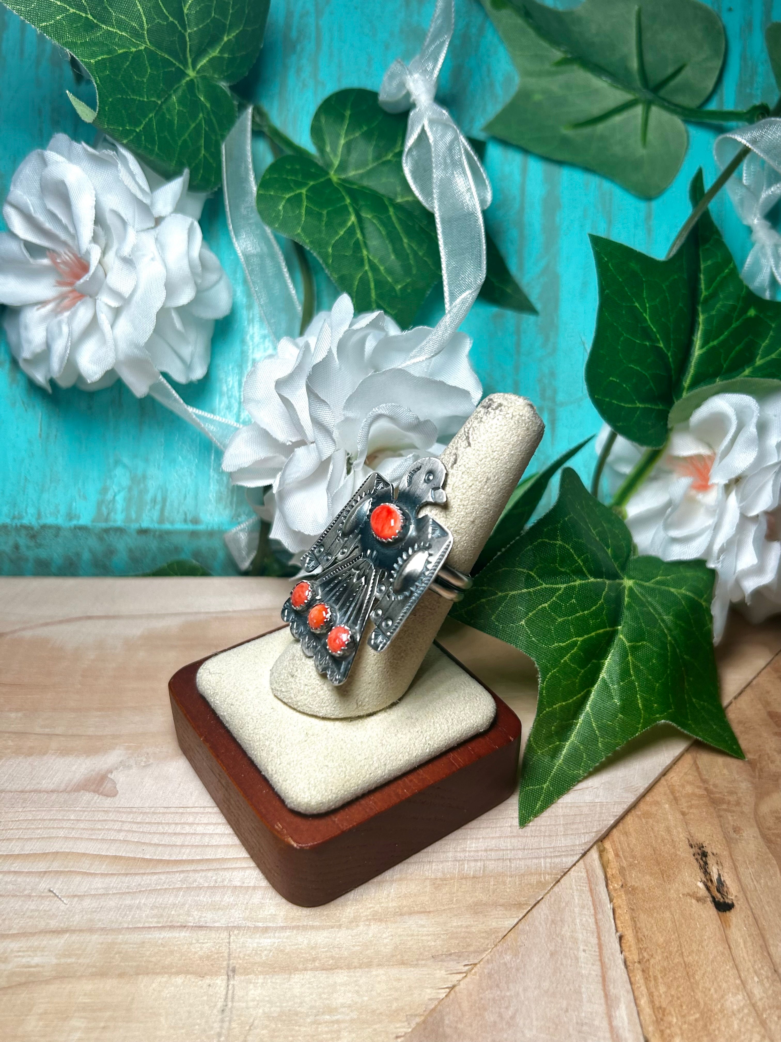 Tim Yazzie Spiny Oyster & Sterling Silver Adjustable Ring. It measures 1 5/8 inches long and 1 5/8 inches wide. Stamped sterling silver and signed.