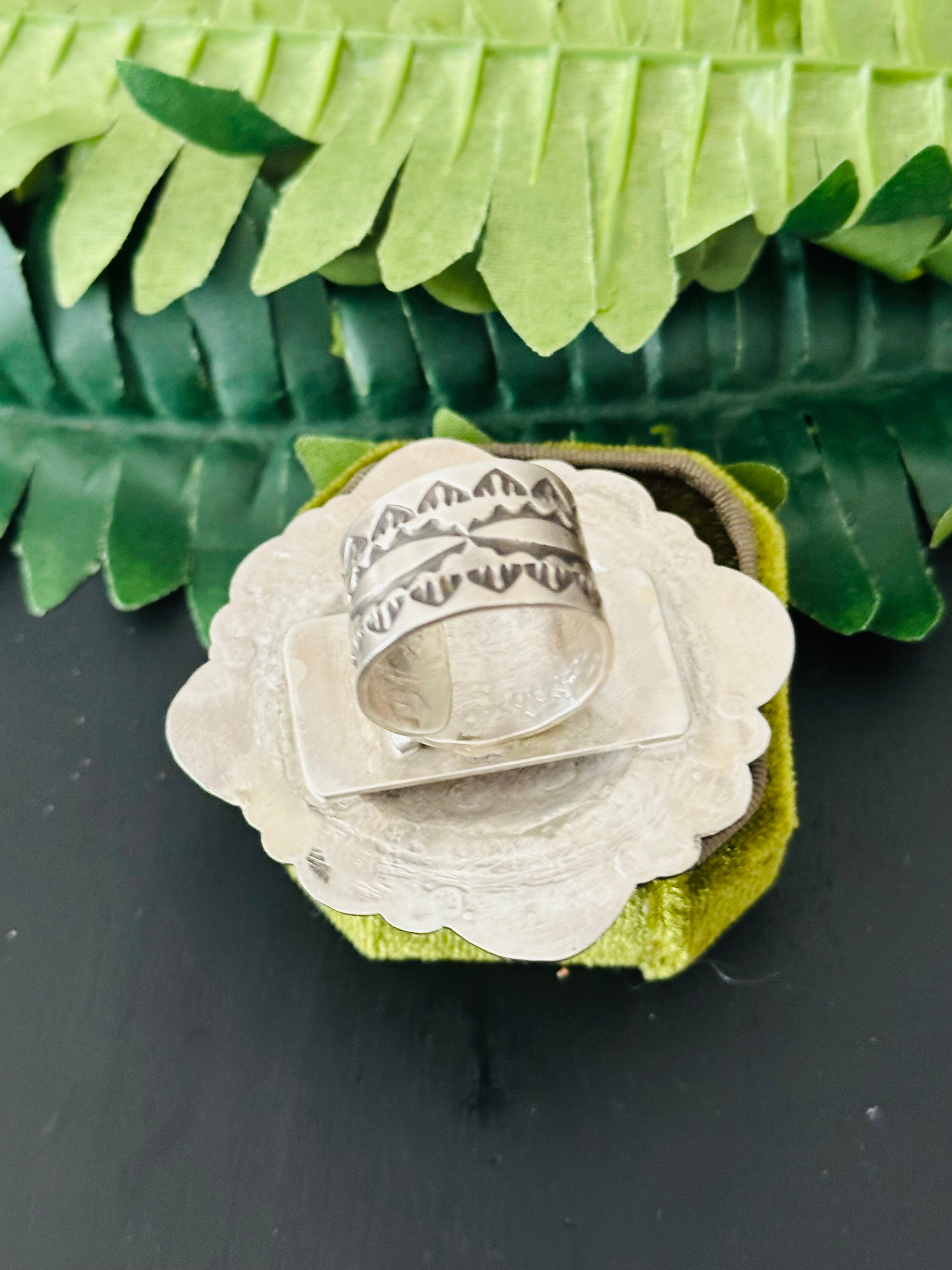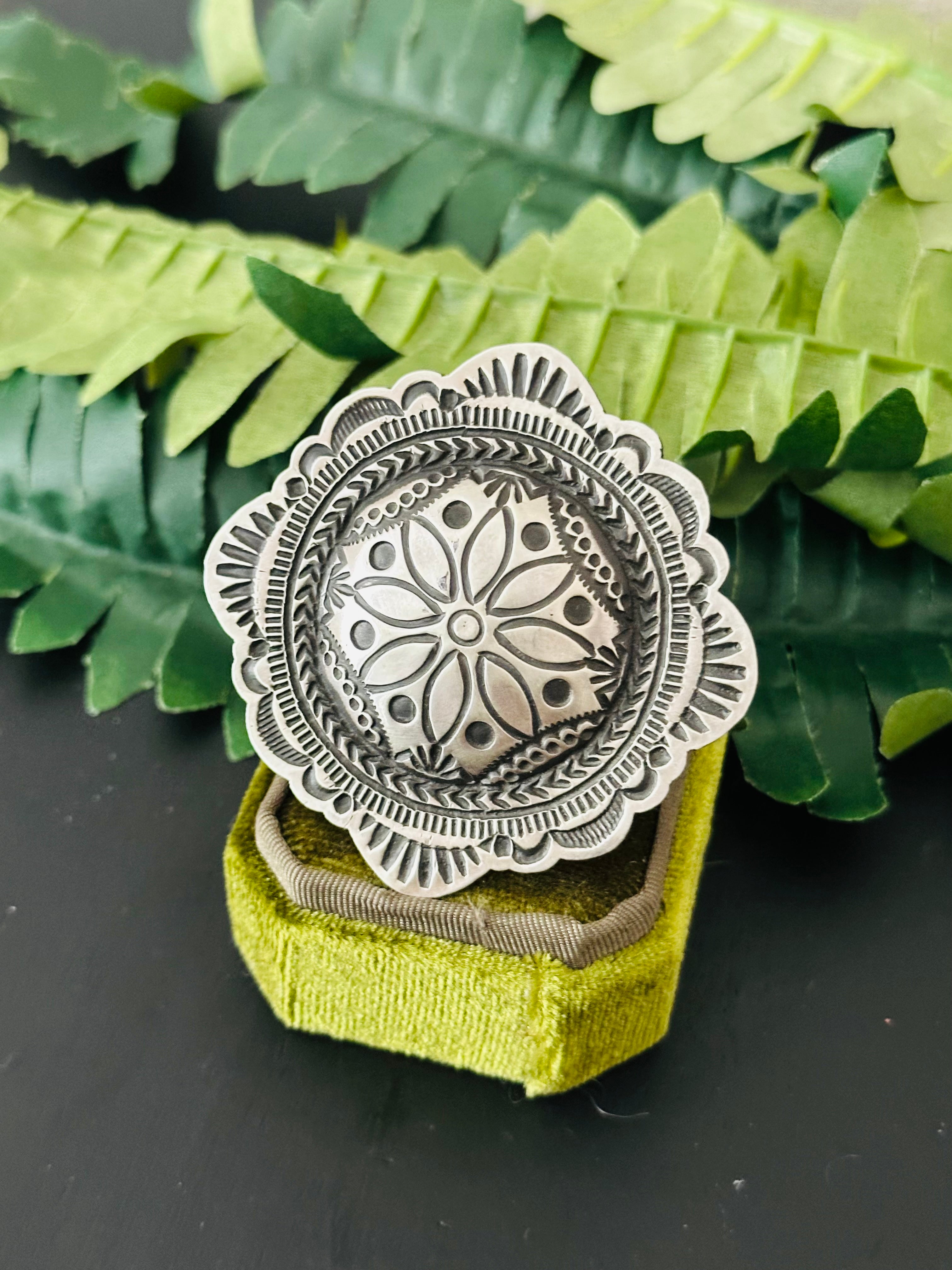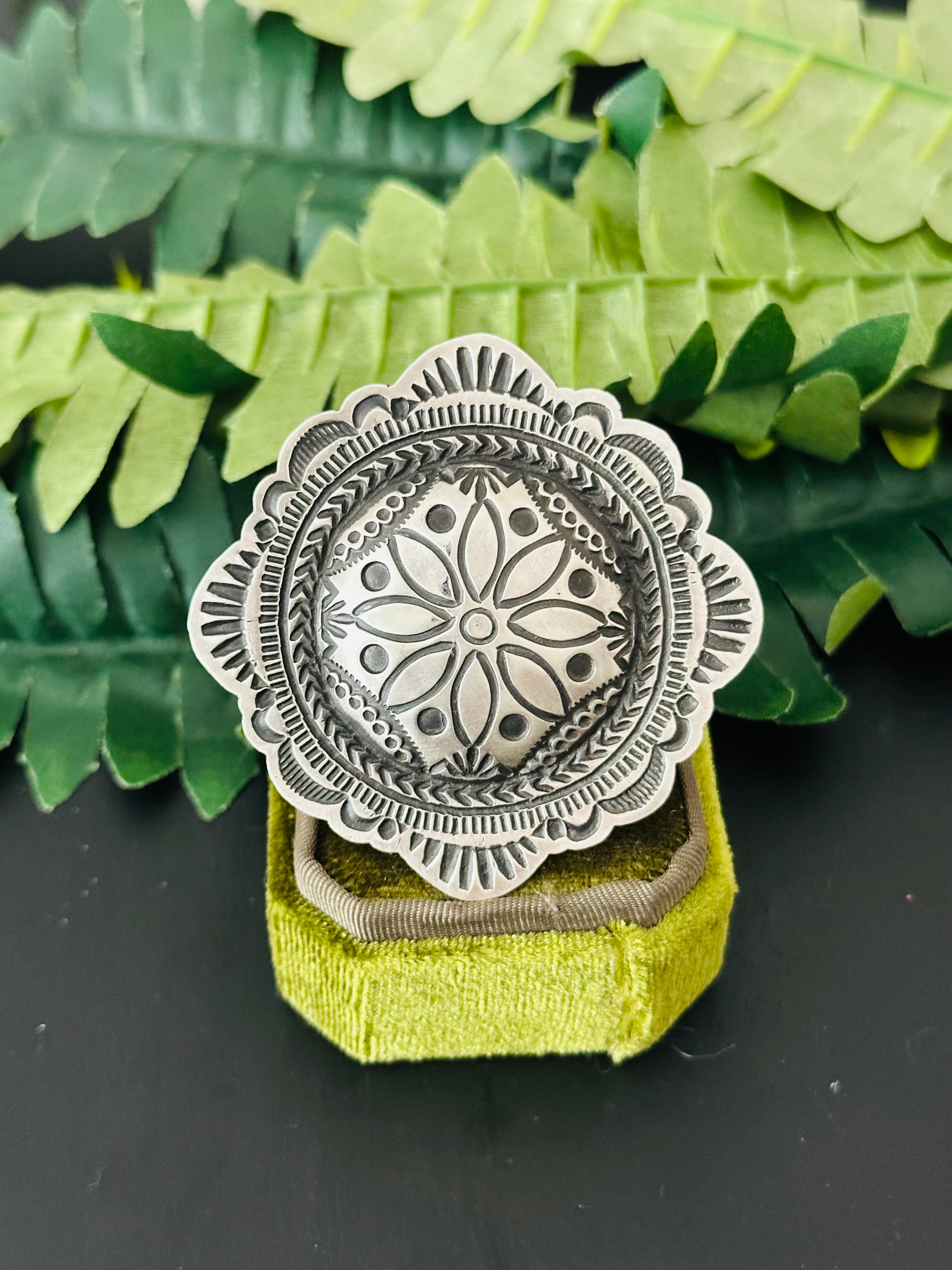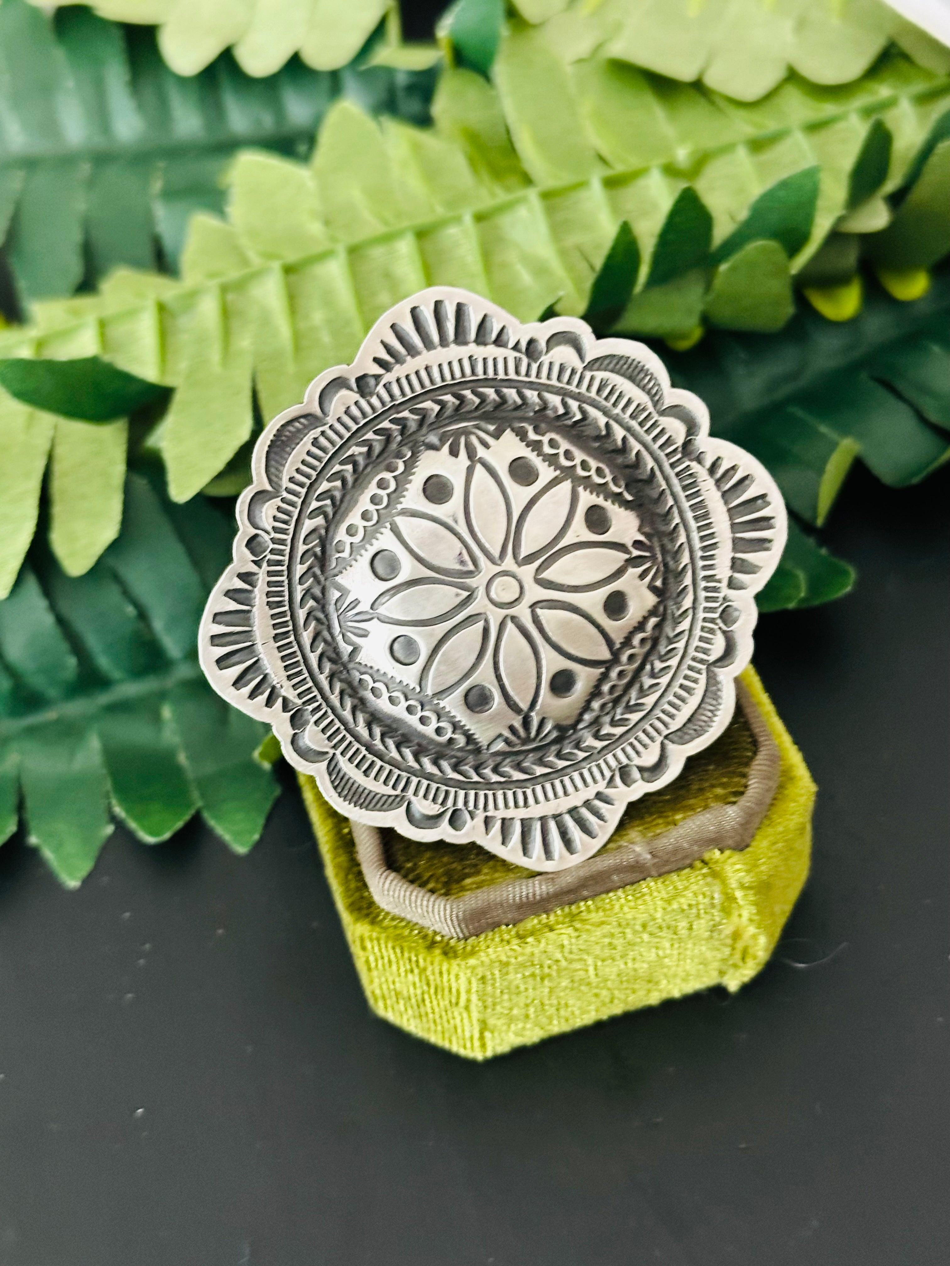 Leander Tahe Sterling Silver Concho Adjustable Ring. It measures 2 1/2 inches round. Signed by the artist and stamped sterling silver.