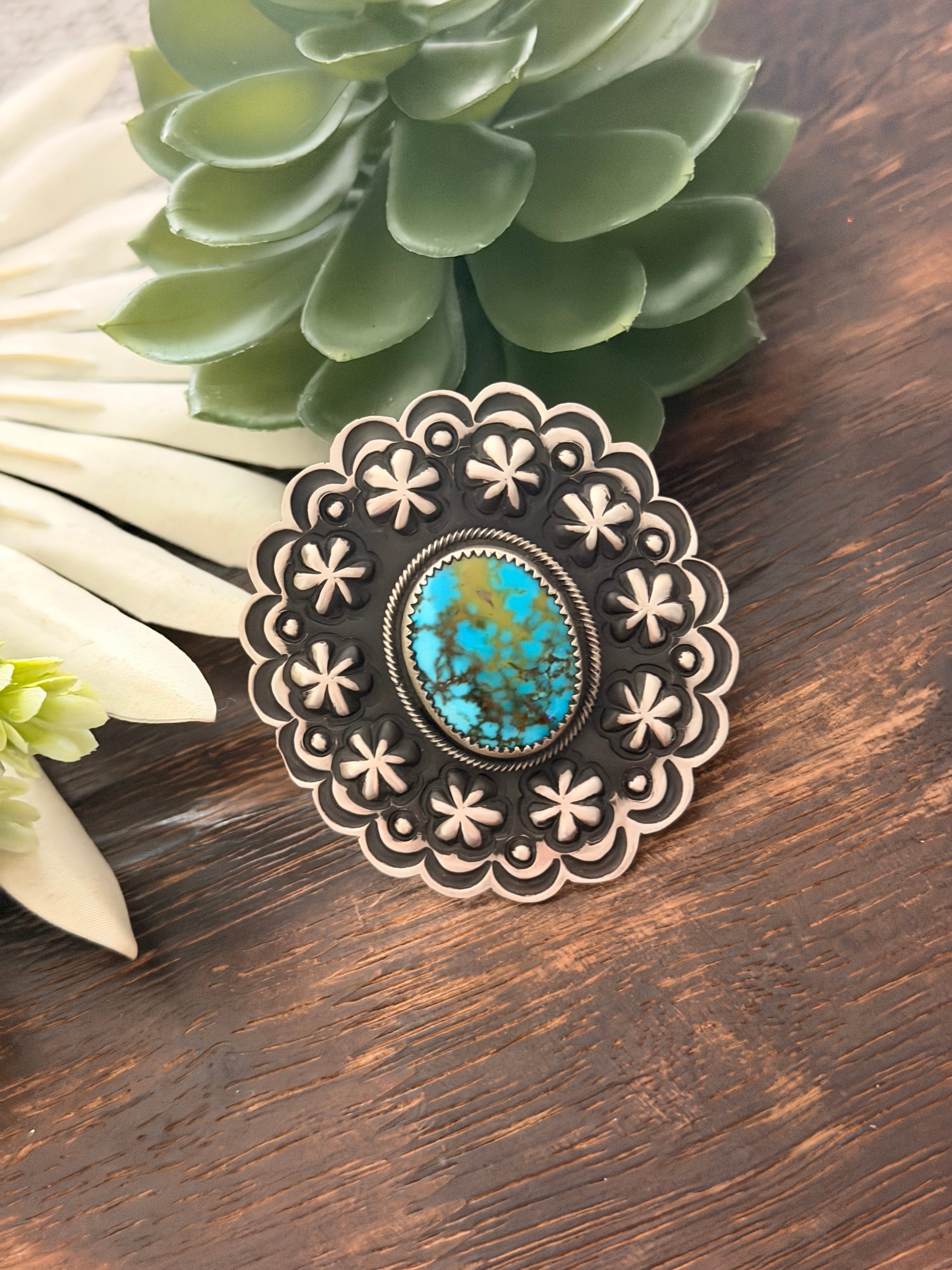 Leander Tahe High Grade Kingman Turquoise & Sterling Silver Concho Adjustable Ring. It measures 2 3/8 inches round. Signed by the artist and stamped sterling silver.