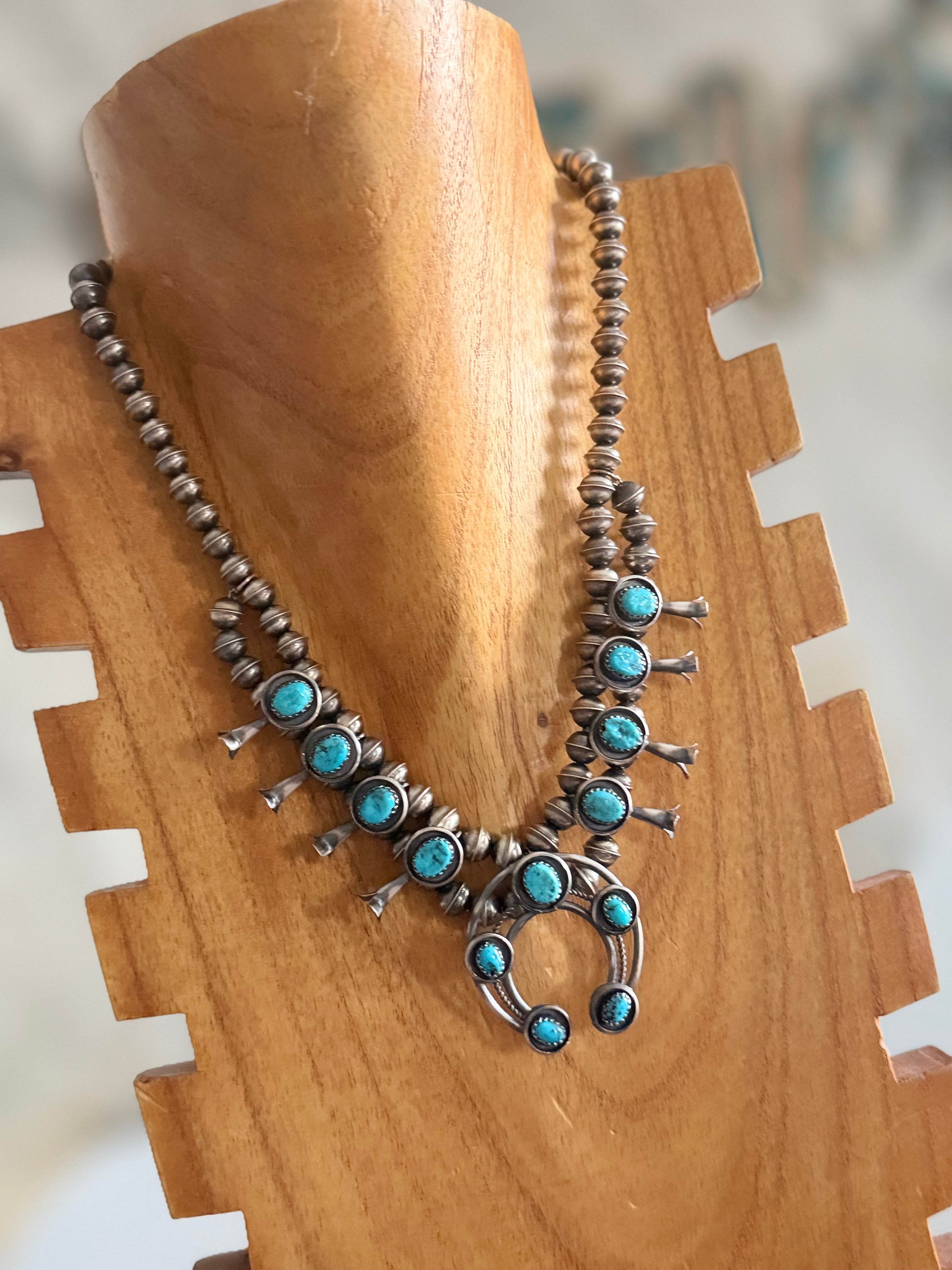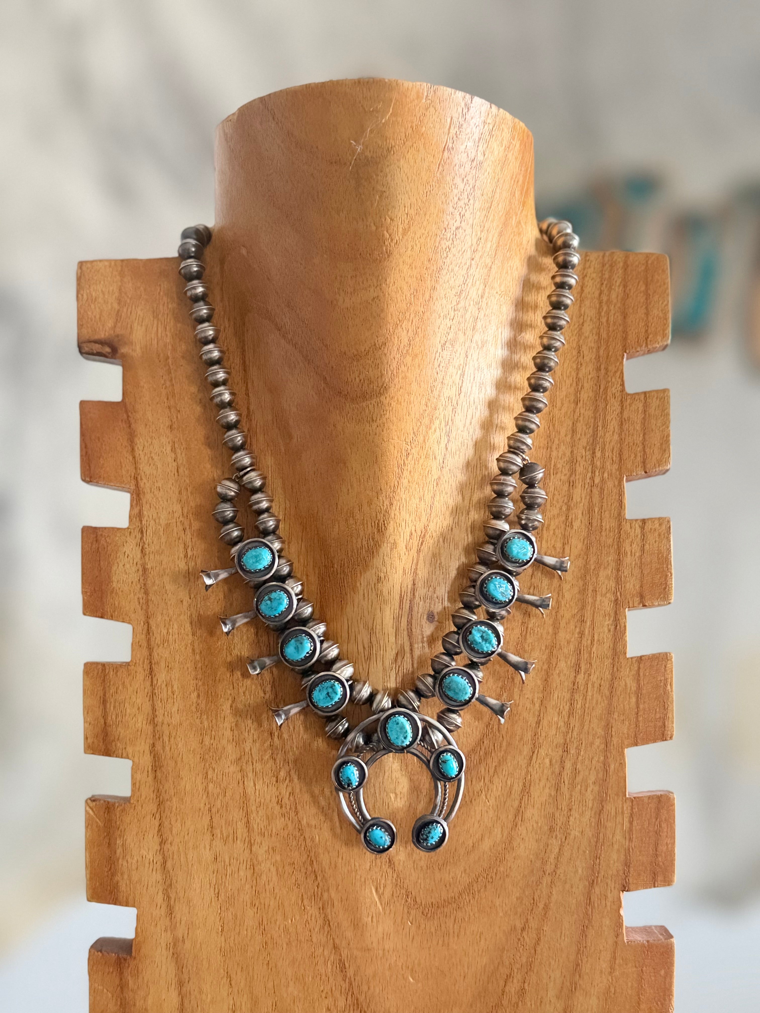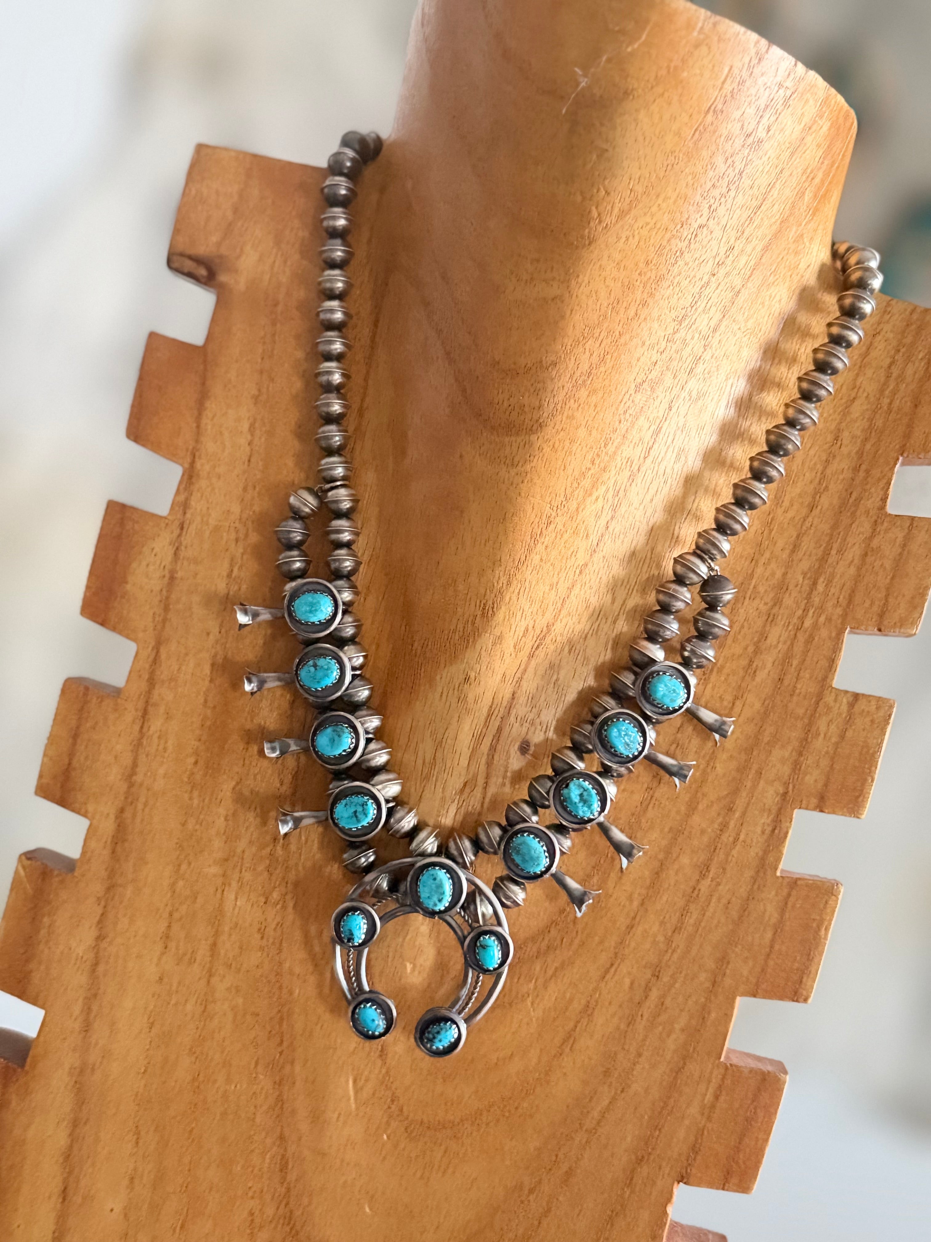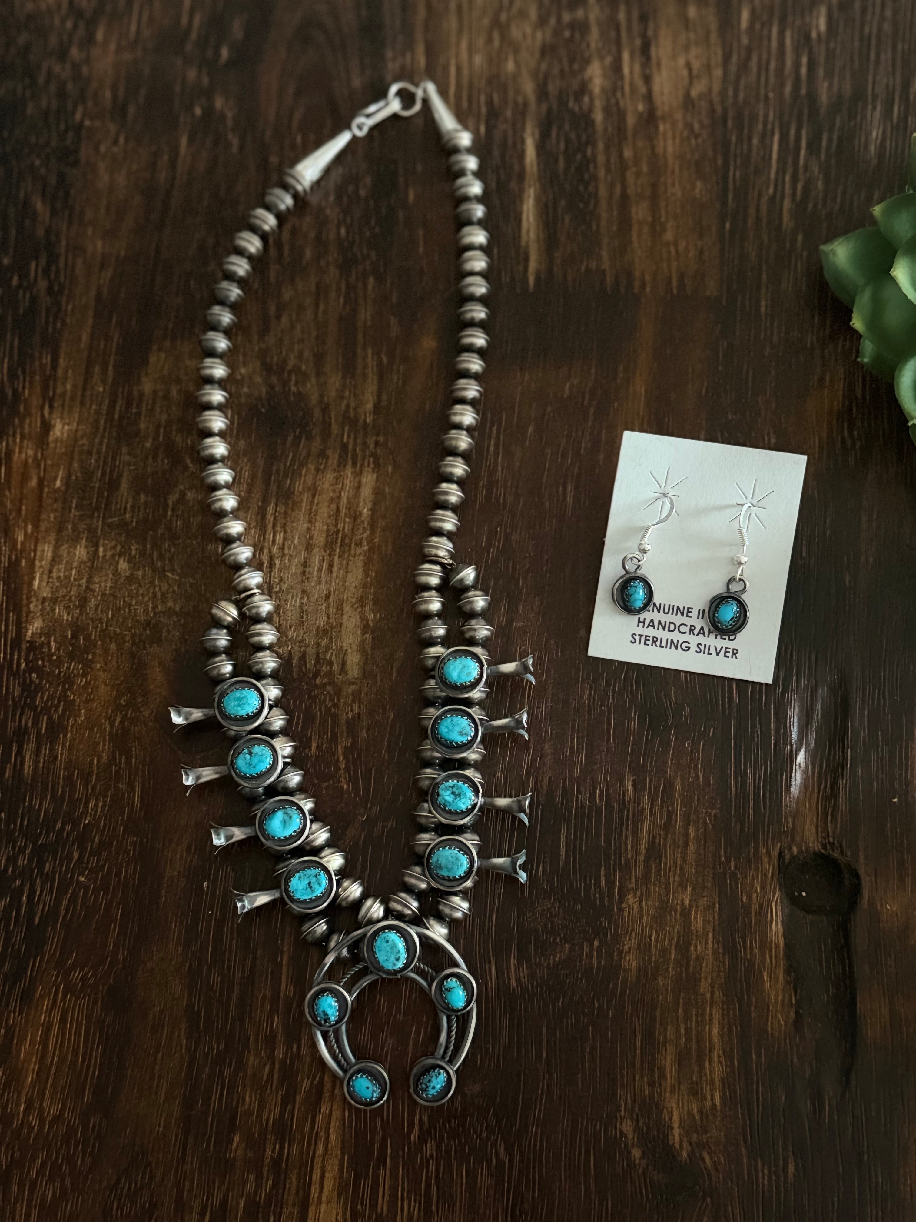 Lenora Garcia Kingman Turquoise & Sterling Silver Squash Blossom Necklace Set