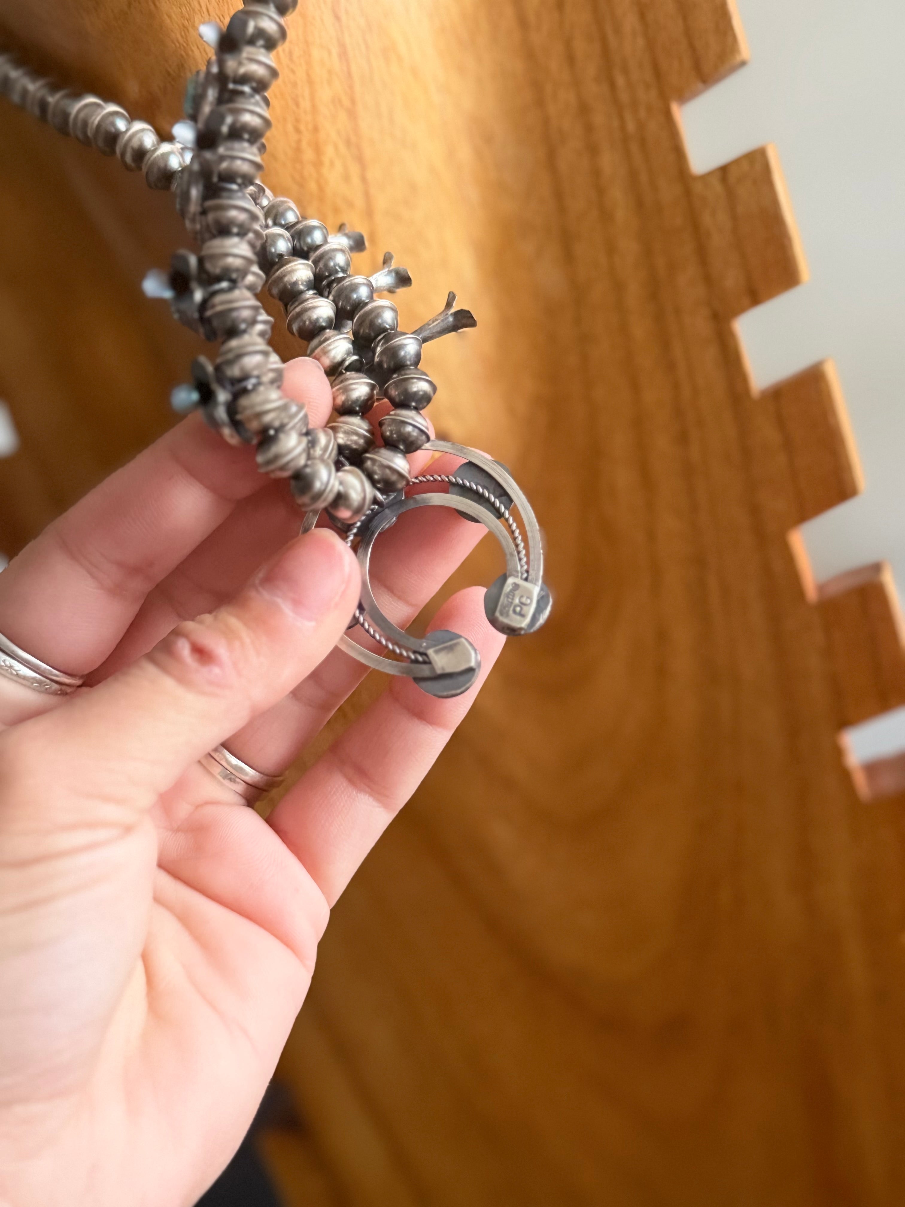 Lenora Garcia Kingman Turquoise & Sterling Silver Squash Blossom Necklace Set. It measures 20 inches long with hang while the chain measures 18 inches long. Signed by the artist and stamped sterling silver.