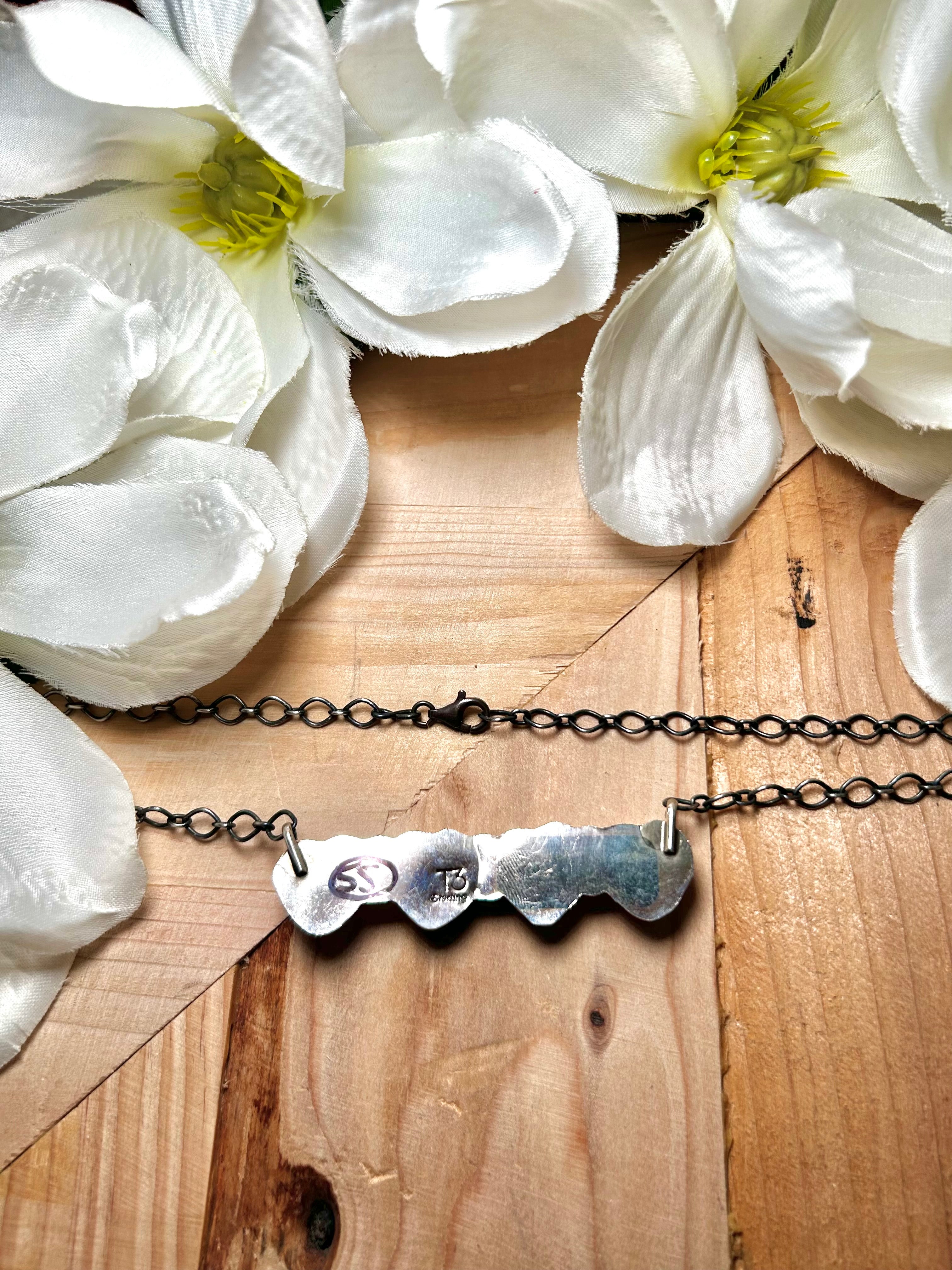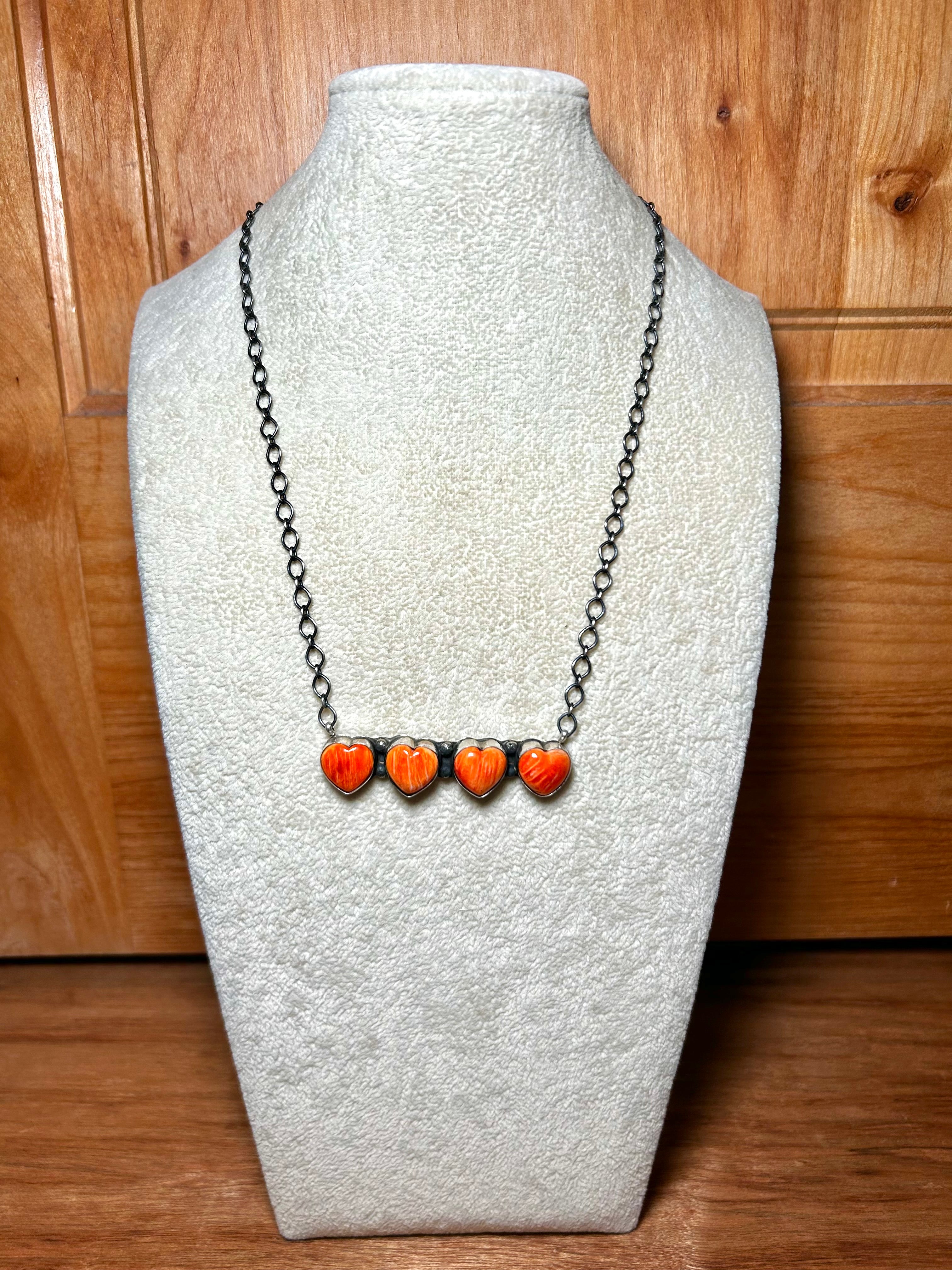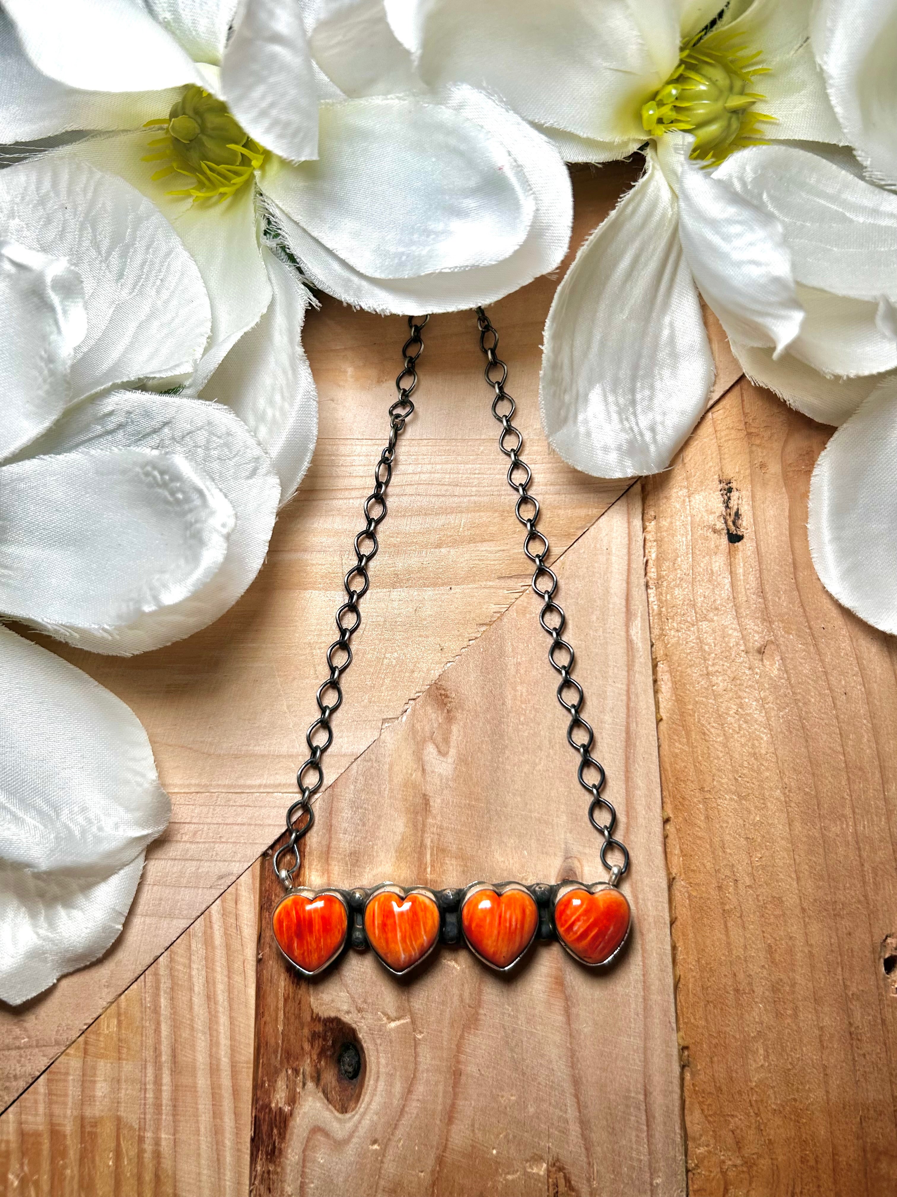Tia Long Spiny Oyster & Sterling Silver Necklace. It measures 19 1/2 inches long with hang while the chain measures 18 inches long. Signed by the artist and stamped sterling silver.