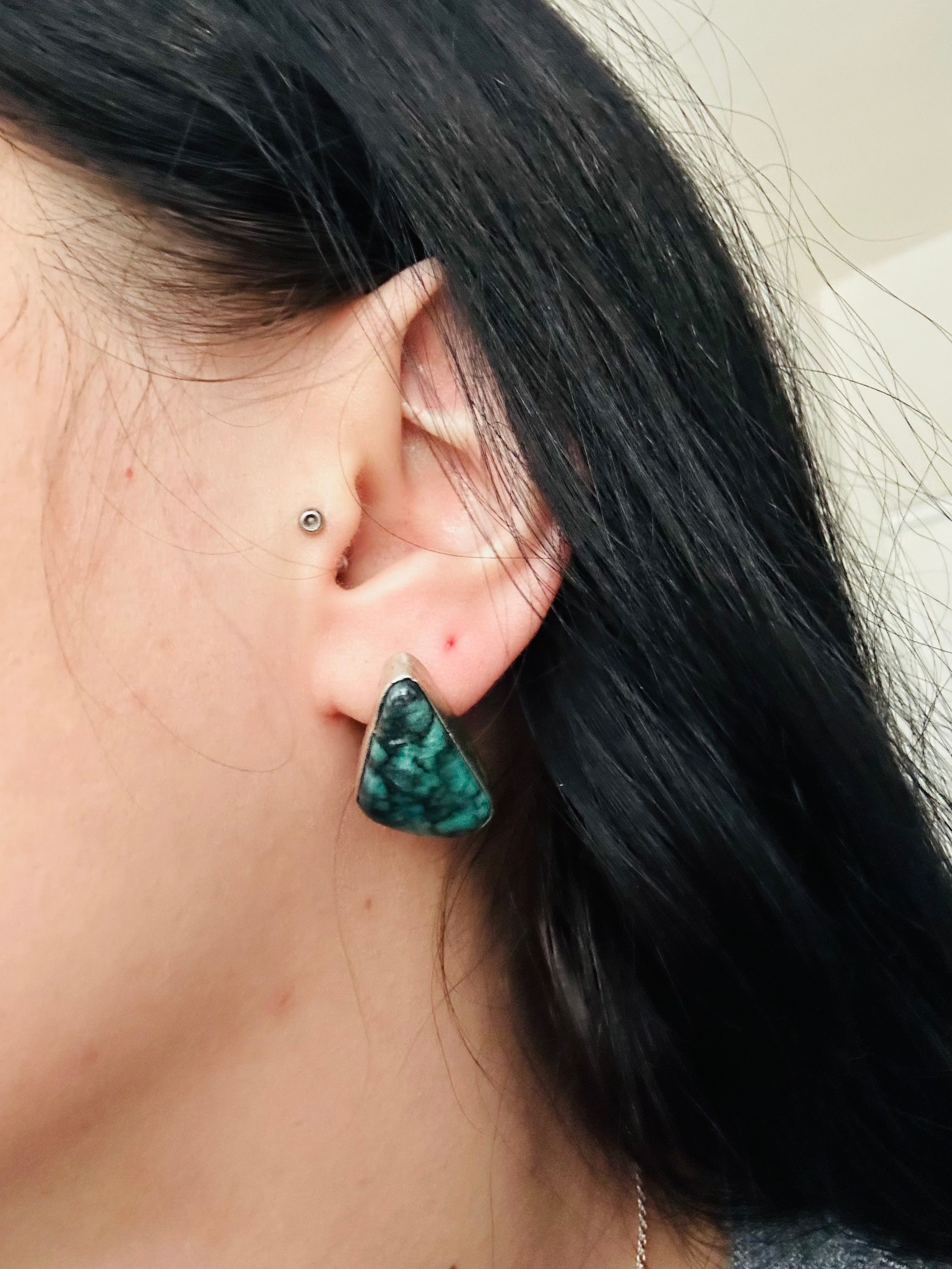 Alfred Martinez New Lander Turquoise & Sterling Silver Post Earrings. They measure 7/8 of an inch and 5/8 of an inch wide. Signed and stamped.