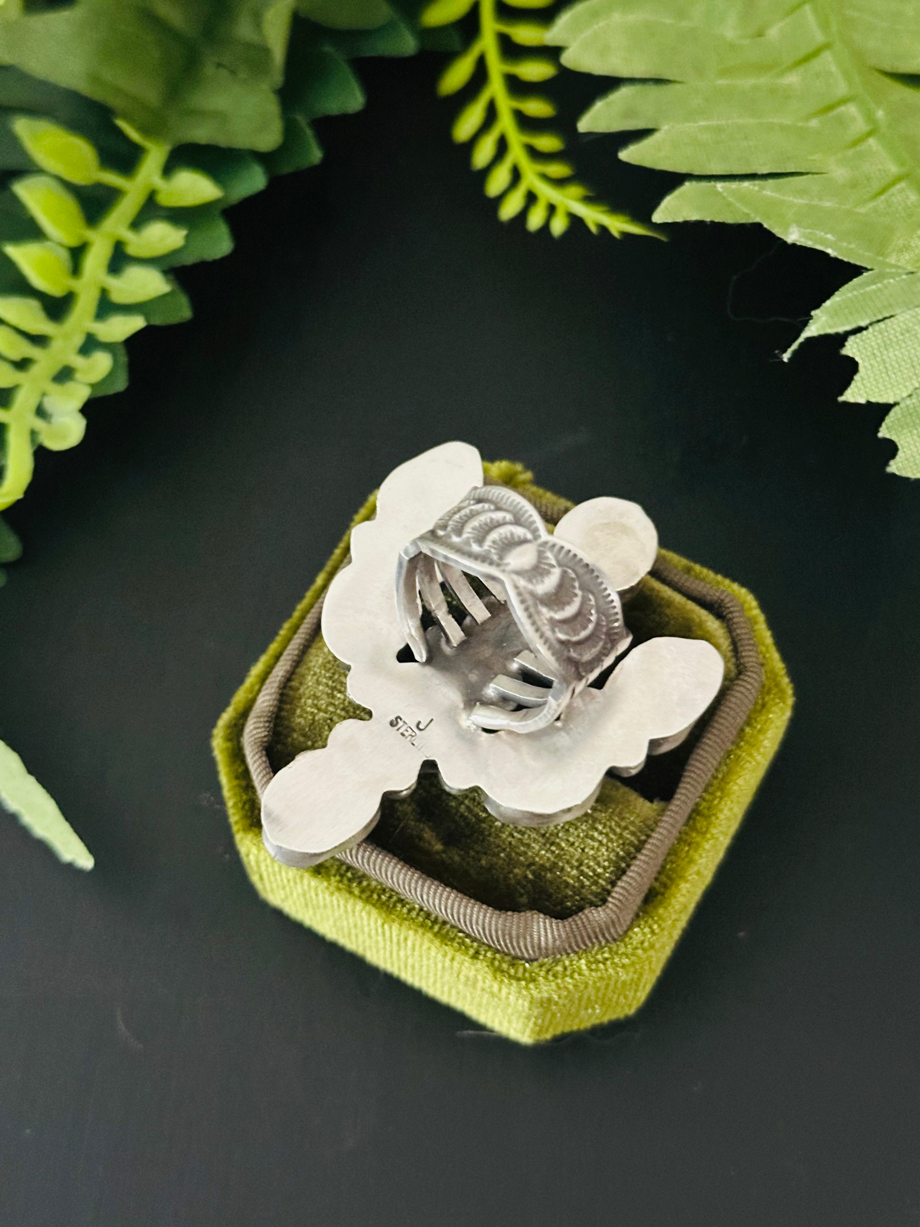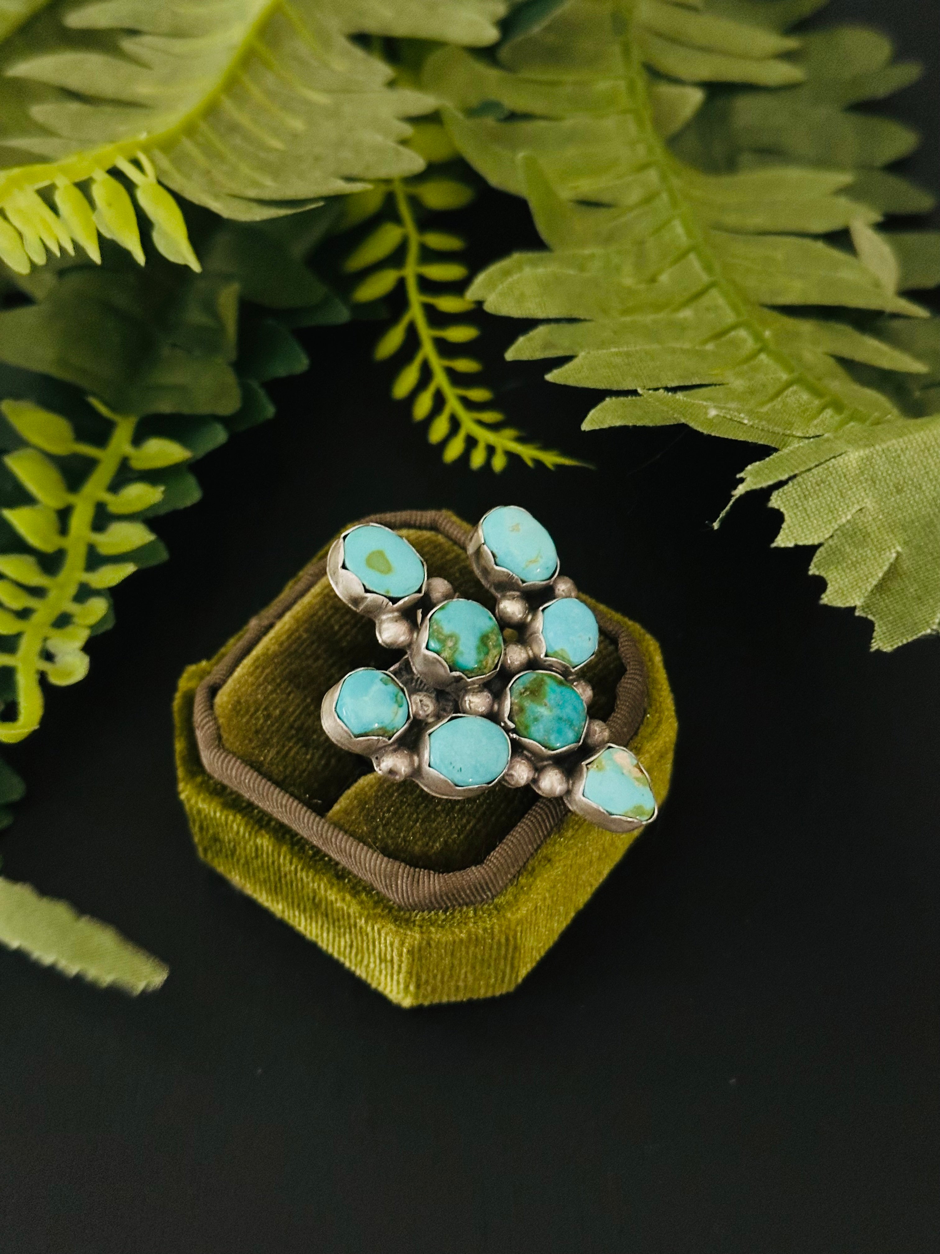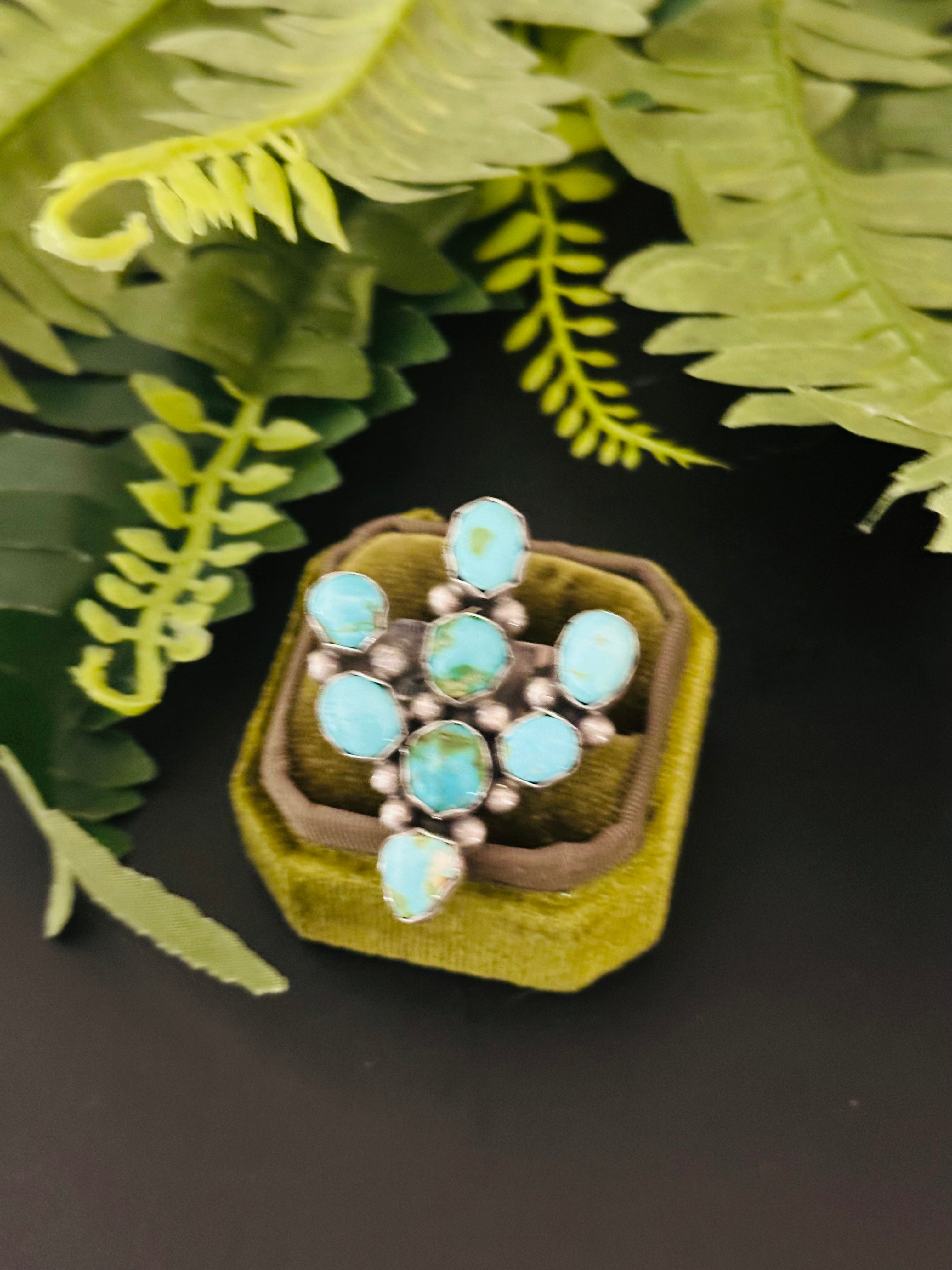Beautiful ring. Lorenzo Juan Mixed Turquoise & Sterling Silver Adjustable Ring. It measures 1 7/8 inches long and 1 1/2 inches wide. Signed by the artist and stamped sterling silver.