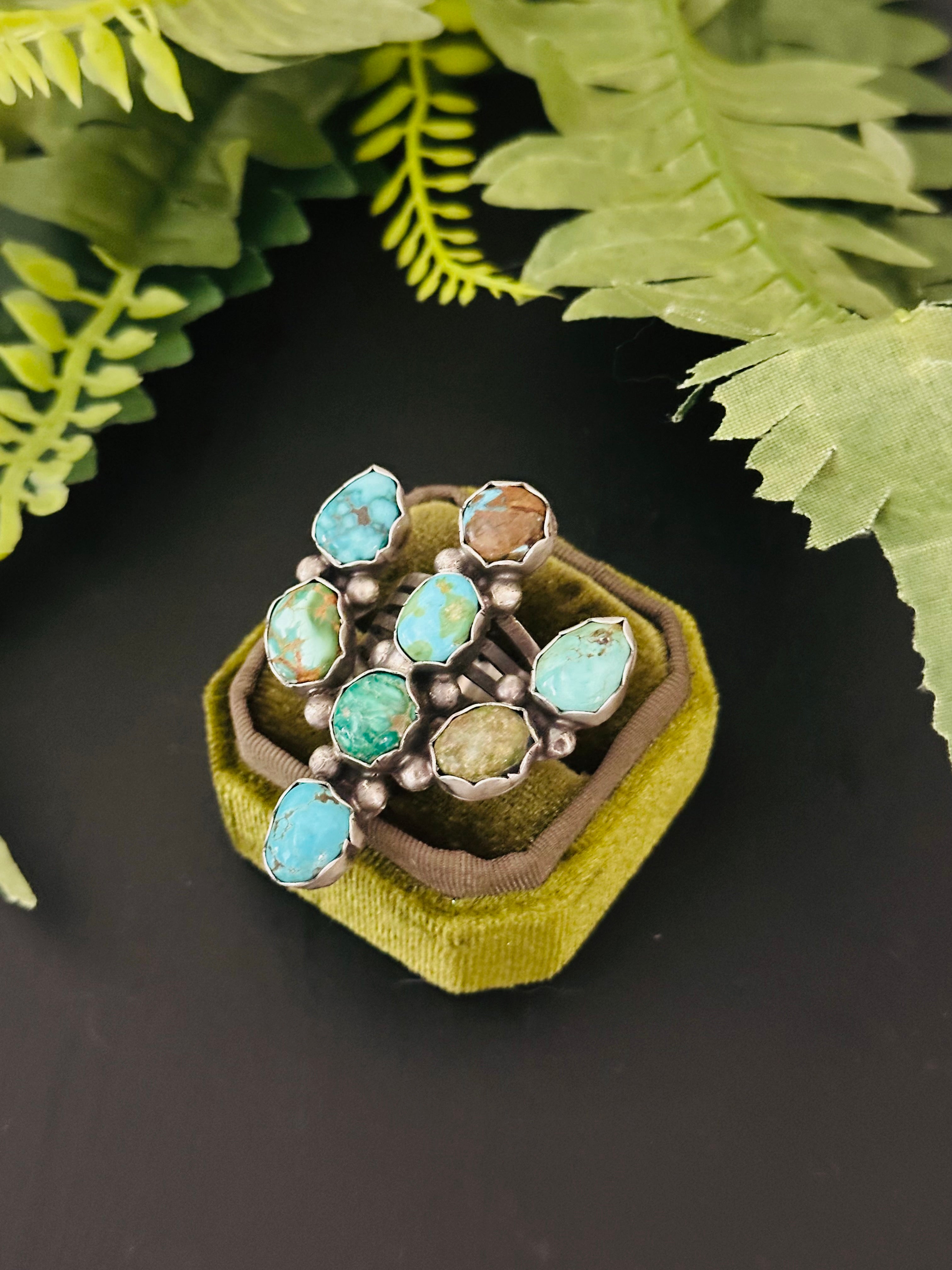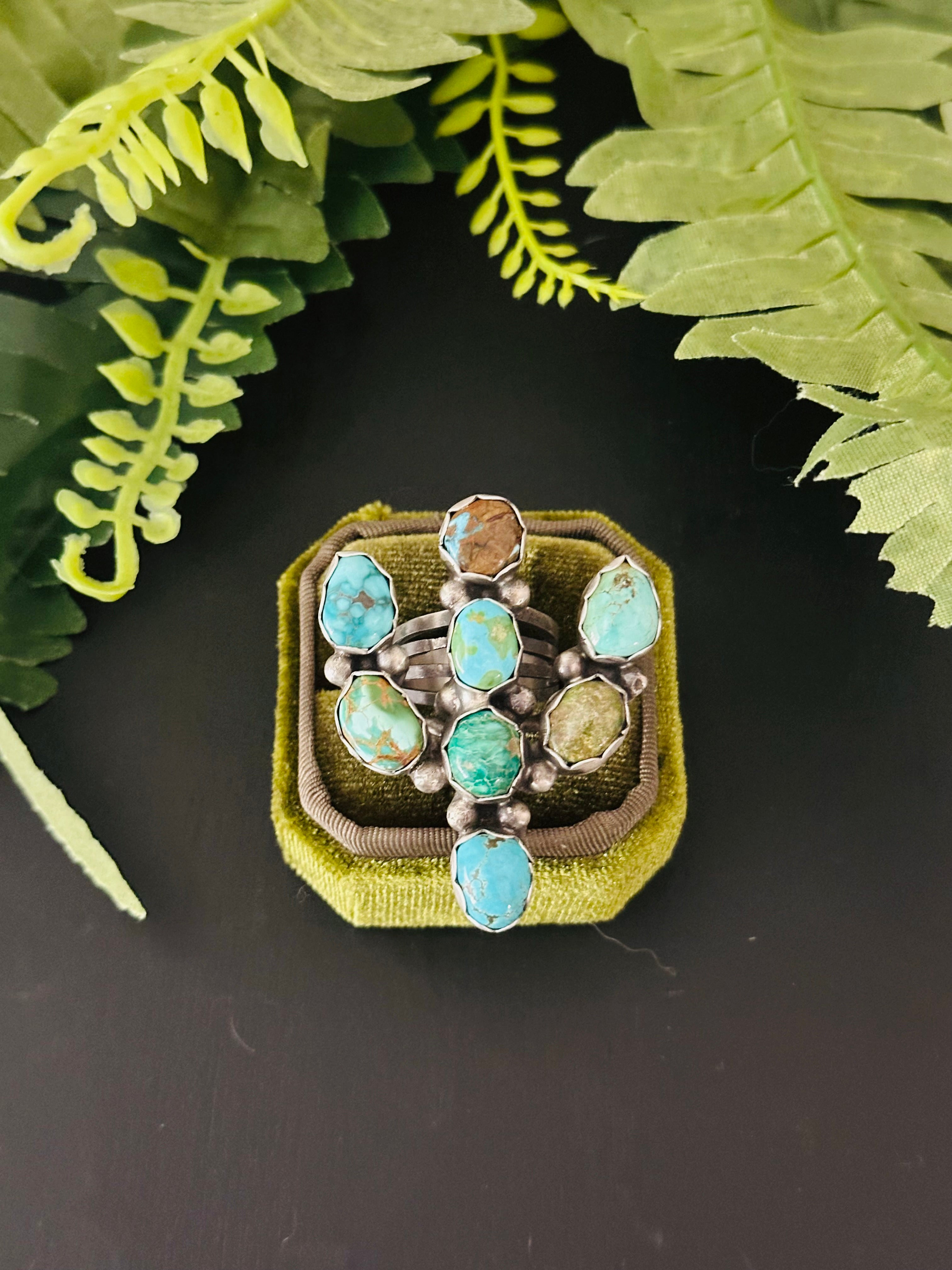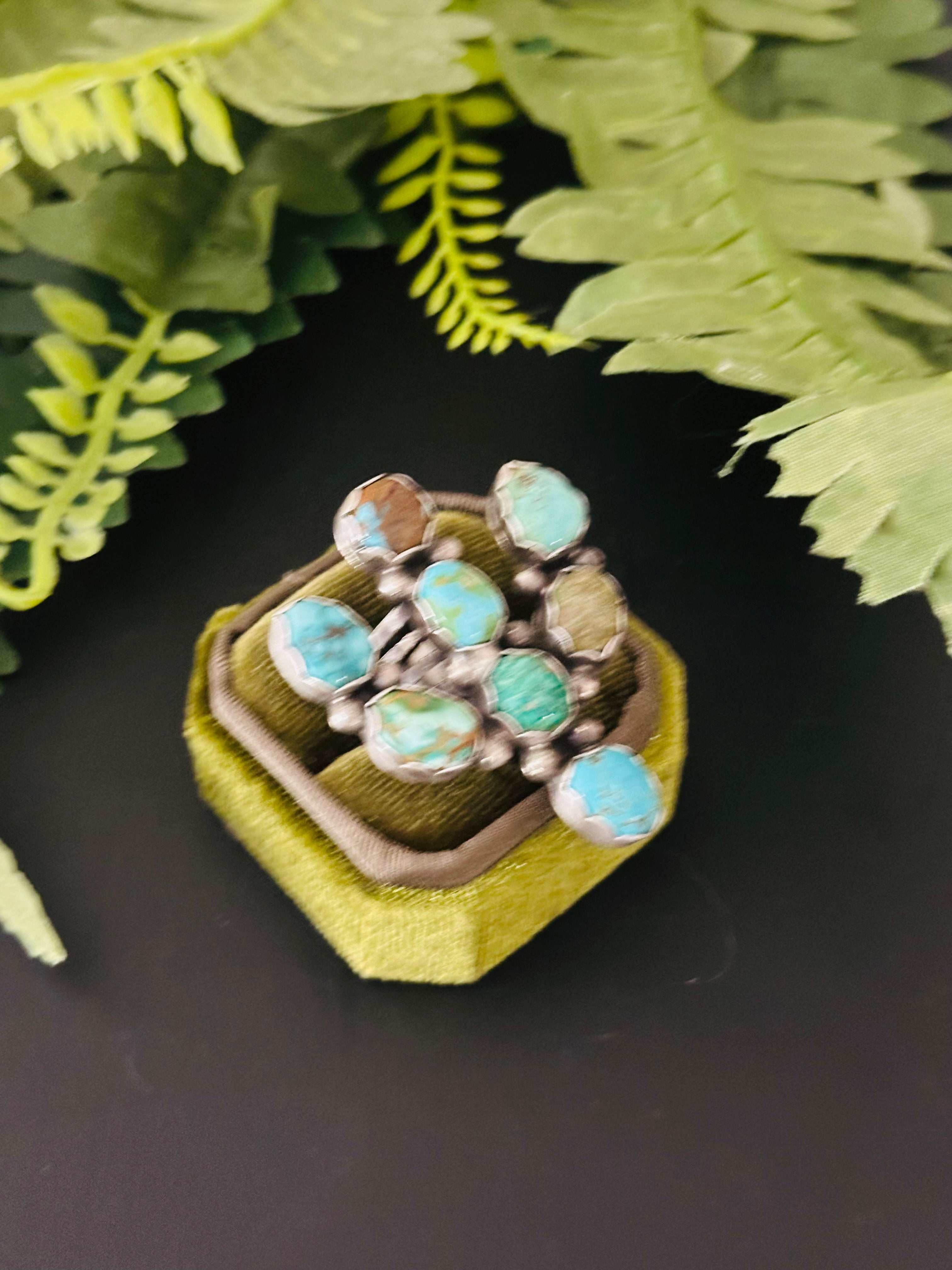 Beautiful ring. Lorenzo Juan Mixed Turquoise & Sterling Silver Adjustable Ring. It measures 1 7/8 inches long and 1 1/2 inches wide. Signed by the artist and stamped sterling silver.