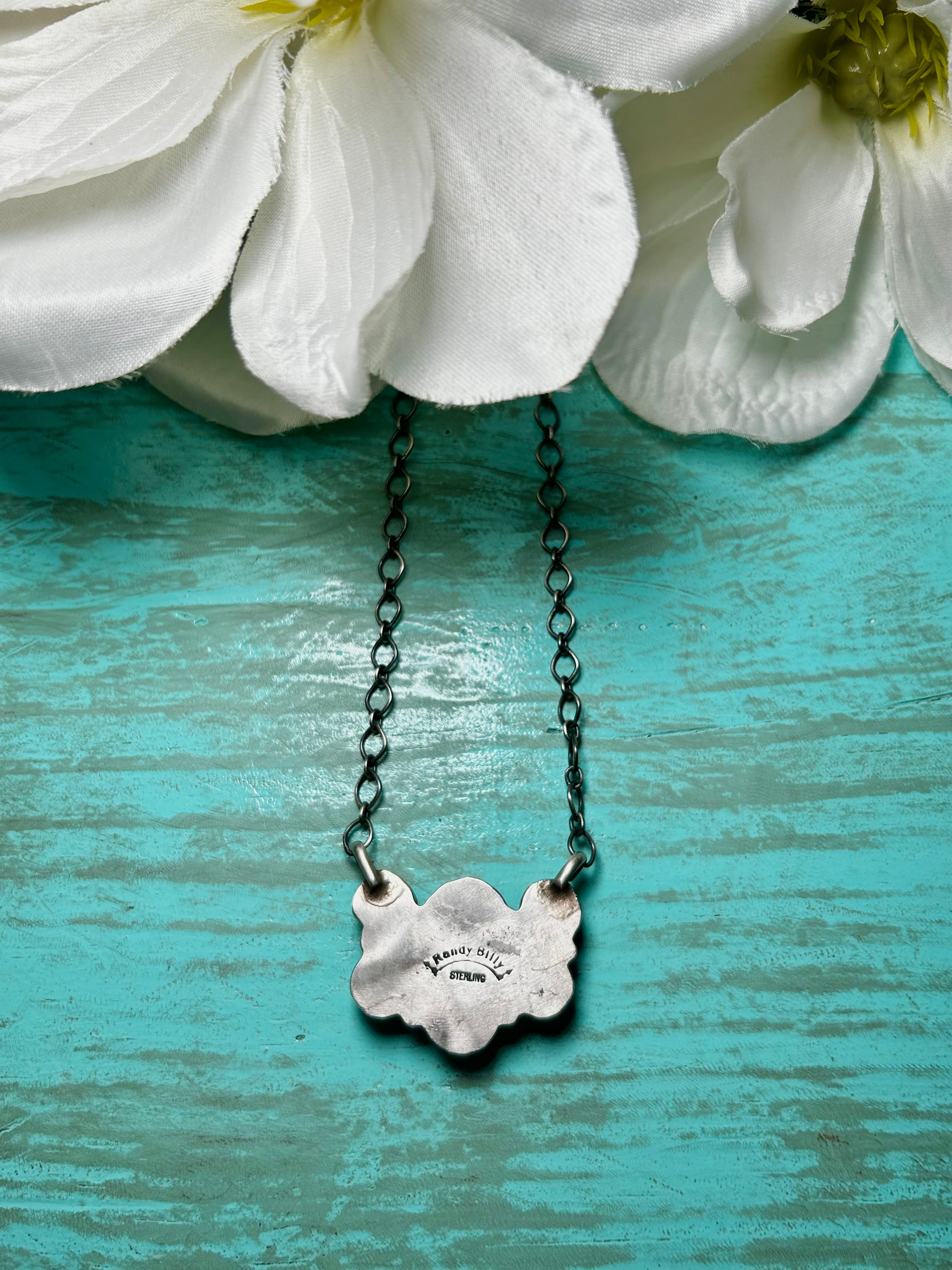 Navajo Made Blue Moon Turquoise & Sterling Sliver Necklace. It measures 20 inches long while the chain measure 18 inches long. Signed by the artist and stamped sterling silver.