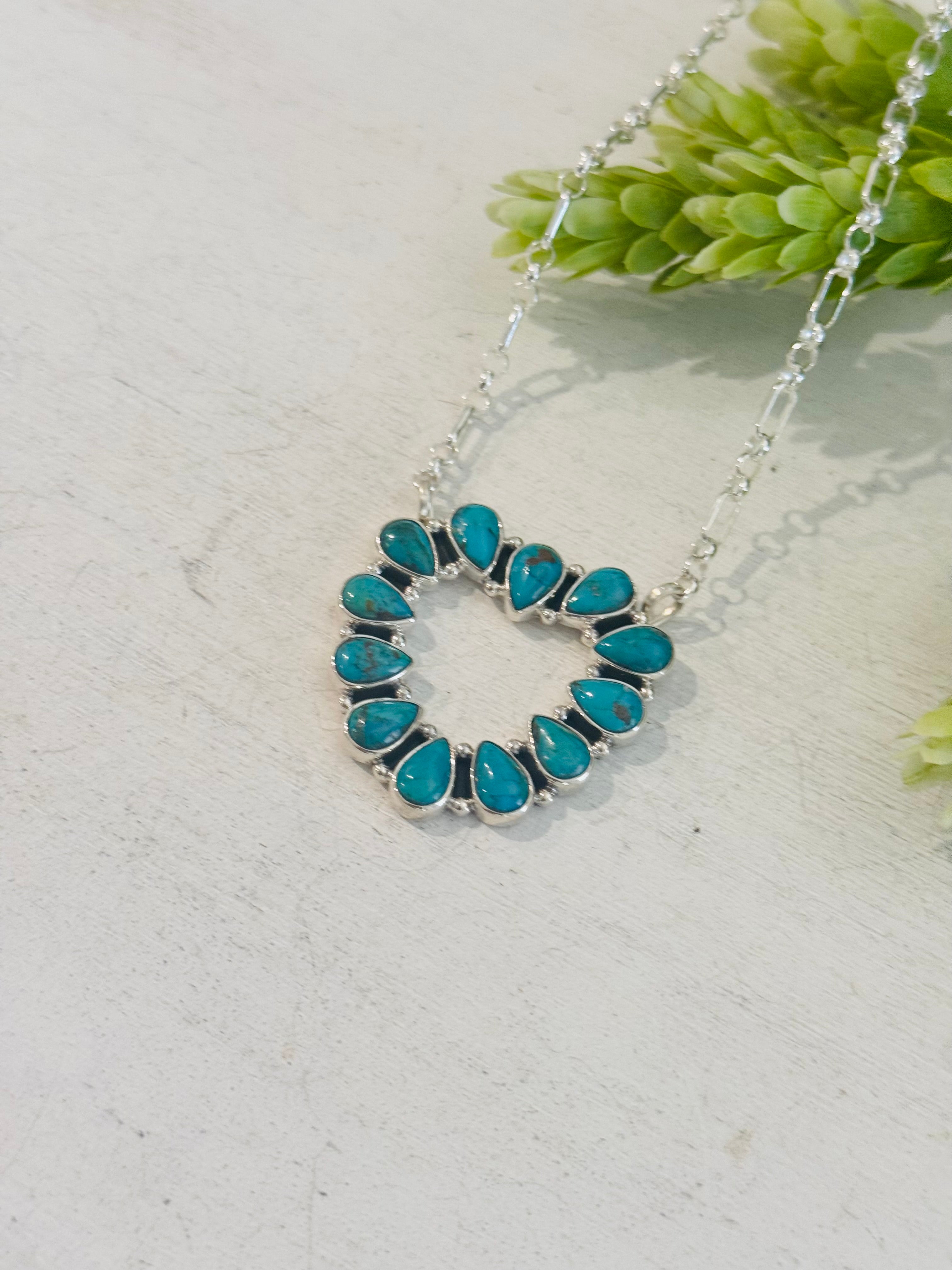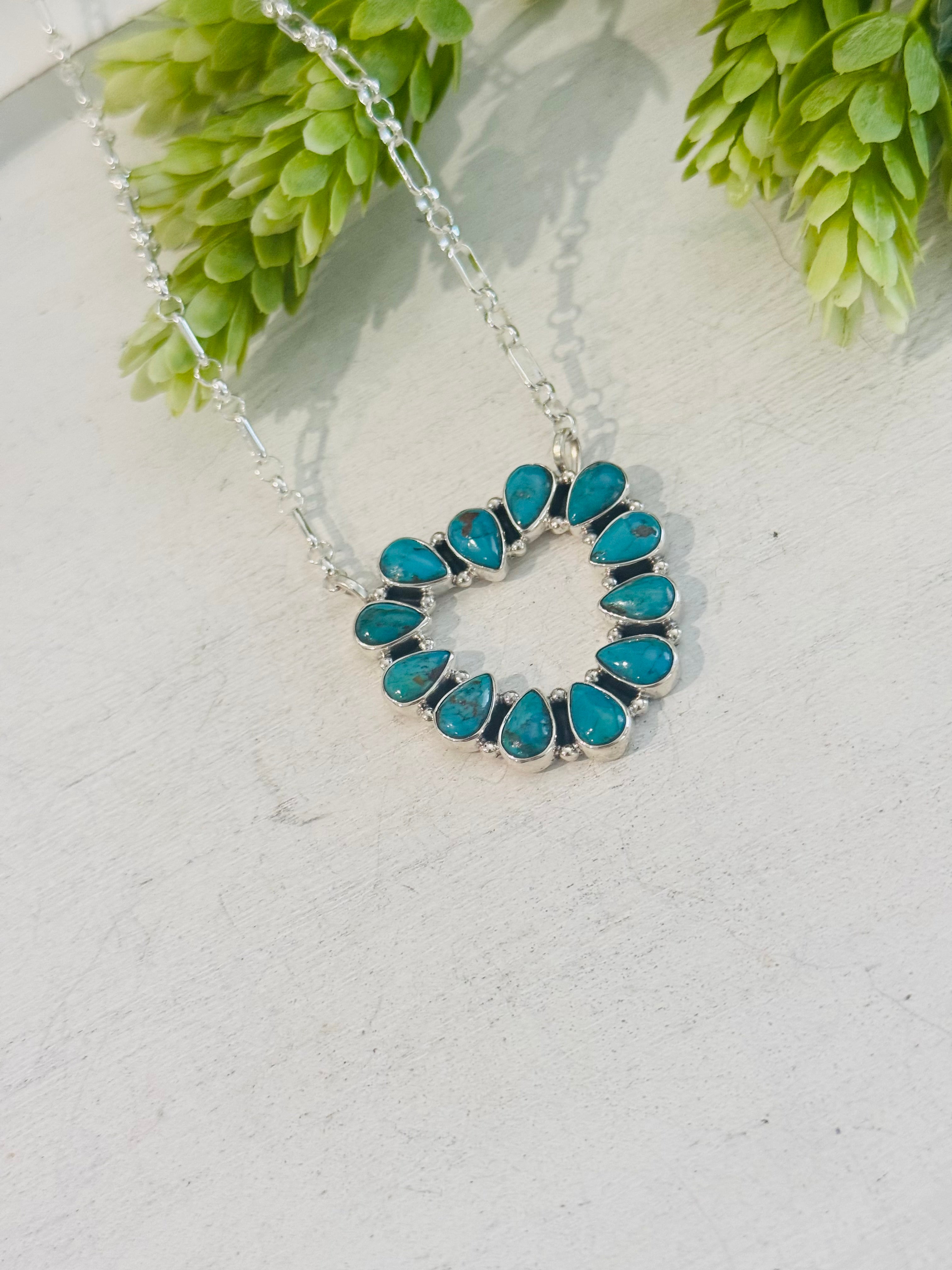 Southwest Made Turquoise & Sterling Sliver Necklace. It measures 20 1/2 inches long while the chain measure 18 inches long. Stones will differ due to natural stones.
