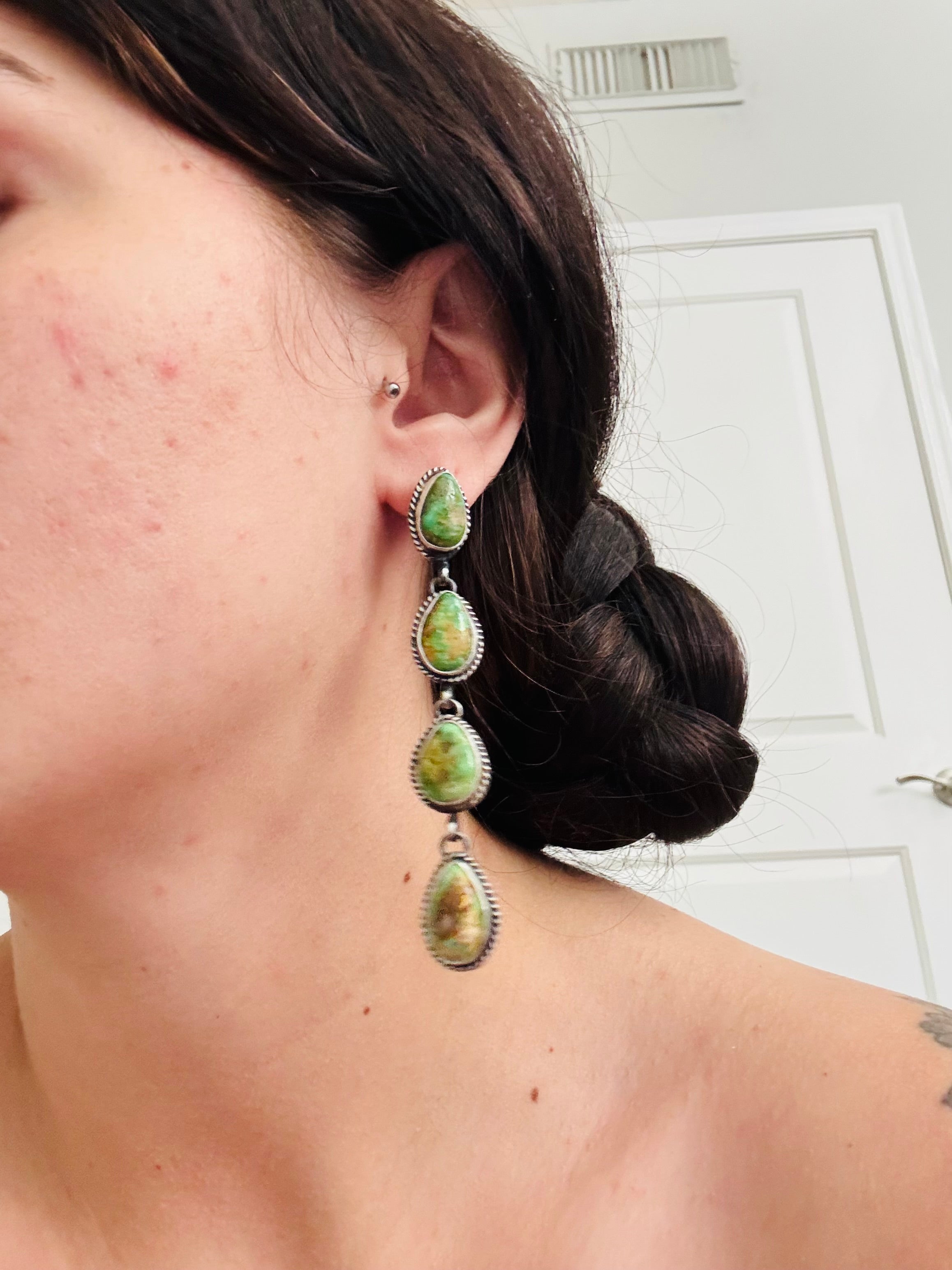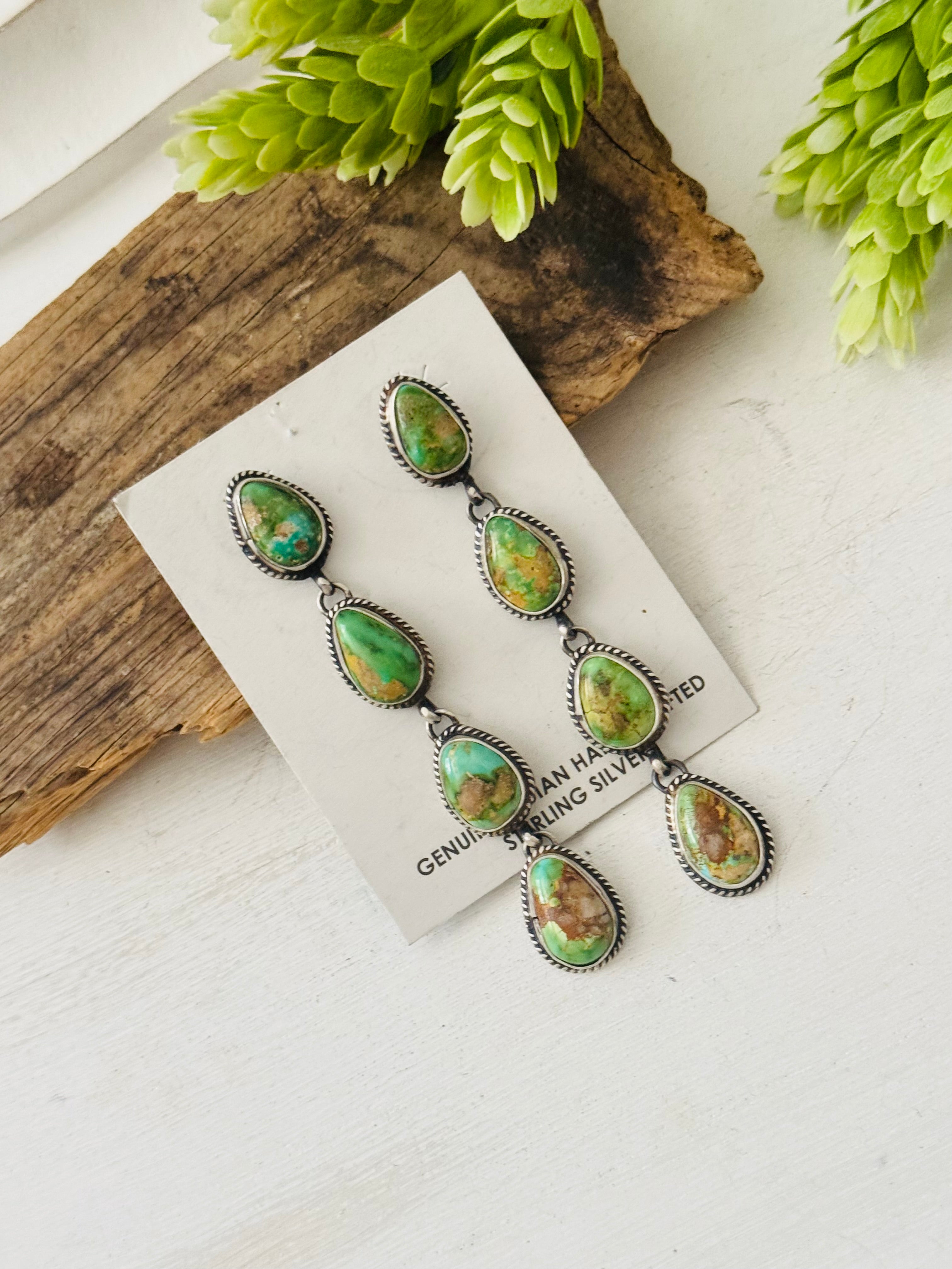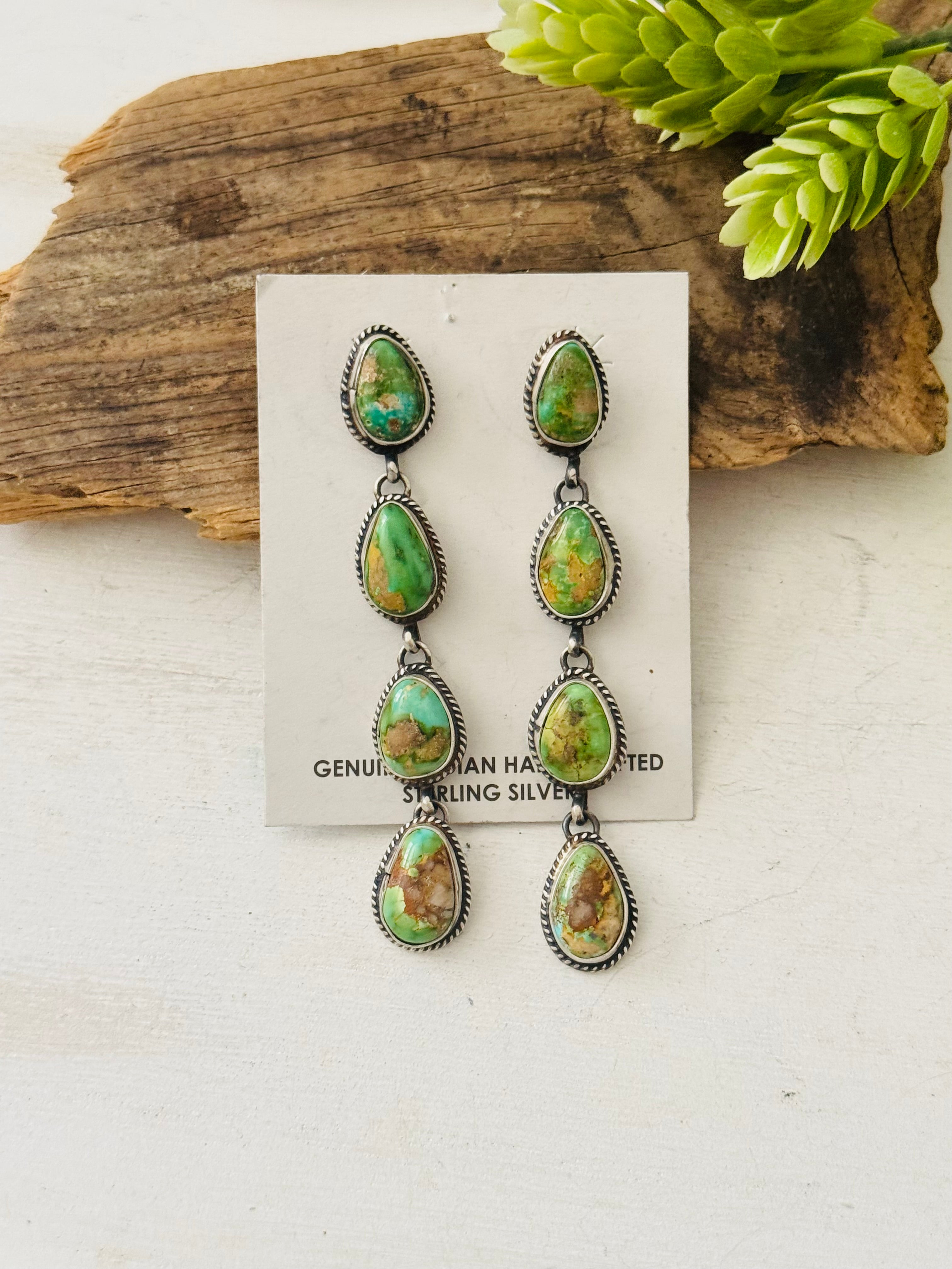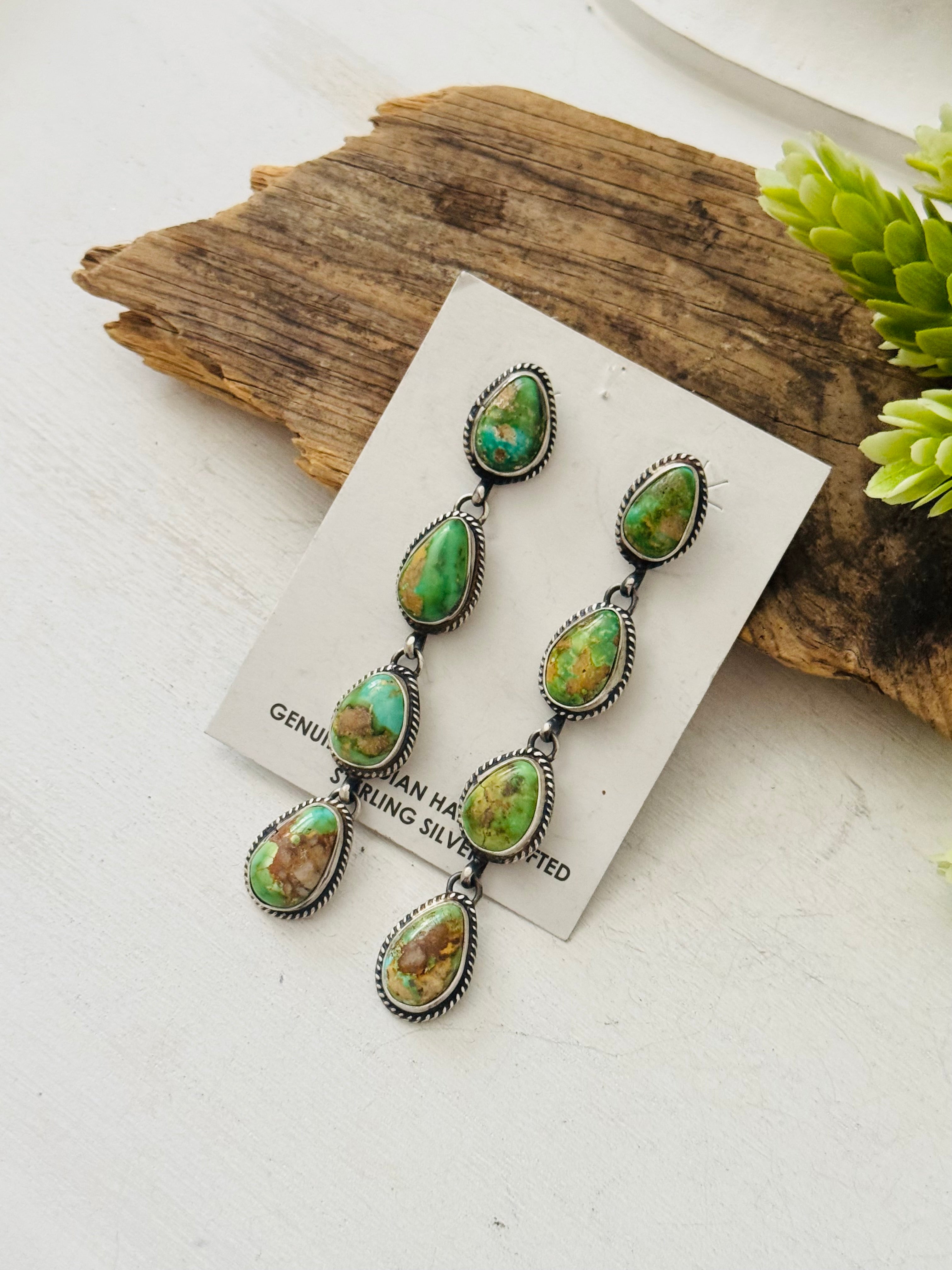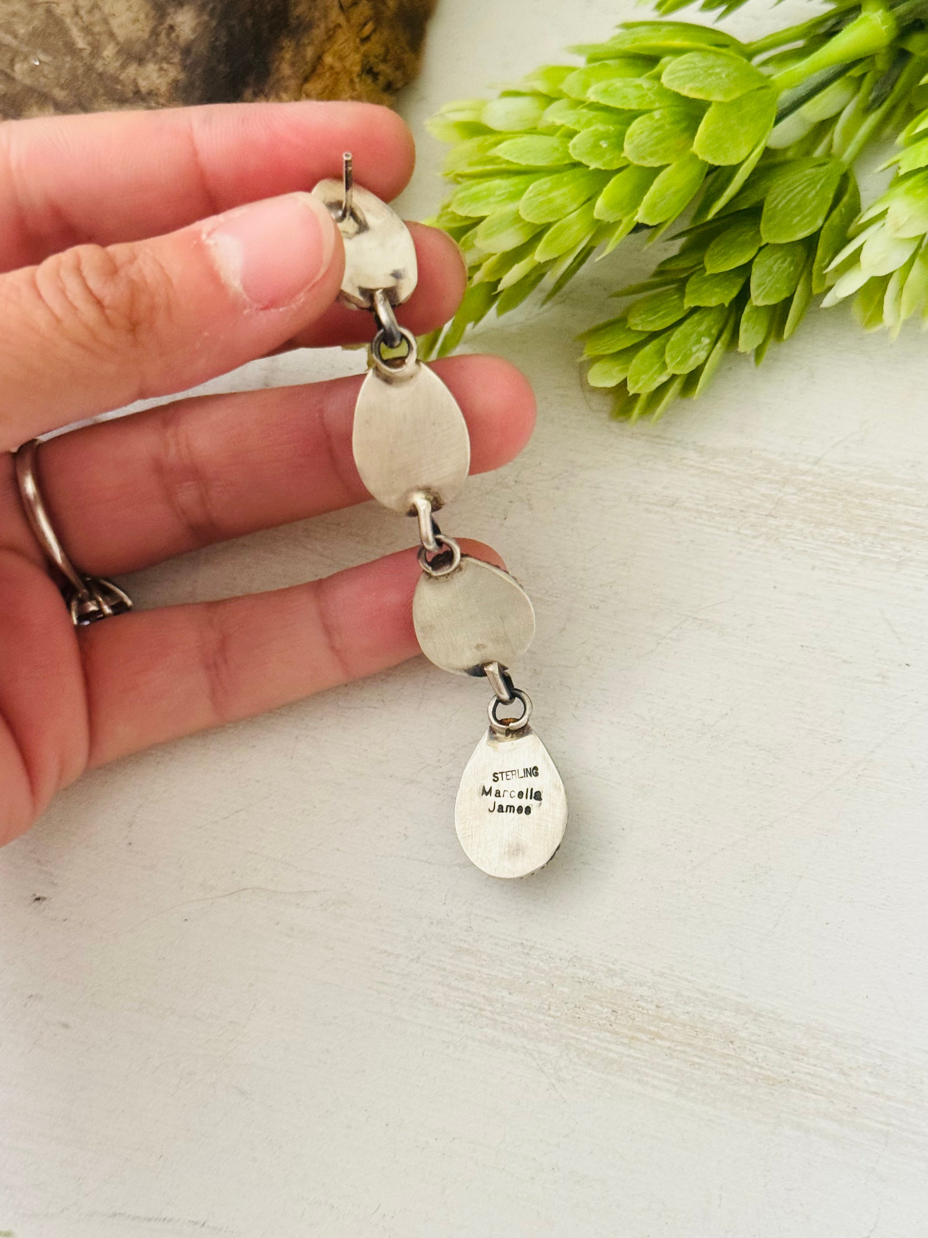 Marcella James Sonoran Gold Turquoise & Sterling Silver Post Dangle Earrings. They measure 3 1/2 inches long and 1/2 of an inch wide. Stamped sterling silver and signed by the artist.