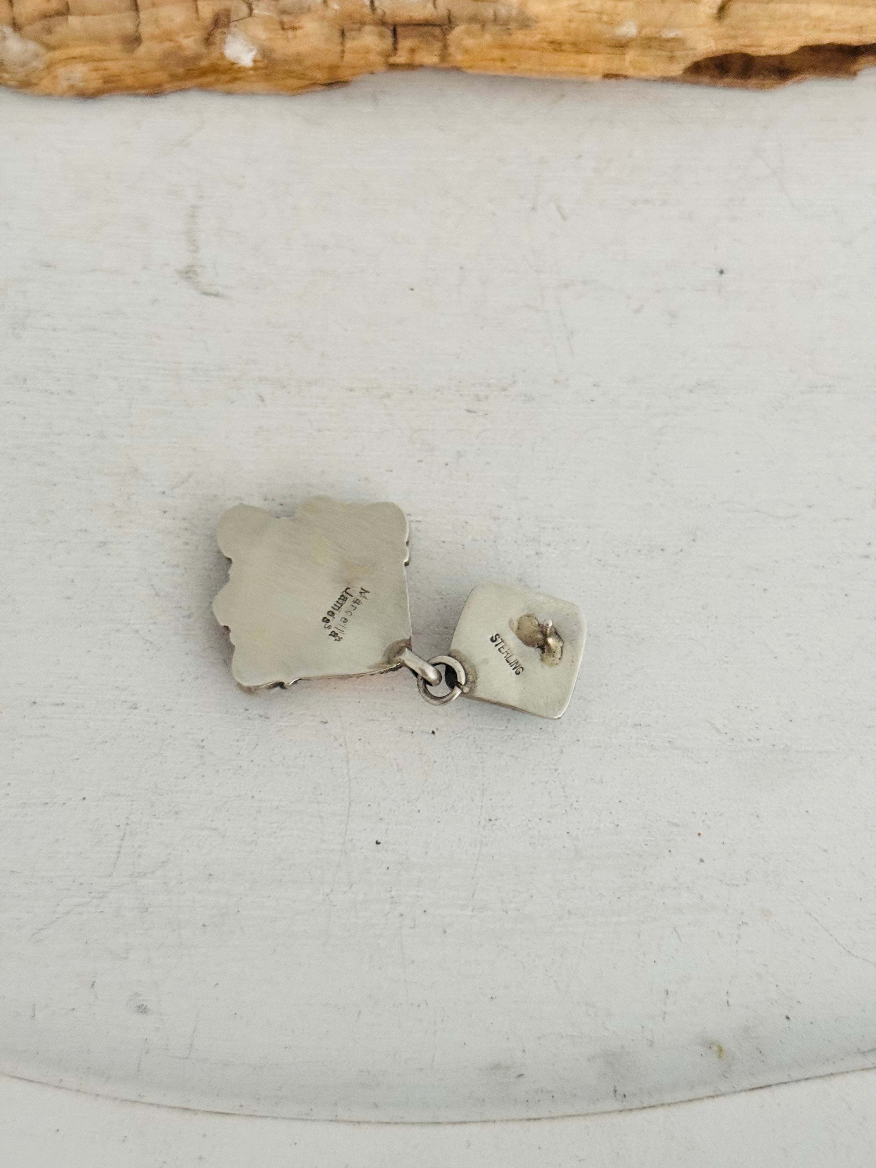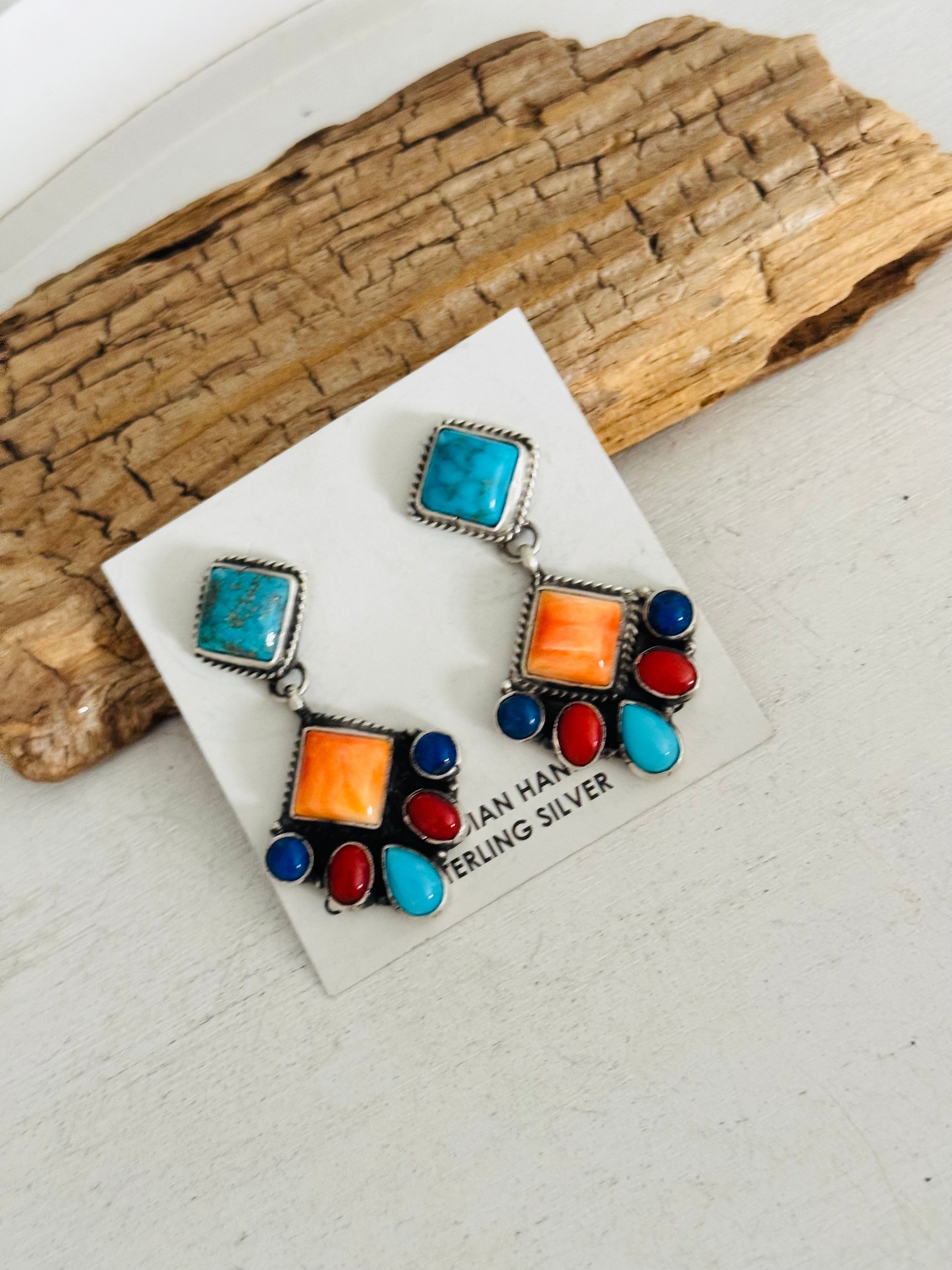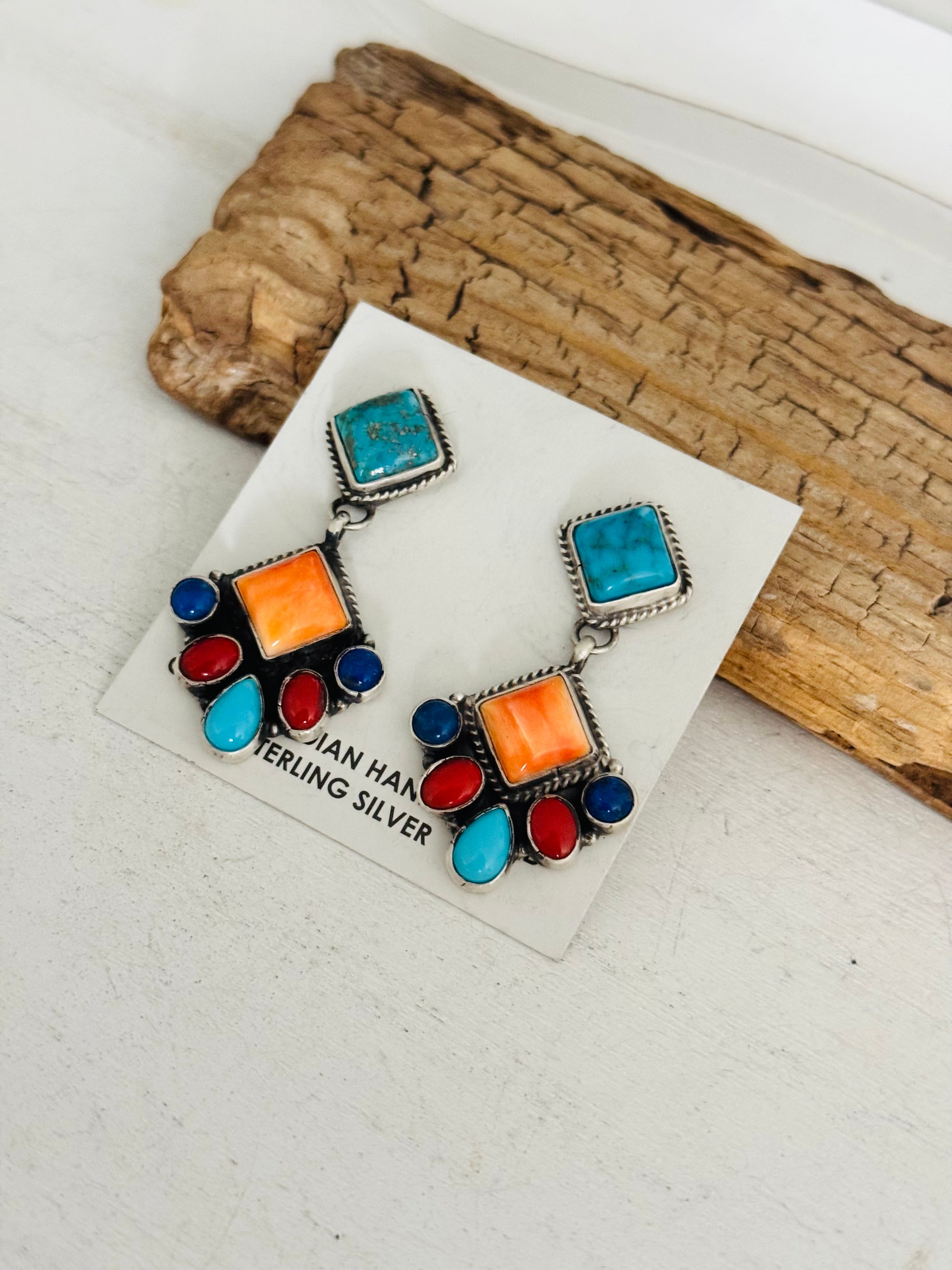 Marcella James Multi Stone & Sterling Silver Post Dangle Cluster Earrings. They measure 2 inches long and 1 1/8 inches wide. Stamped sterling silver and signed by the artist.